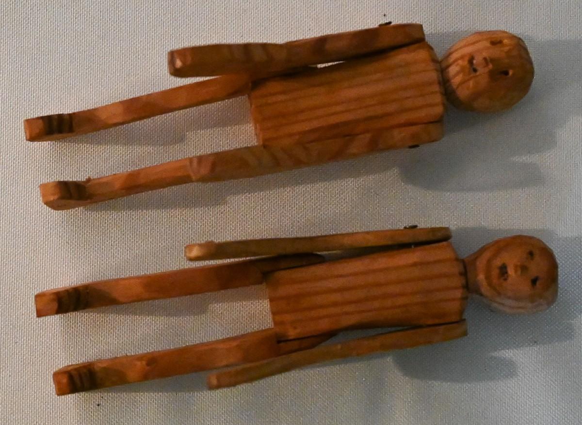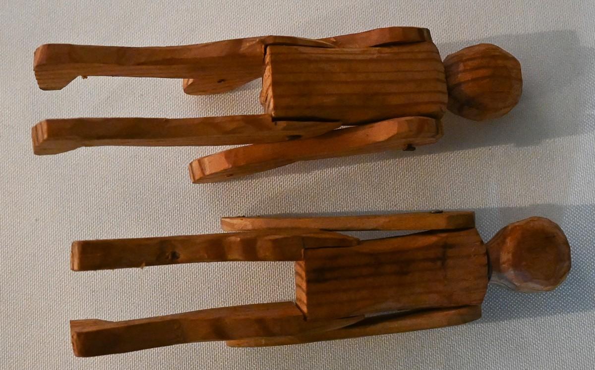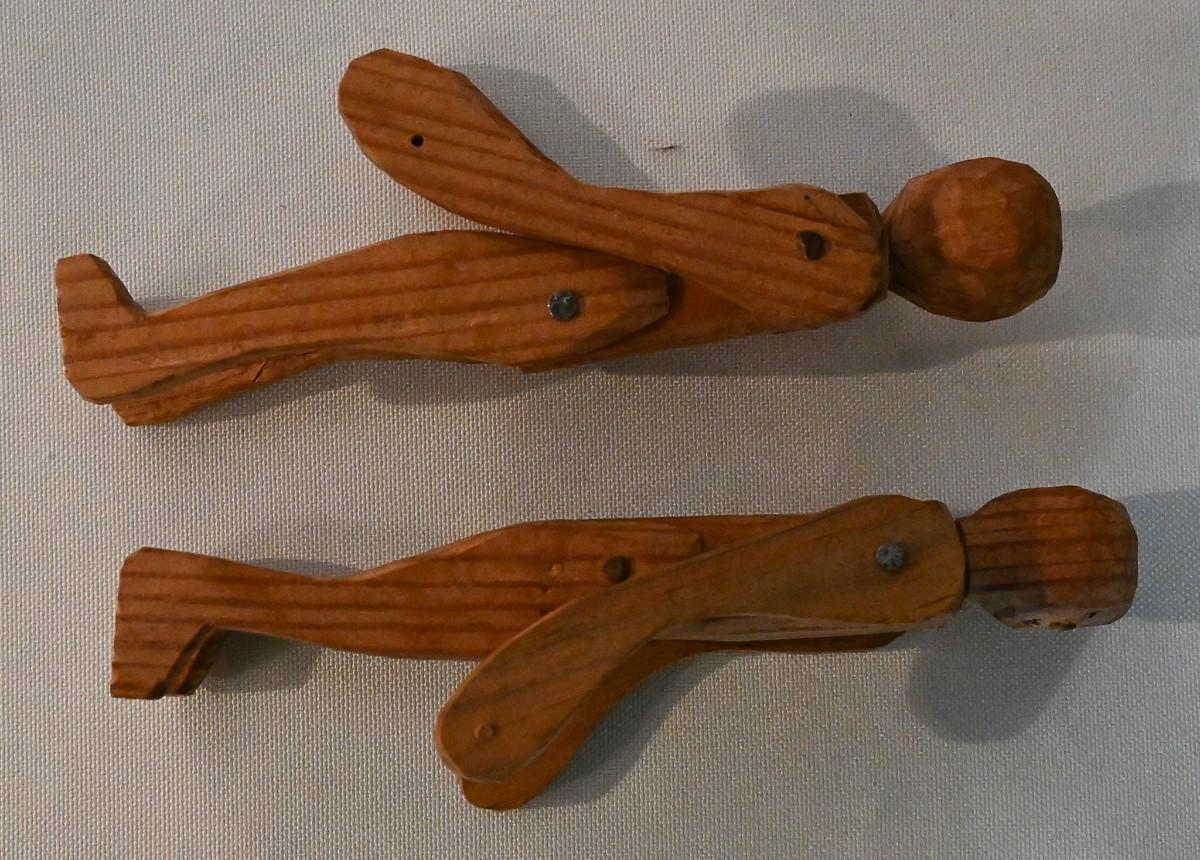 A pair of man sculptures by an unknown artist. Wood. Each is approx. 5.5" x 1.5" x 1.5".