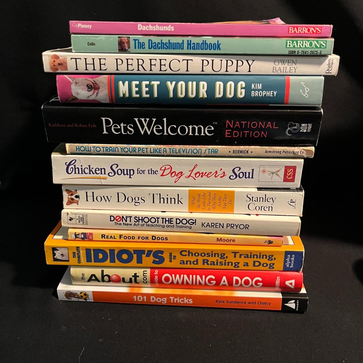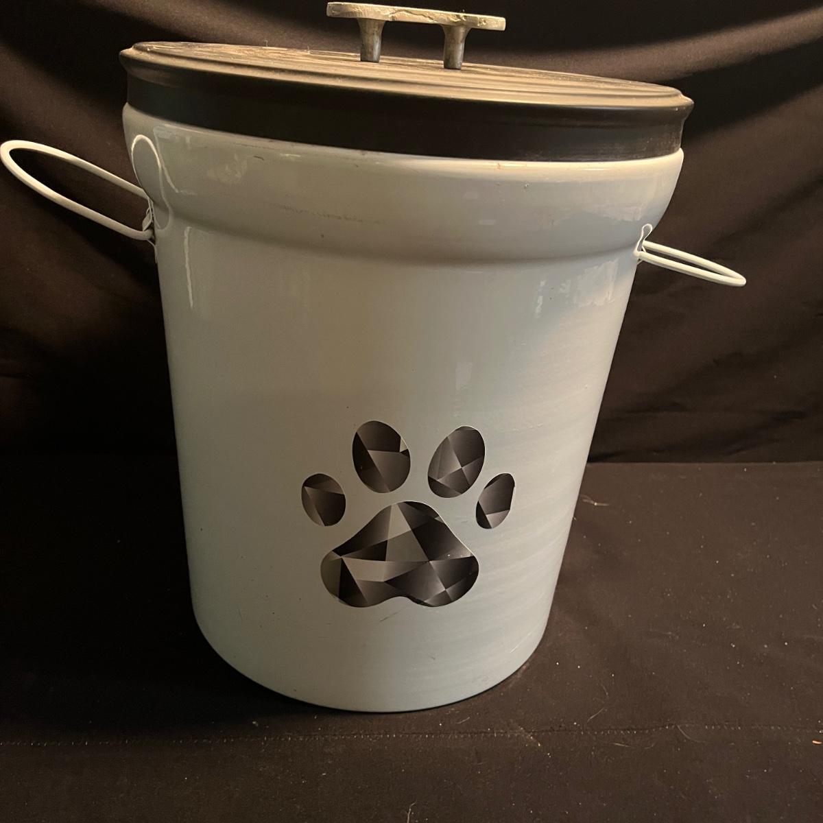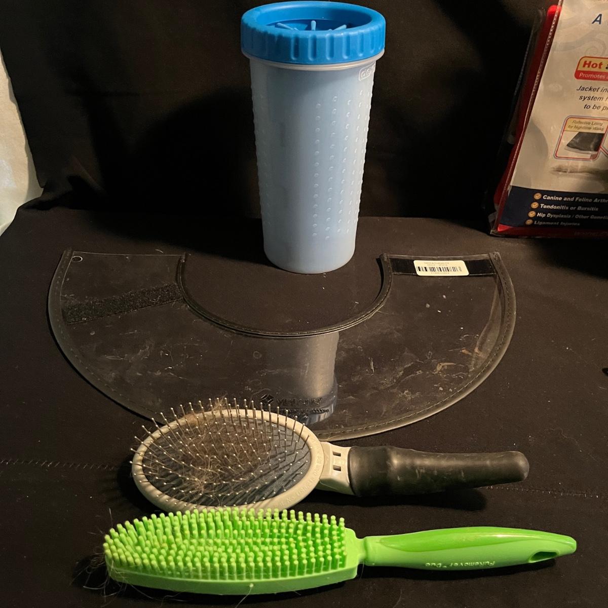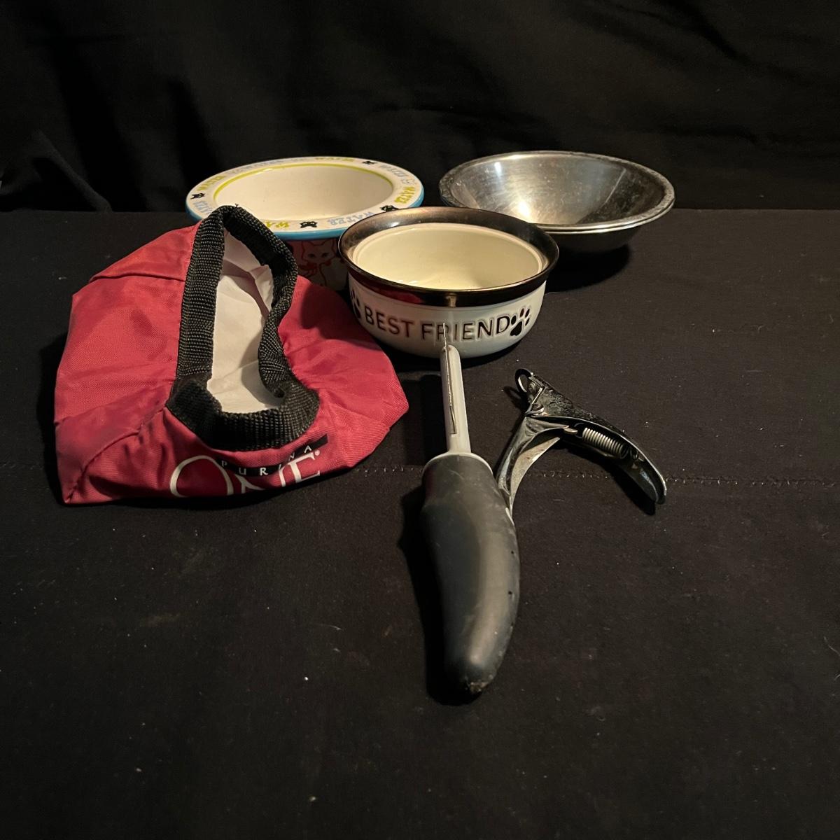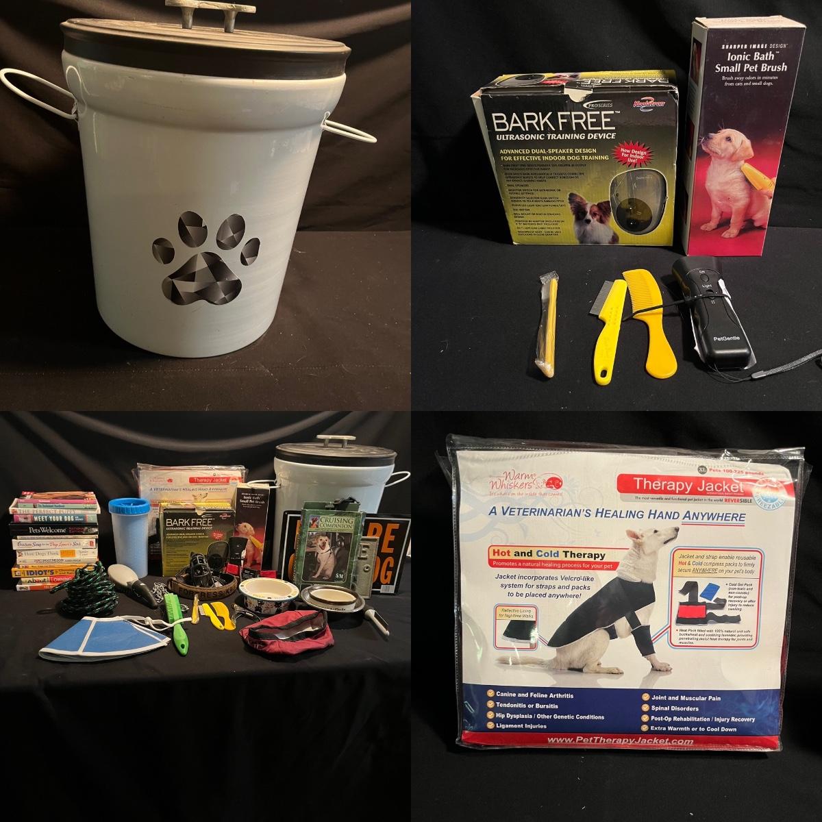 Lot includes bark collars, metal 5-gallon dog food container, brushes, therapy blanket, ceramic and stainless-steel bowls, cast iron beware of dog sign, books on dogs and more.