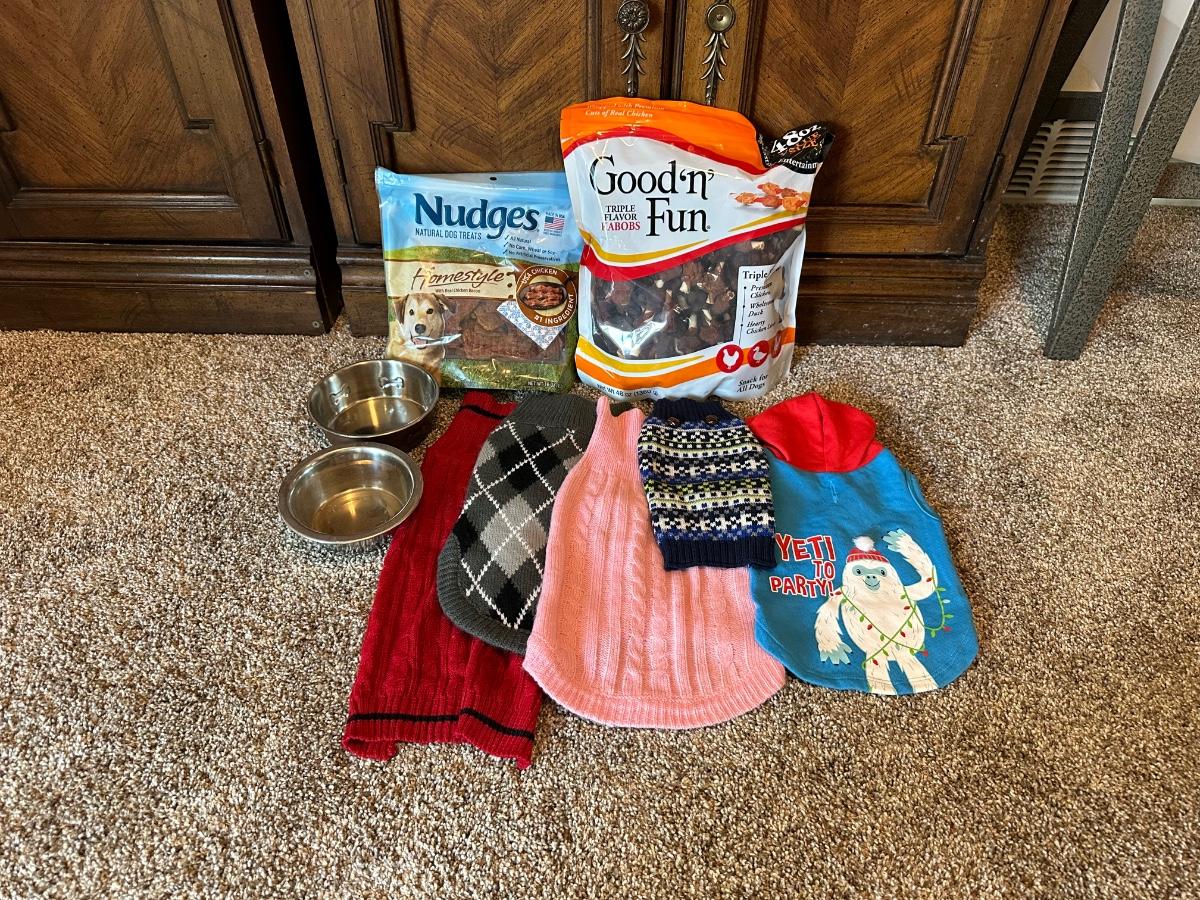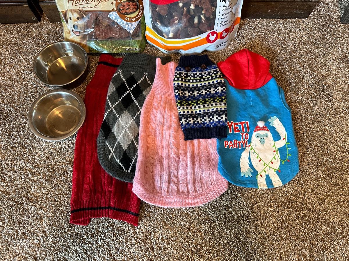 DOG TREATS, SMALL & MED SWEATERS, FEEDING BOWL