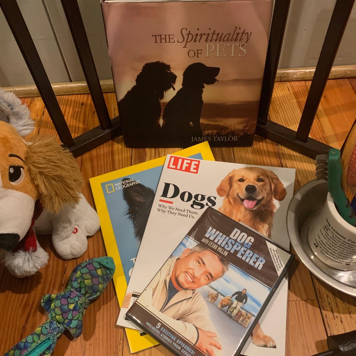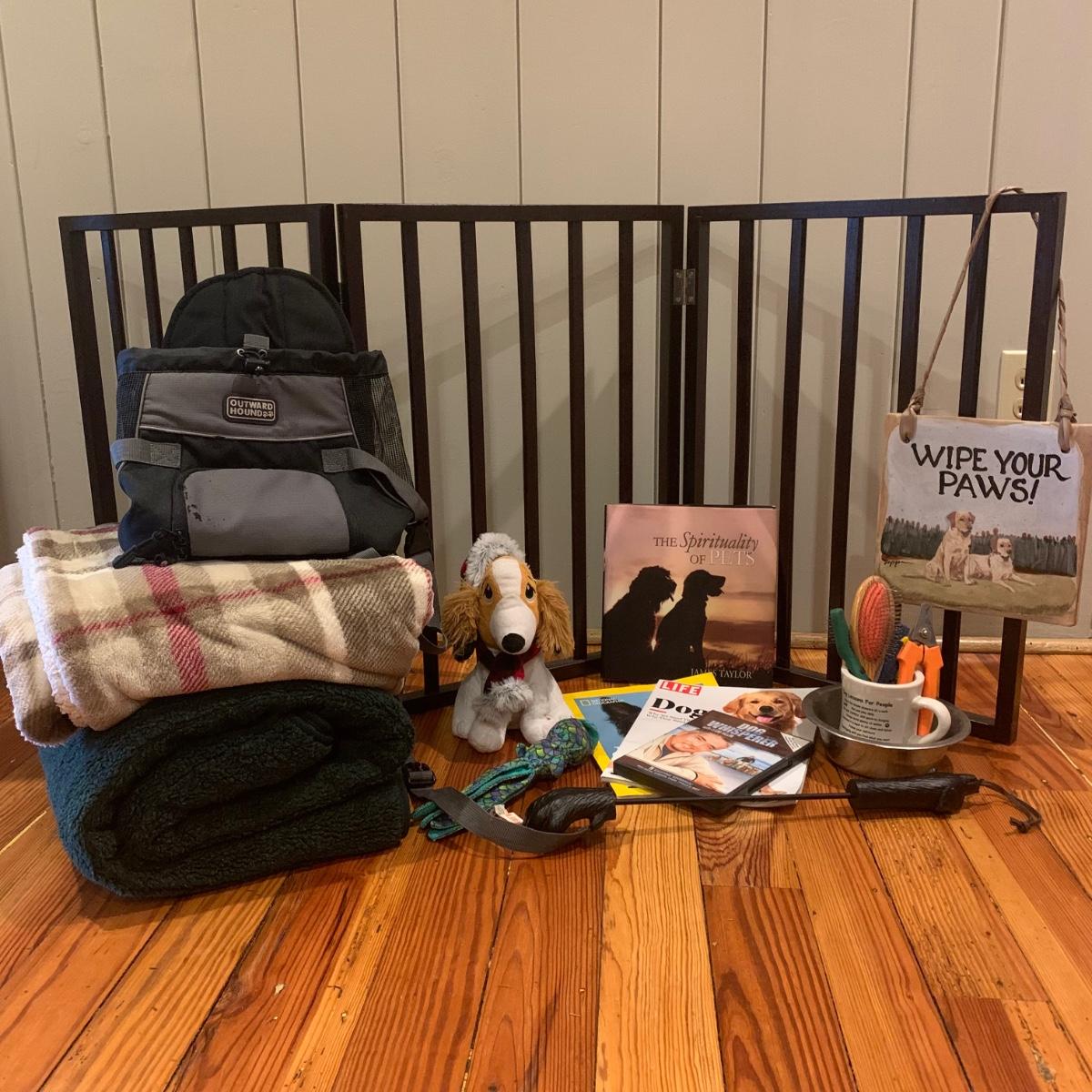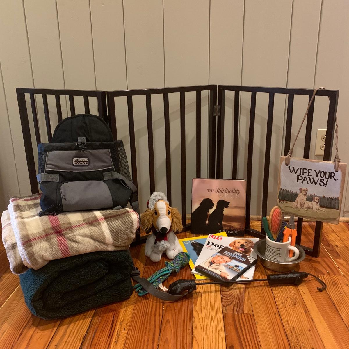Doggy care kit, perfect for dog lovers and their pets. This lot includes: “Dog Lessons for People” mug, dog nail trimmers, flea comb, dog brush, bowl, and undercoat blade. Books and Magazines: National Geographic, “The Genius of Dogs”, LIFE Magazine “DOGS”, and “The Spirituality of Pets” by James Taylor. There is also a ceramic “WIPE YOUR PAWS” sign, doggy back scratcher, Outward Hound backpack (for dog owner), and two toys. Lot also includes two blankets, one of which is an LL. Bean dog blanket. And lastly, a wooden folding three panel dog gate. It measures, 54”L x 1”W x 24”H.