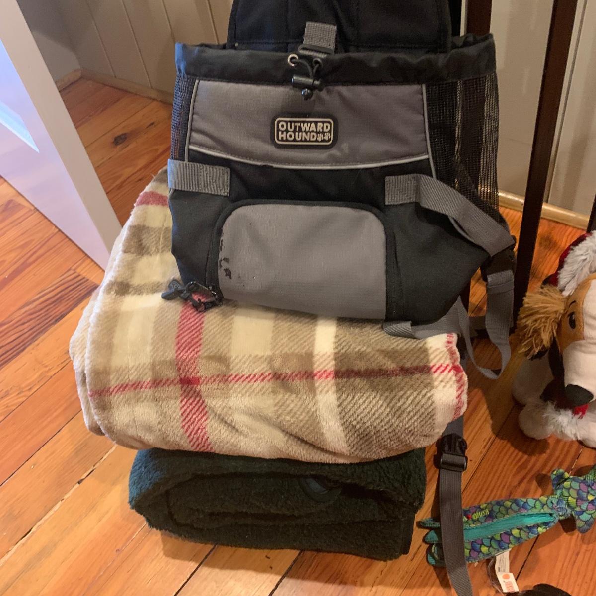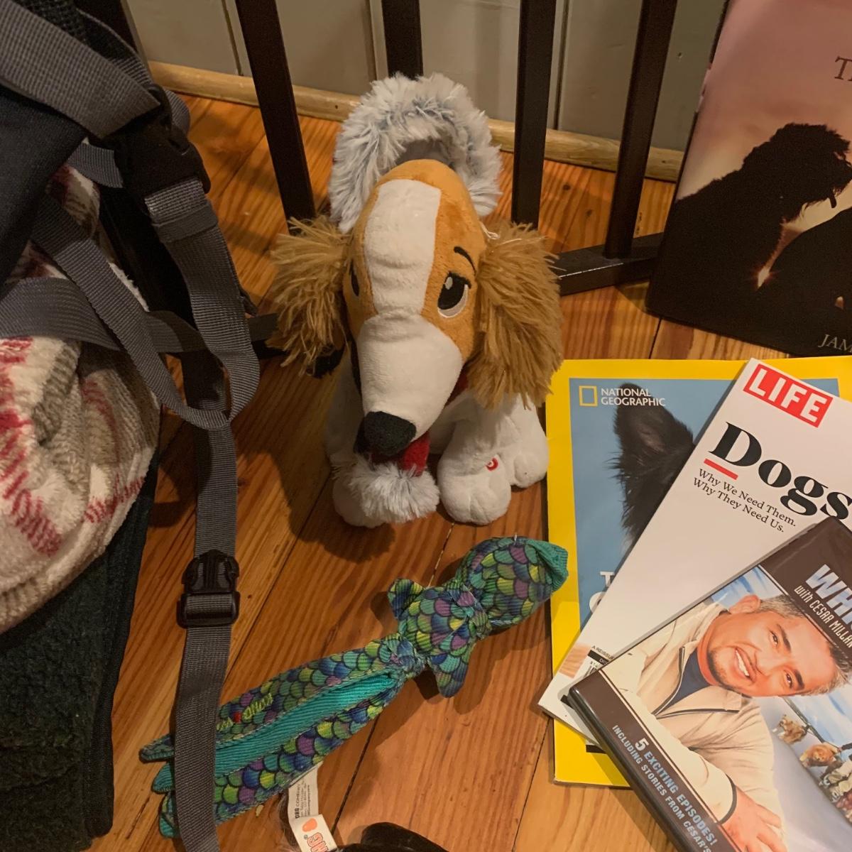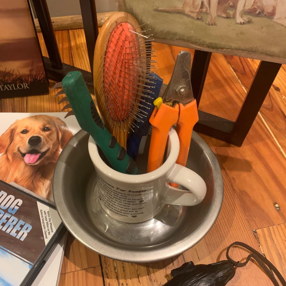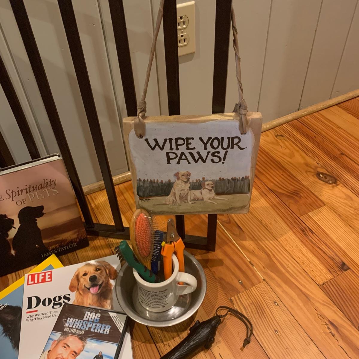Doggy care kit, perfect for dog lovers and their pets. This lot includes: “Dog Lessons for People” mug, dog nail trimmers, flea comb, dog brush, bowl, and undercoat blade. Books and Magazines: National Geographic, “The Genius of Dogs”, LIFE Magazine “DOGS”, and “The Spirituality of Pets” by James Taylor. There is also a ceramic “WIPE YOUR PAWS” sign, doggy back scratcher, Outward Hound backpack (for dog owner), and two toys. Lot also includes two blankets, one of which is an LL. Bean dog blanket. And lastly, a wooden folding three panel dog gate. It measures, 54”L x 1”W x 24”H.