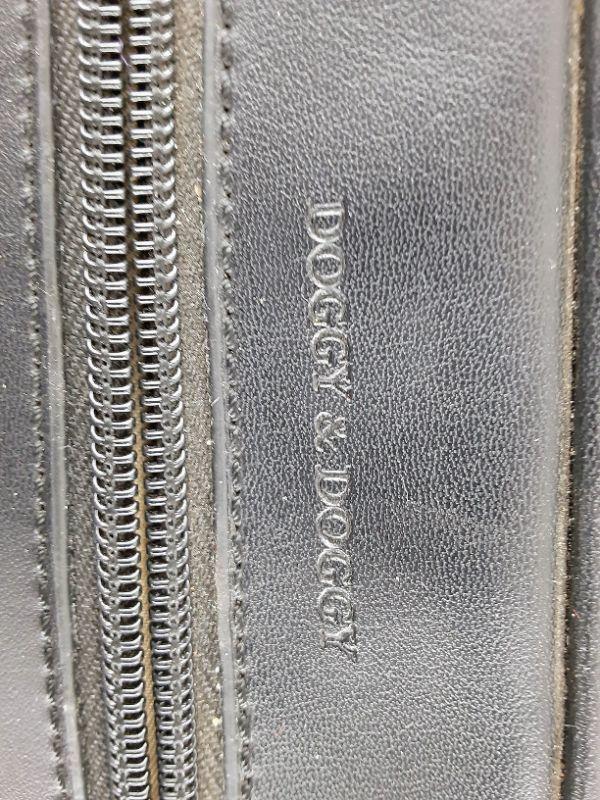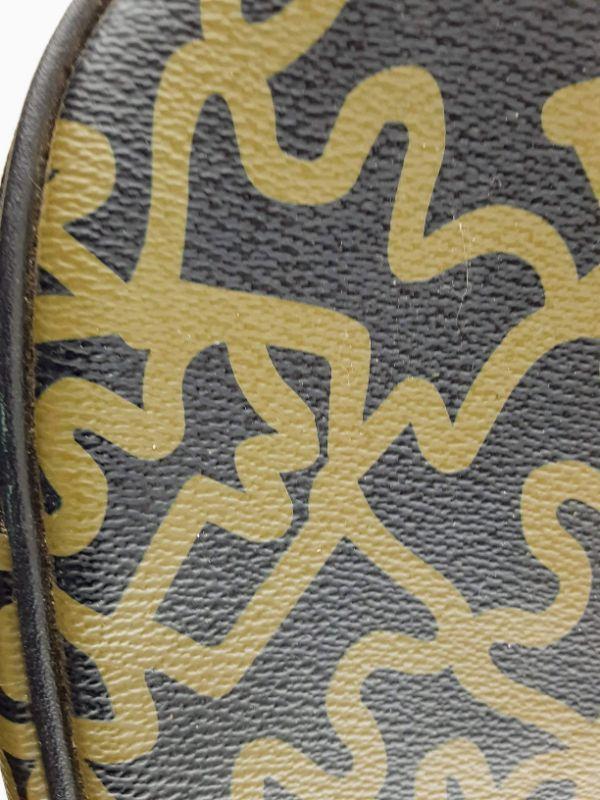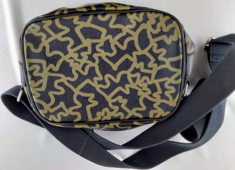 Olive green on black dog pattern with a fun vinyl purse. Measures 10in across and 7in. tall. Adjustable strap and 1in. thick.