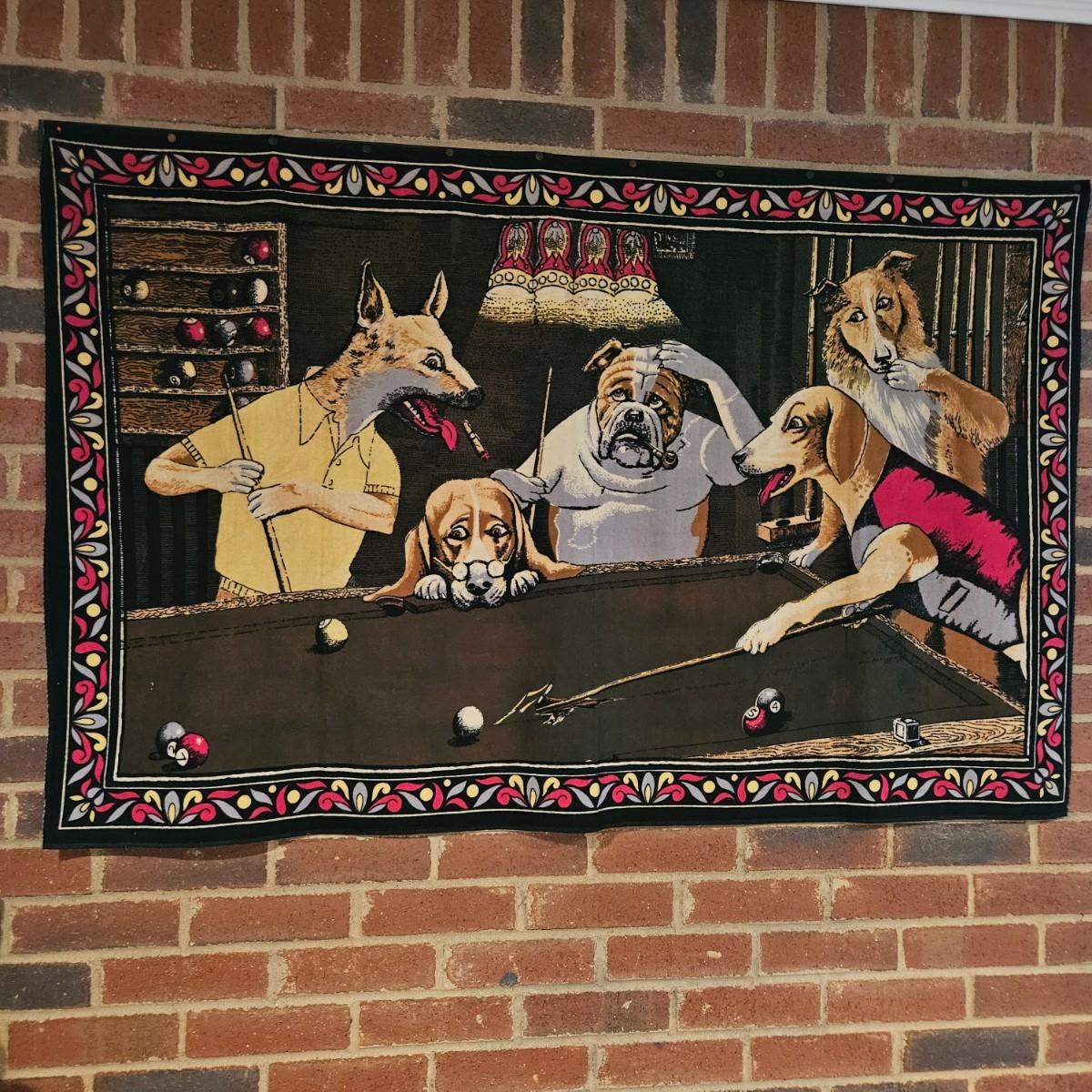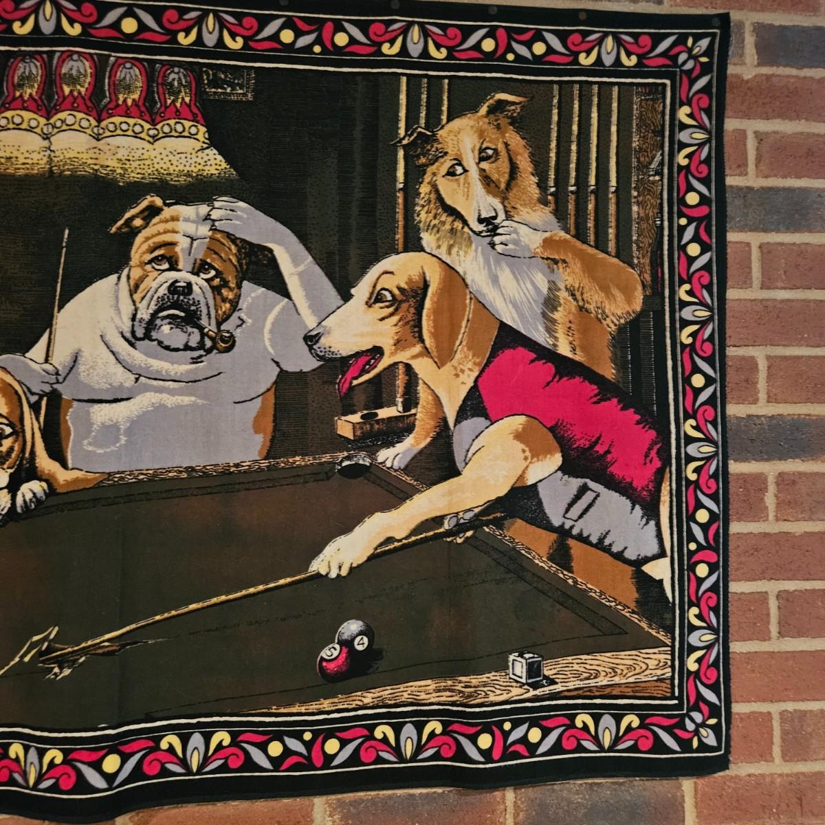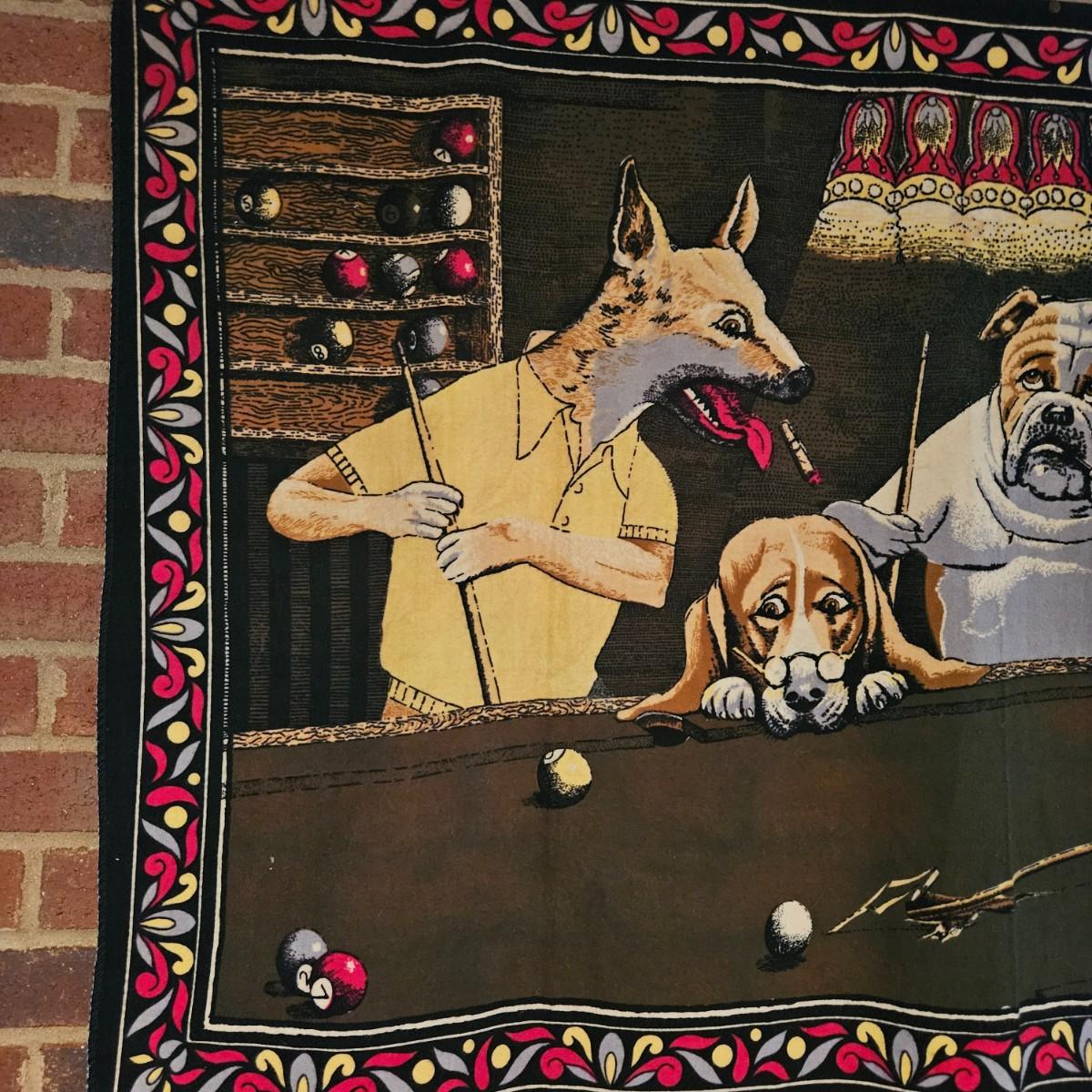 A wall tapestry depicting dogs playing pool that is made of a velvet type material. It measures approximately 54" x 34". Shipping available