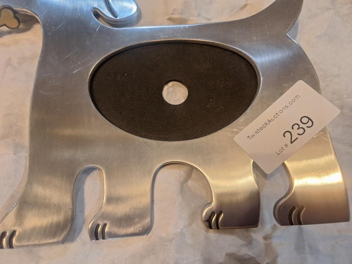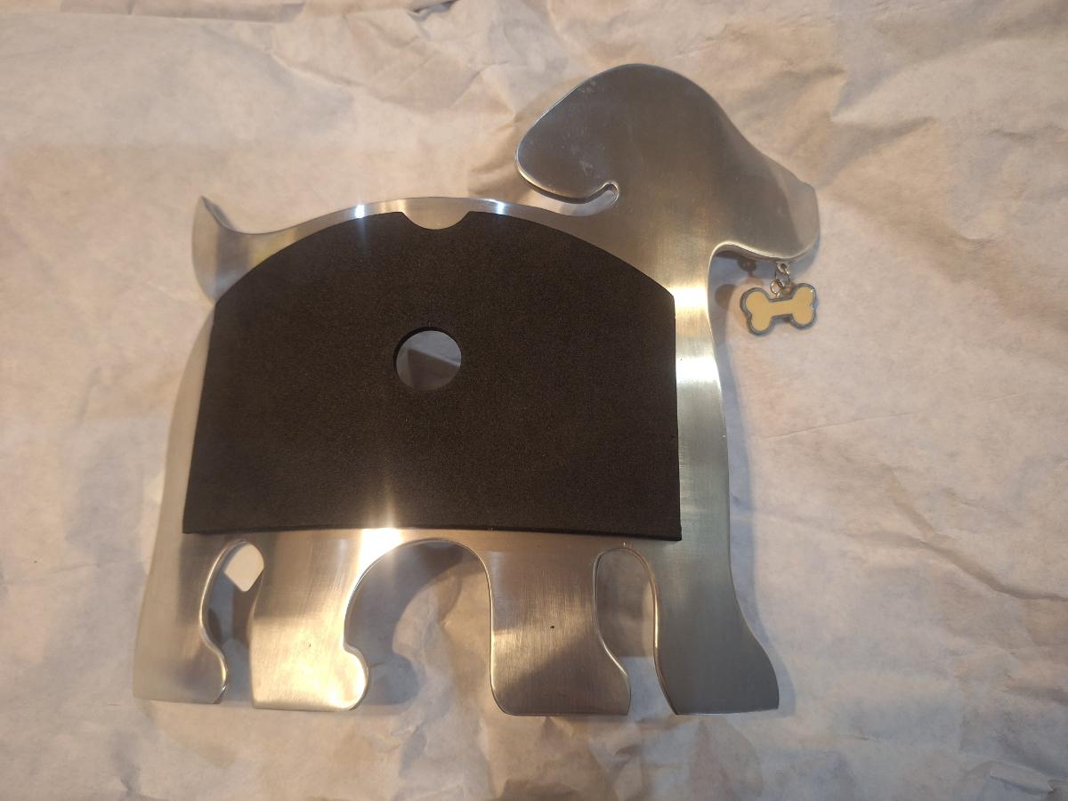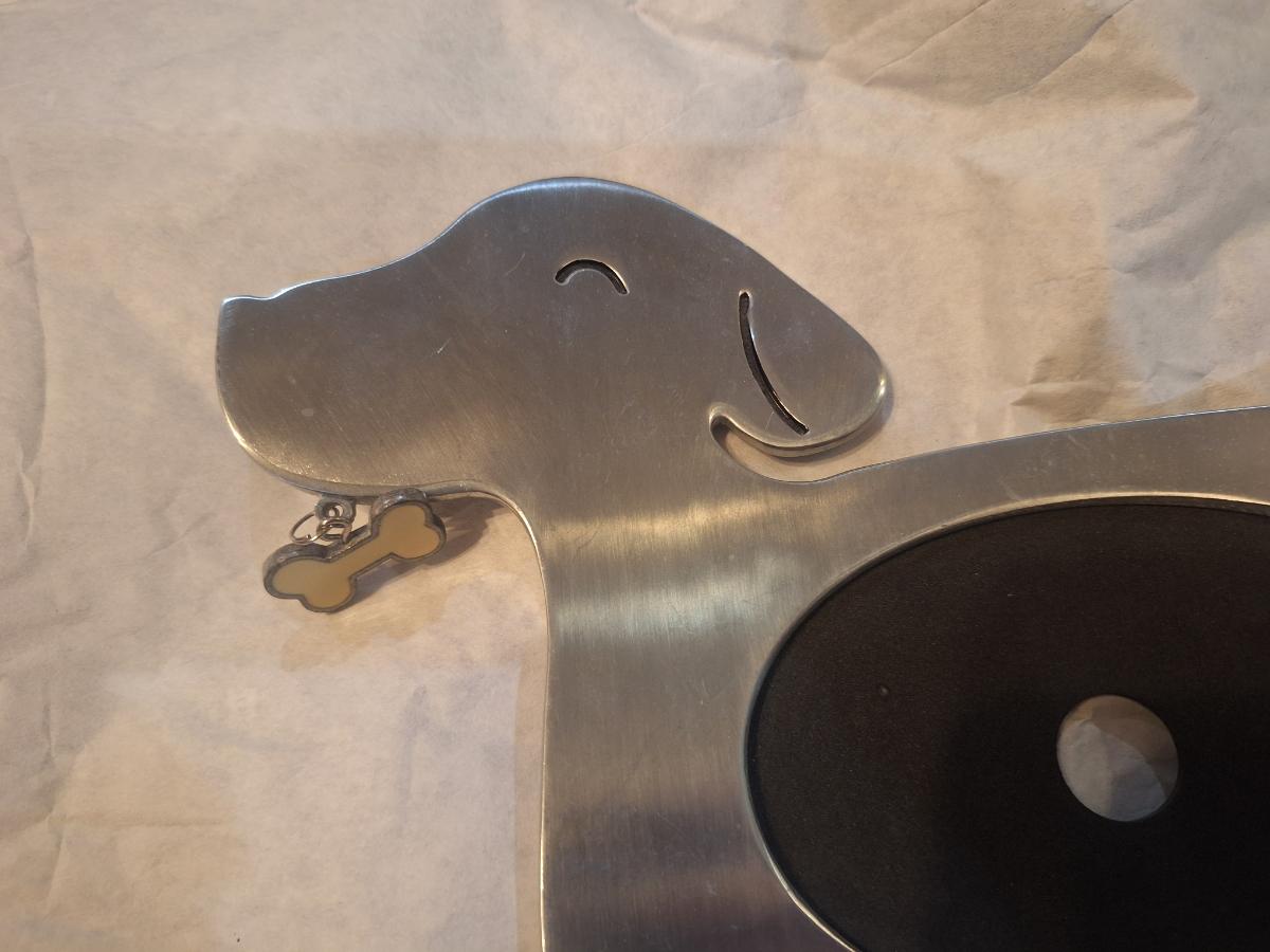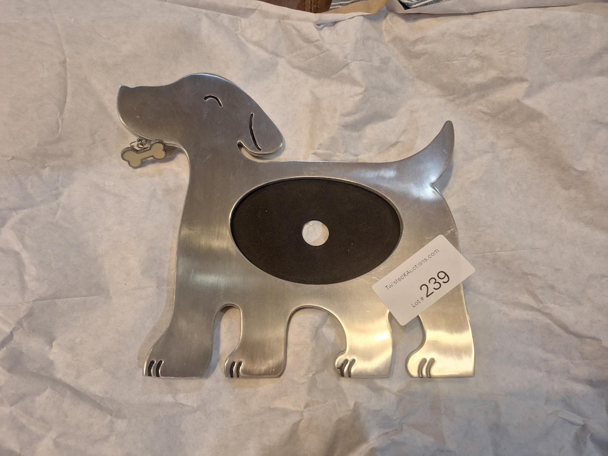 dog-shaped photo frame made from stainless steel or a similar silver-finish metal.