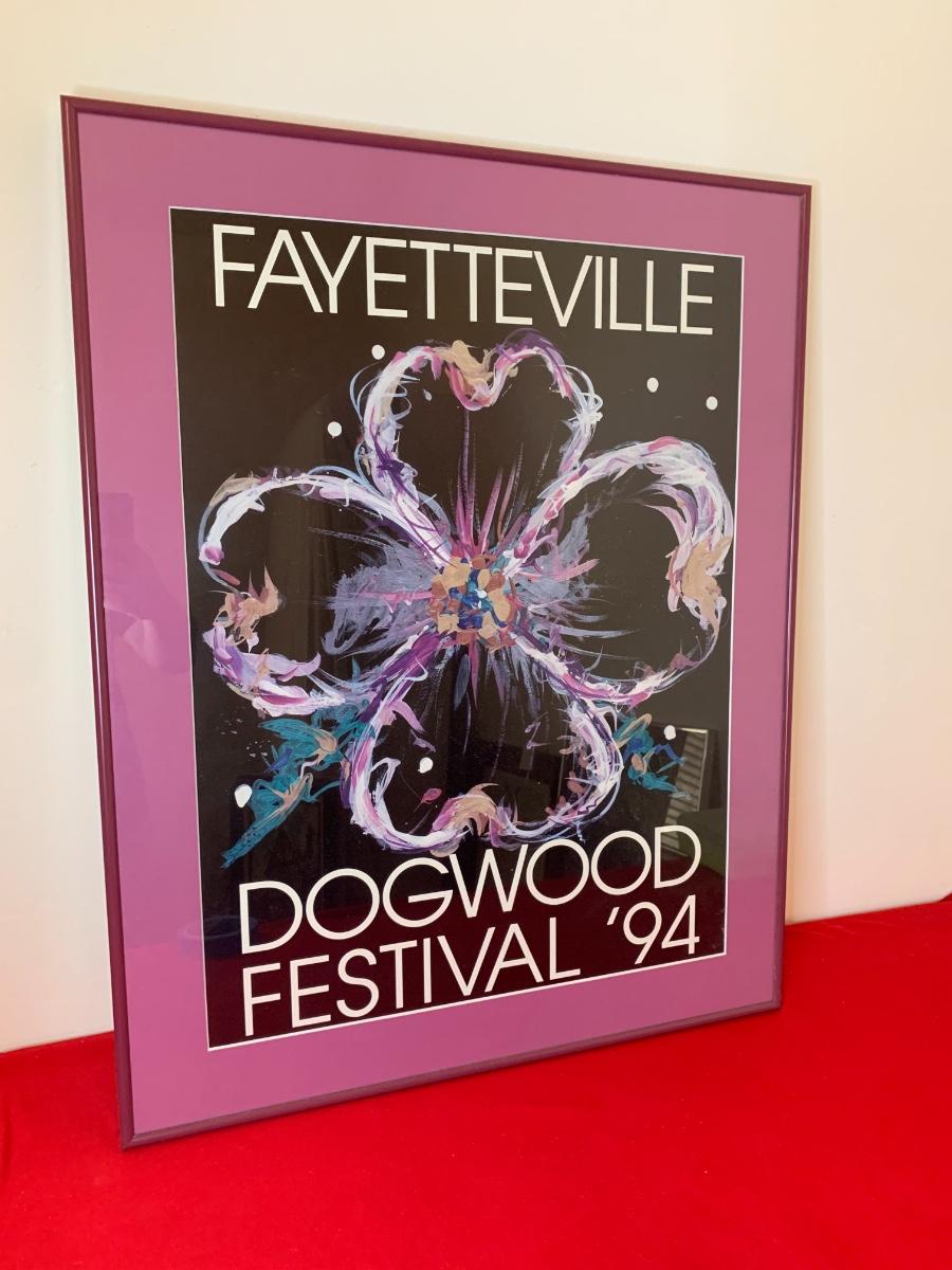 Lot includes a framed poster from Dogwood Festival 1994 in Fayetteville. Has a complimenting metal purple frame, ready to hang. 29” x 23”
