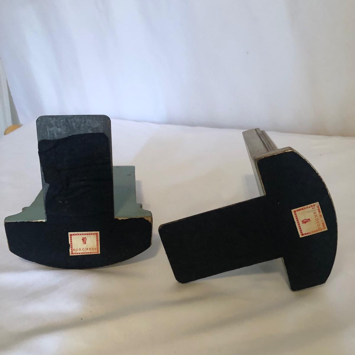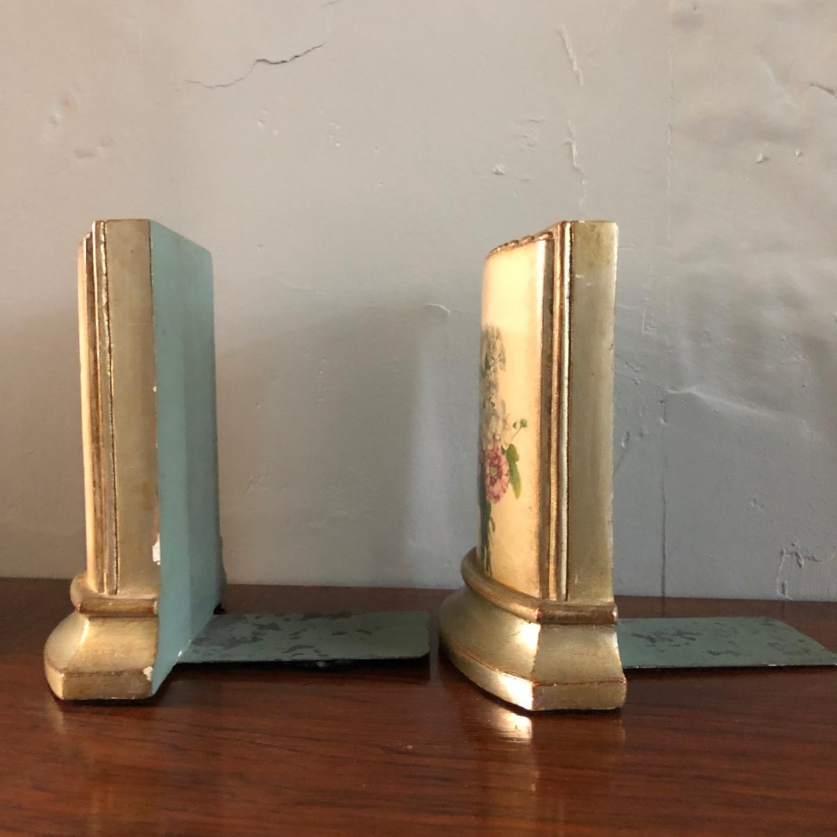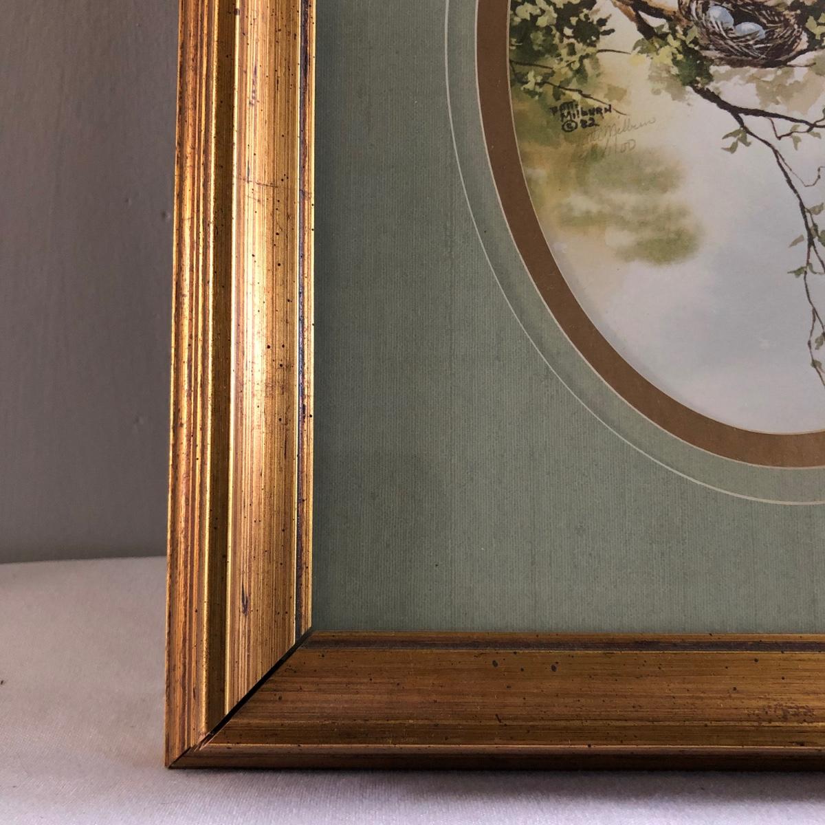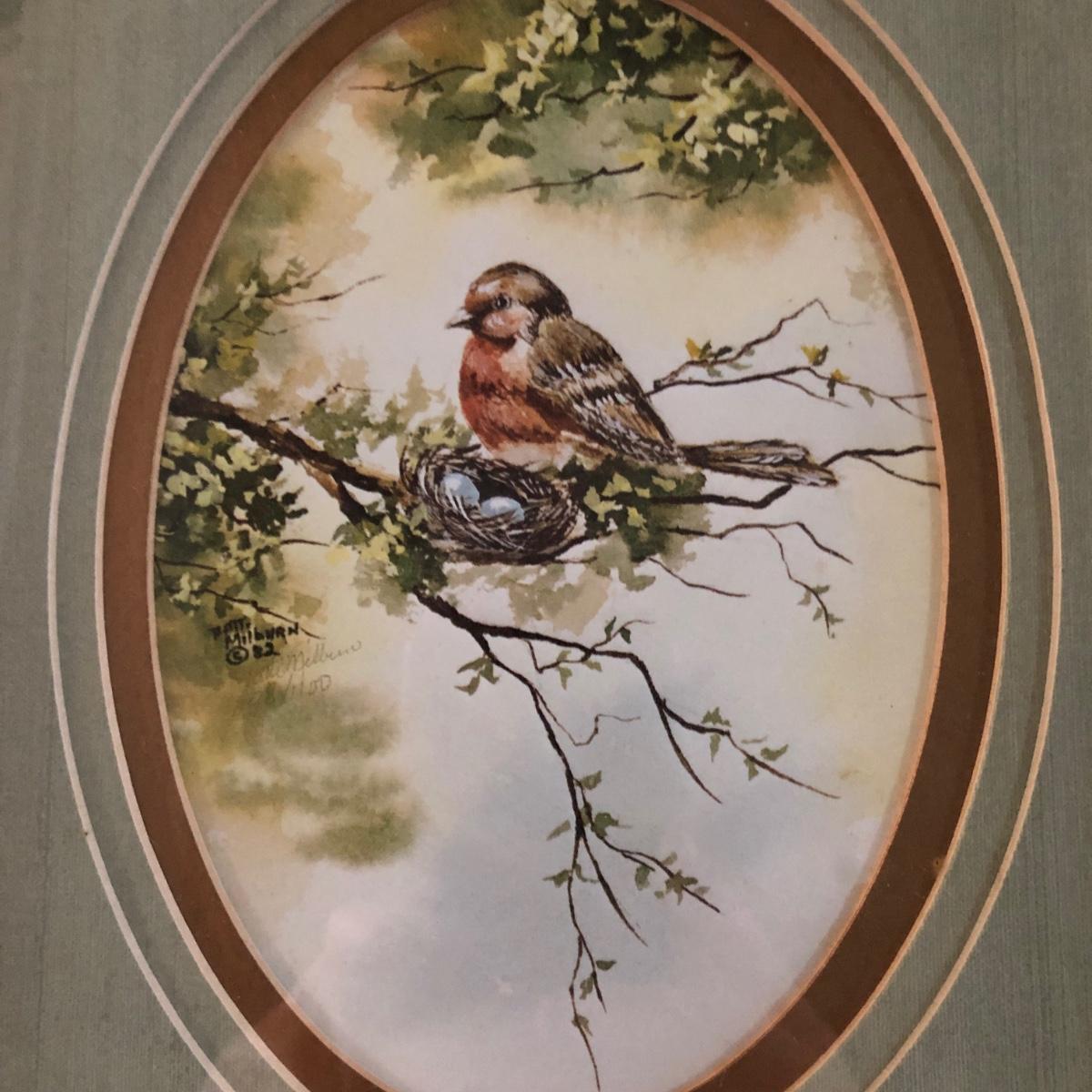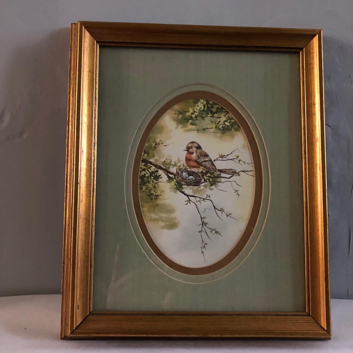 This vintage feminine décor collection features 2 framed artworks and 2 Borghese bookends. 3 handcrafted doilies are framed in a dovetailed handmade wooden frame in brown wood and gold. The doilies are matted in light brown and dark dusty rose and the frame measures 13” x 16” x 1.25”. There are also two Borghese bookends in mint green, gold, and cream displaying colorful flower bouquets. Each bookend measures 5” x 6” x 5.25”. An oval cut mat frames a hand signed print of a watercolor of a robin sitting on a nest. The mint green mat is framed in gold and measures 10.25“ x 12.25” x 1.75”. The frame of the robin print is painted plastic, and the handcrafted wooden frame on the doilies shows signs of being repaired with nails as pictured. The bookends do have some wear on the mint green paint from use. Shipping available. Shipping art can be costly. Please contact the local UPS store to get a shipping quote.