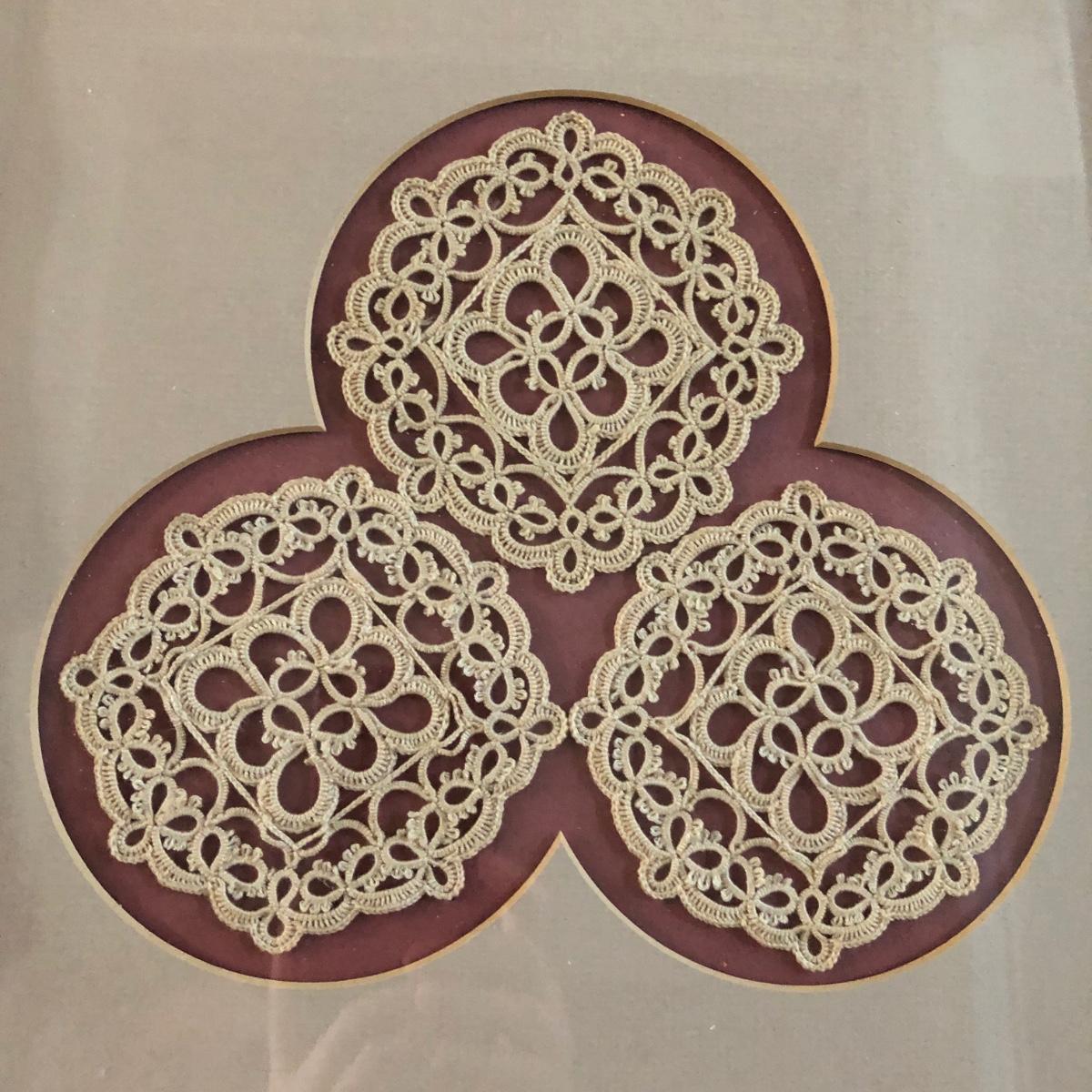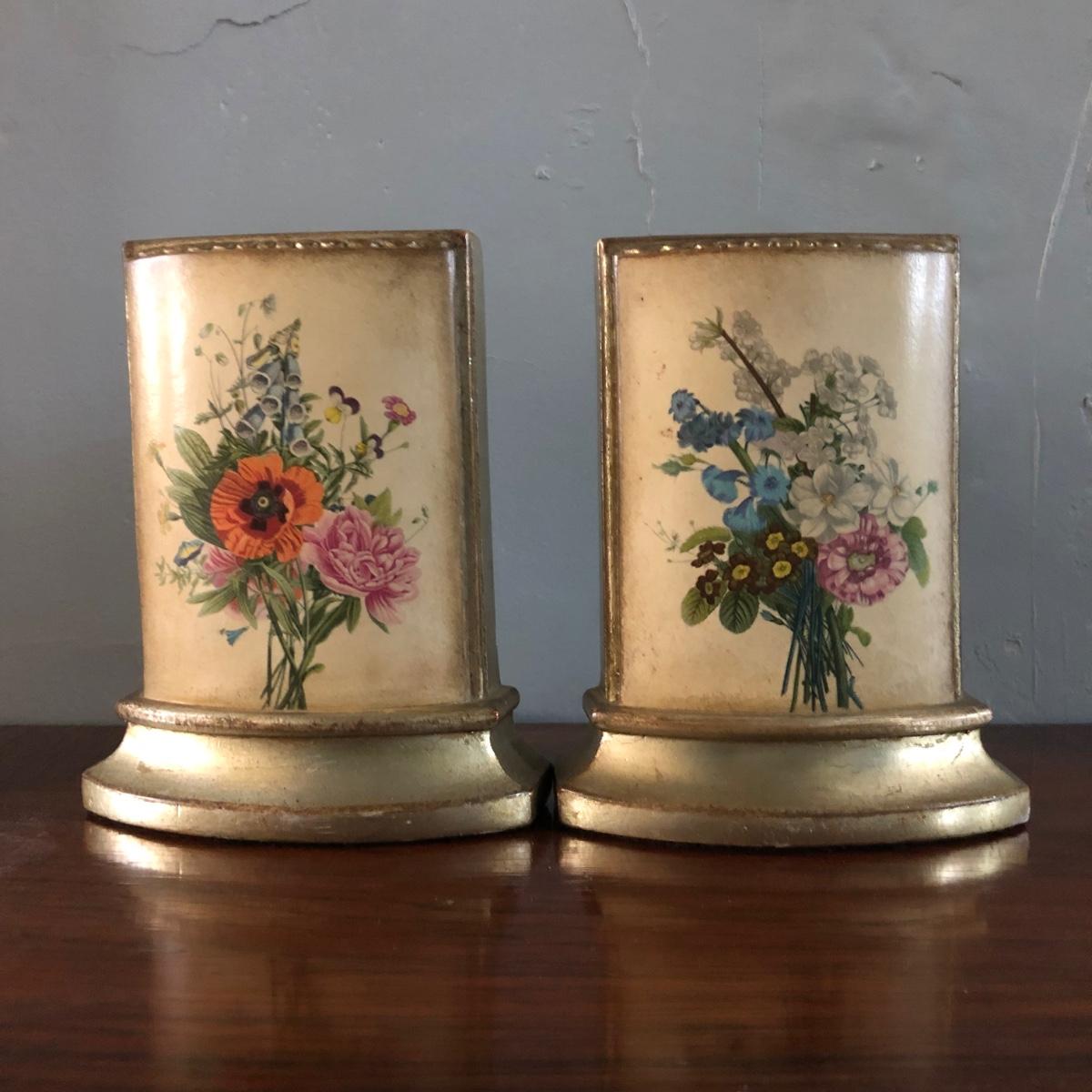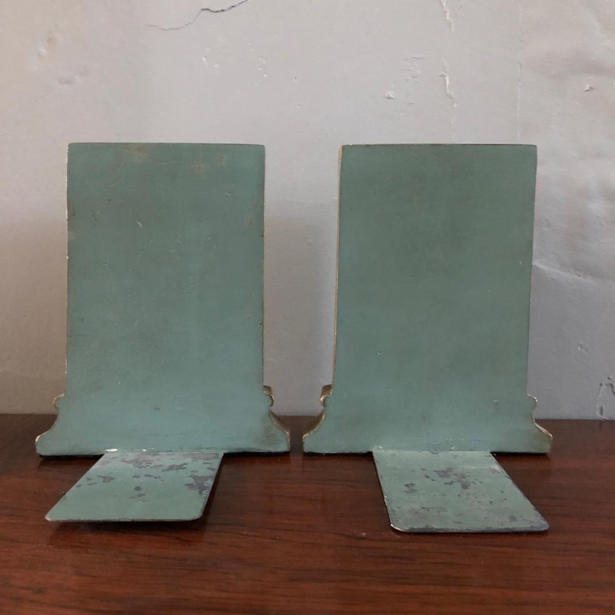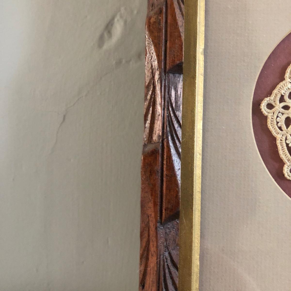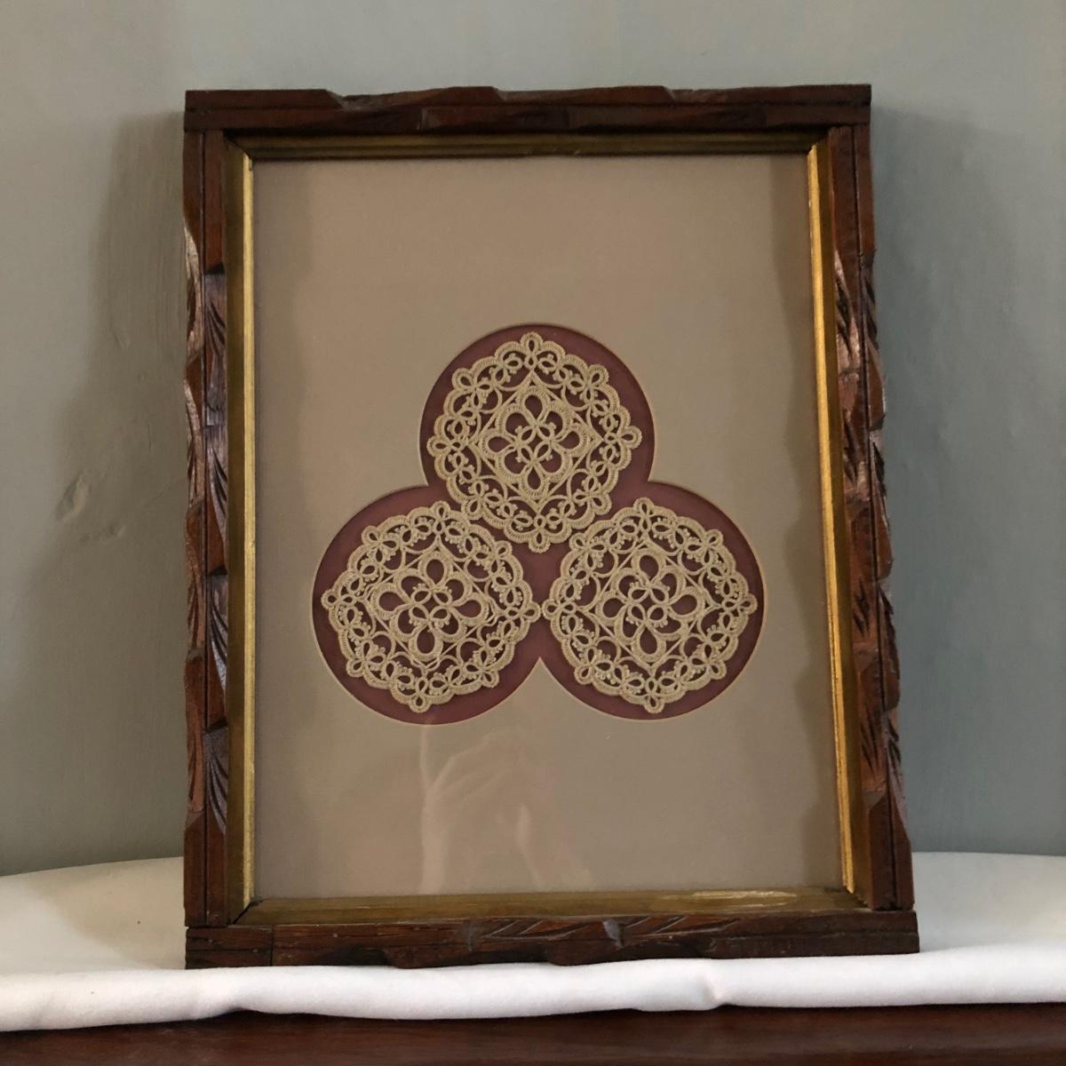 This vintage feminine décor collection features 2 framed artworks and 2 Borghese bookends. 3 handcrafted doilies are framed in a dovetailed handmade wooden frame in brown wood and gold. The doilies are matted in light brown and dark dusty rose and the frame measures 13” x 16” x 1.25”. There are also two Borghese bookends in mint green, gold, and cream displaying colorful flower bouquets. Each bookend measures 5” x 6” x 5.25”. An oval cut mat frames a hand signed print of a watercolor of a robin sitting on a nest. The mint green mat is framed in gold and measures 10.25“ x 12.25” x 1.75”. The frame of the robin print is painted plastic, and the handcrafted wooden frame on the doilies shows signs of being repaired with nails as pictured. The bookends do have some wear on the mint green paint from use. Shipping available. Shipping art can be costly. Please contact the local UPS store to get a shipping quote.