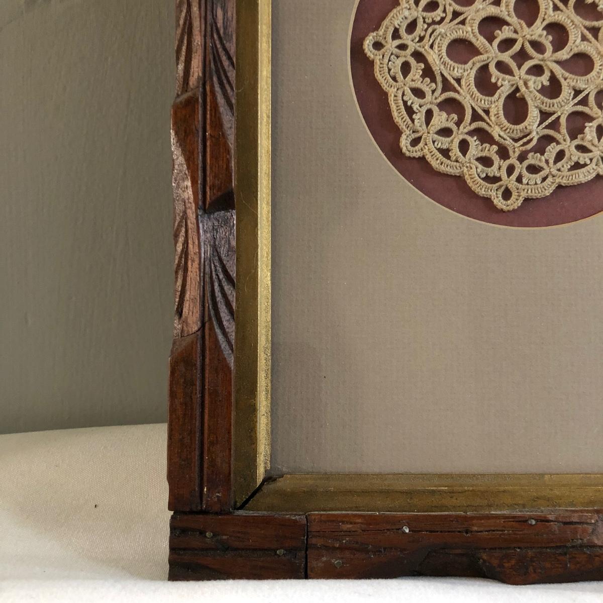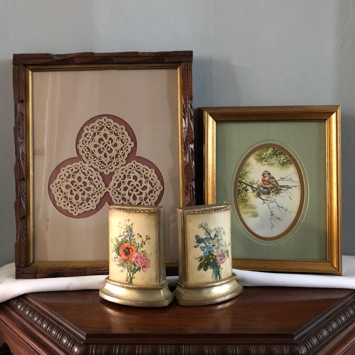Vintage Feminine Décor: Borghese Floral Bookends, Doilies in Hand Carved Frame & Framed Bird Print (DR-JF)