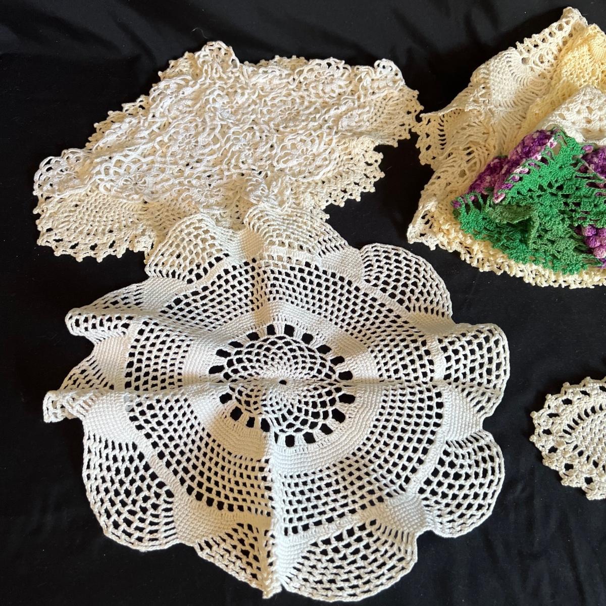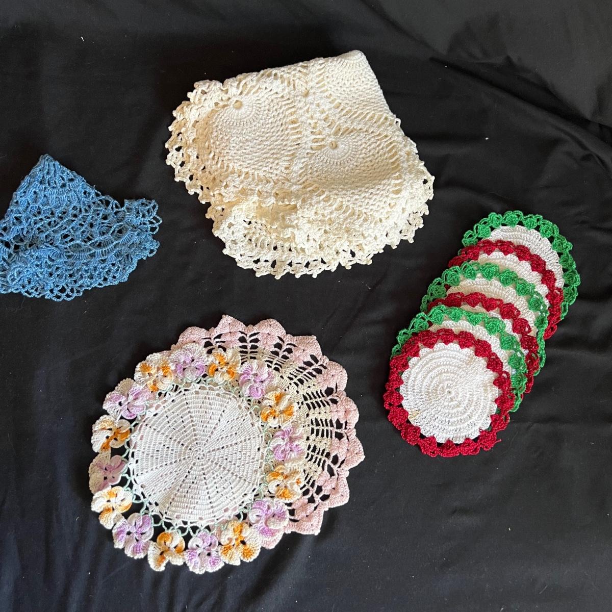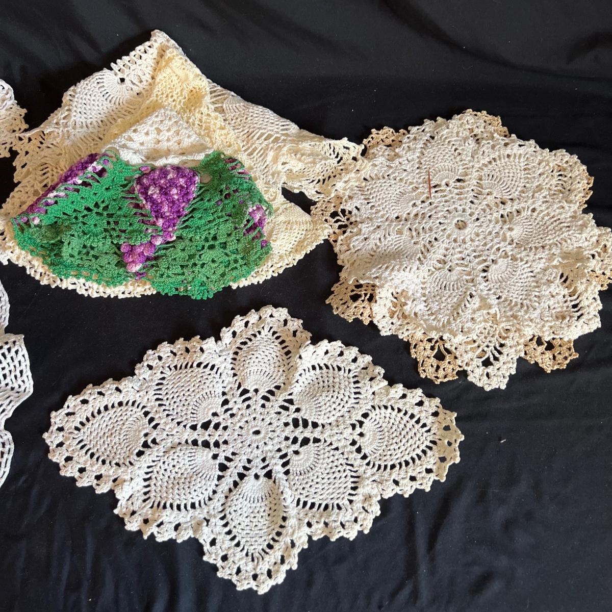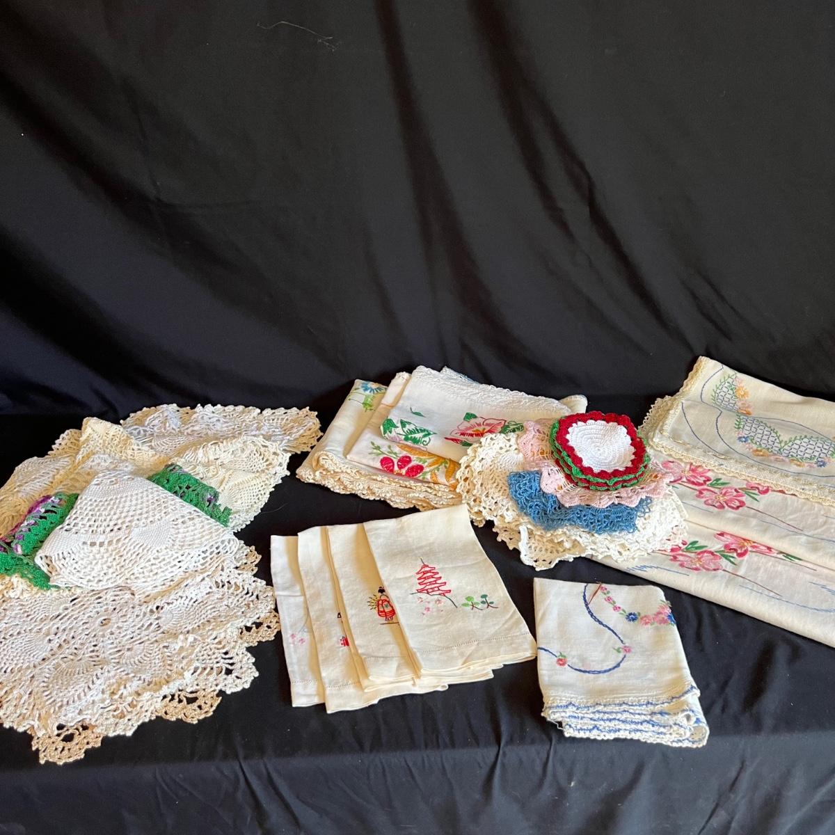 A large collection of round and oval doilies. The largest round measures 22” round and the smallest (coaster size) is 4” round. The largest oval is 30” x 14”H and the smallest 15” x 8”H. Four embroidered napkins that appear to be linen. And seven rectangular embroidered table covers, the largest is 30” x 15”H and the smallest is 36” x 13”H.