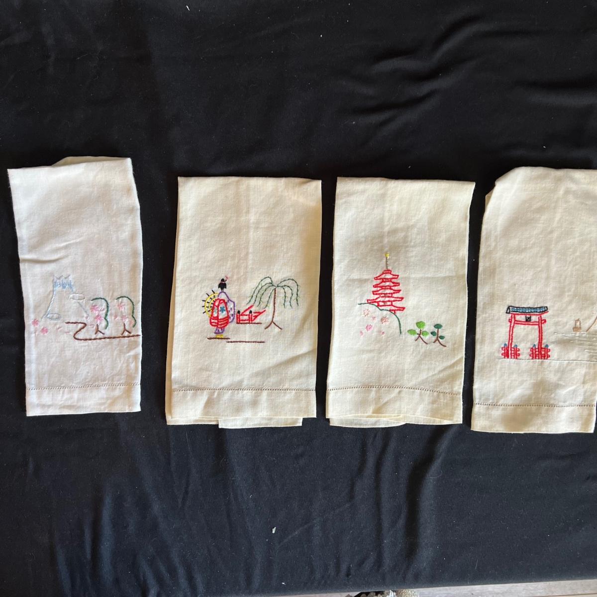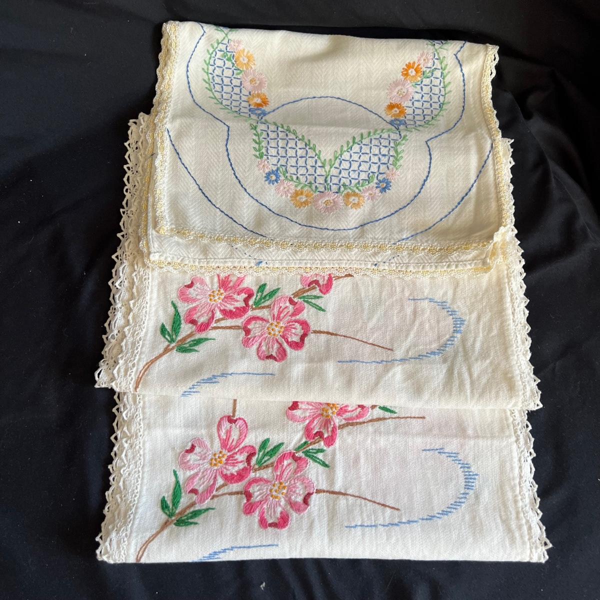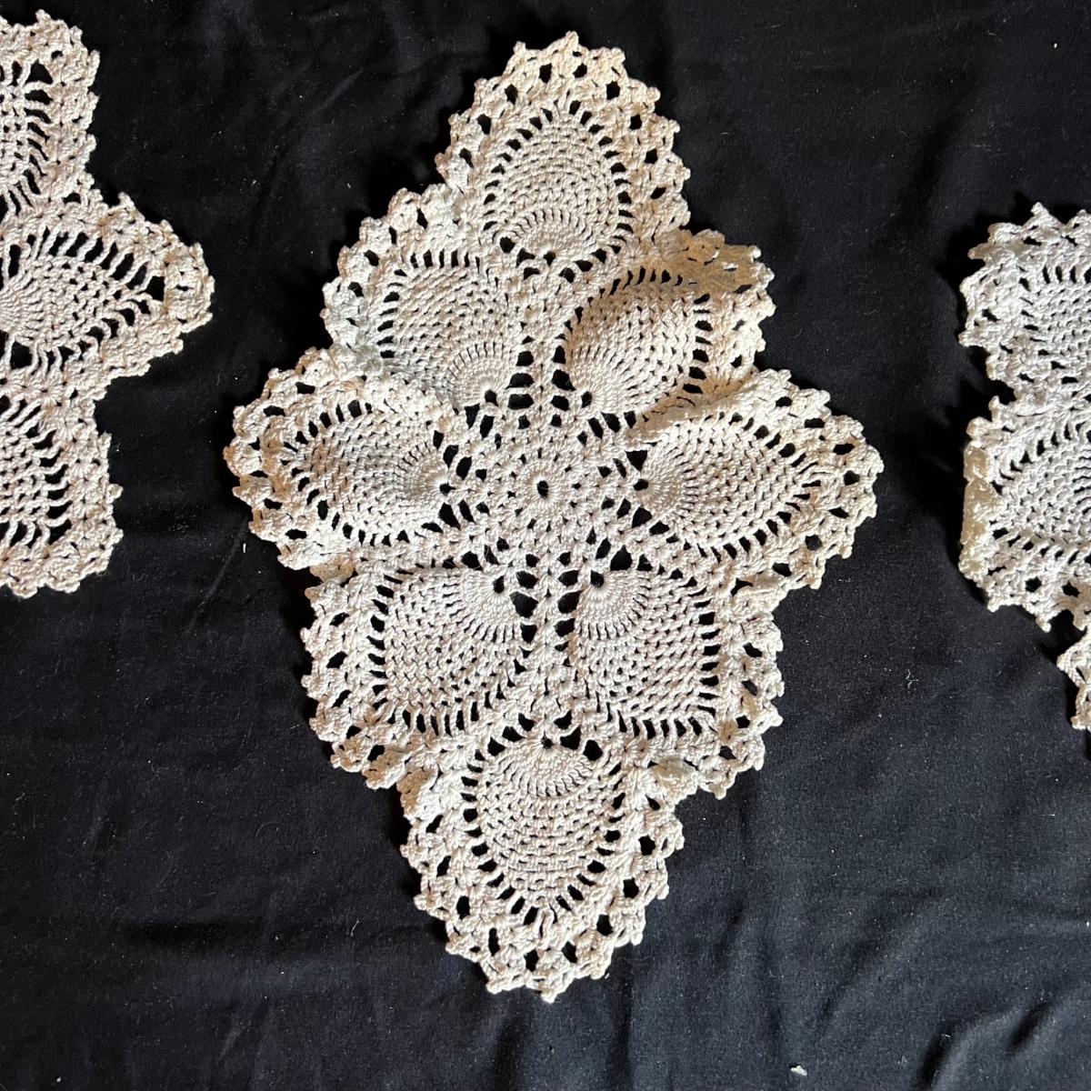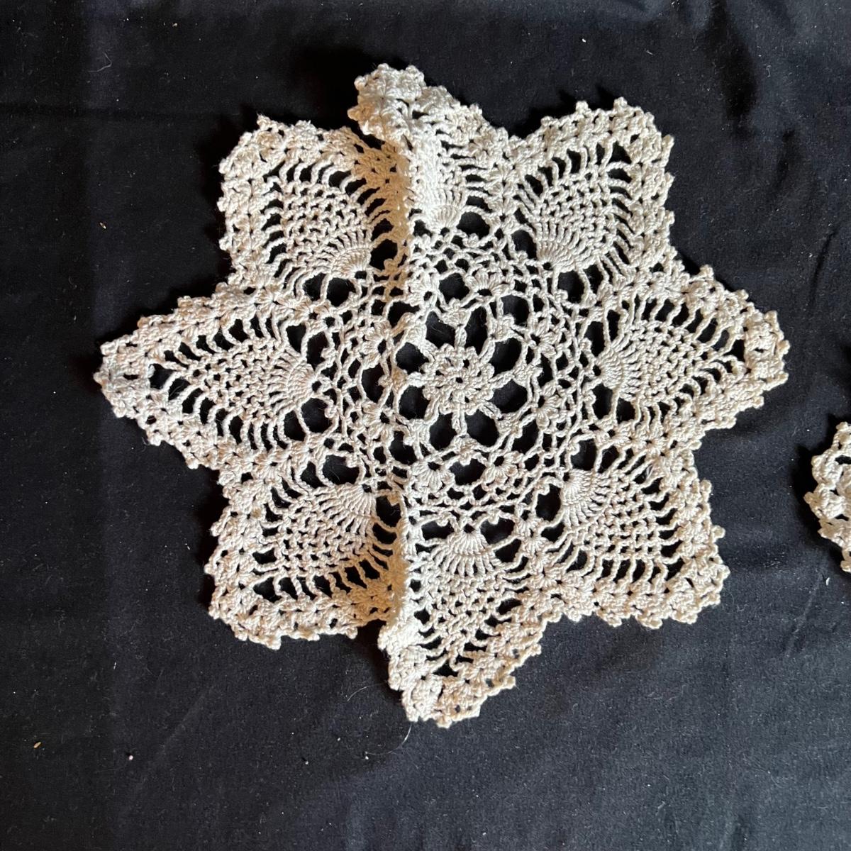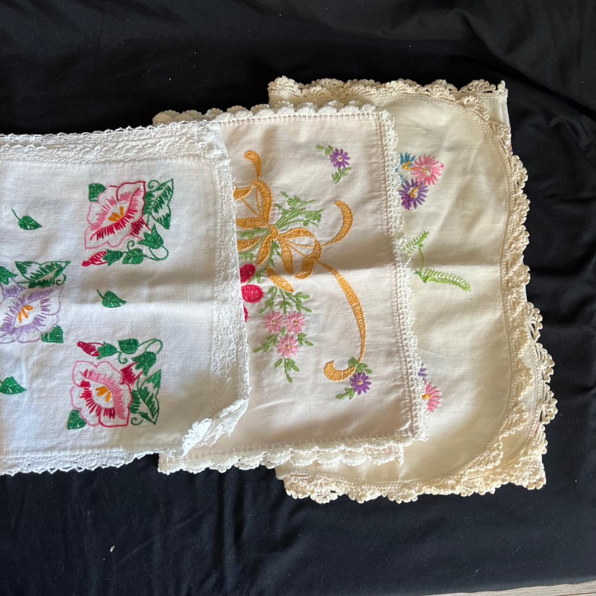 A large collection of round and oval doilies. The largest round measures 22” round and the smallest (coaster size) is 4” round. The largest oval is 30” x 14”H and the smallest 15” x 8”H. Four embroidered napkins that appear to be linen. And seven rectangular embroidered table covers, the largest is 30” x 15”H and the smallest is 36” x 13”H.
