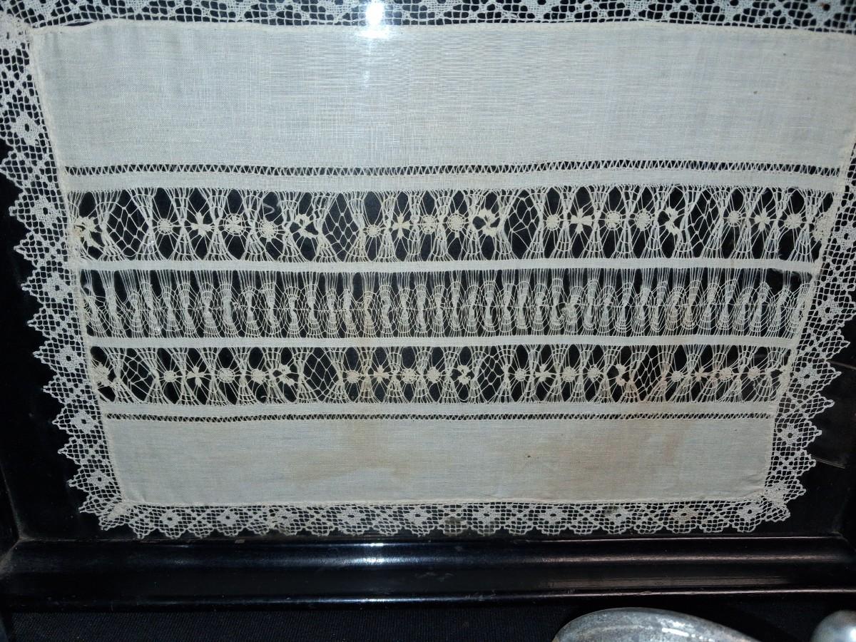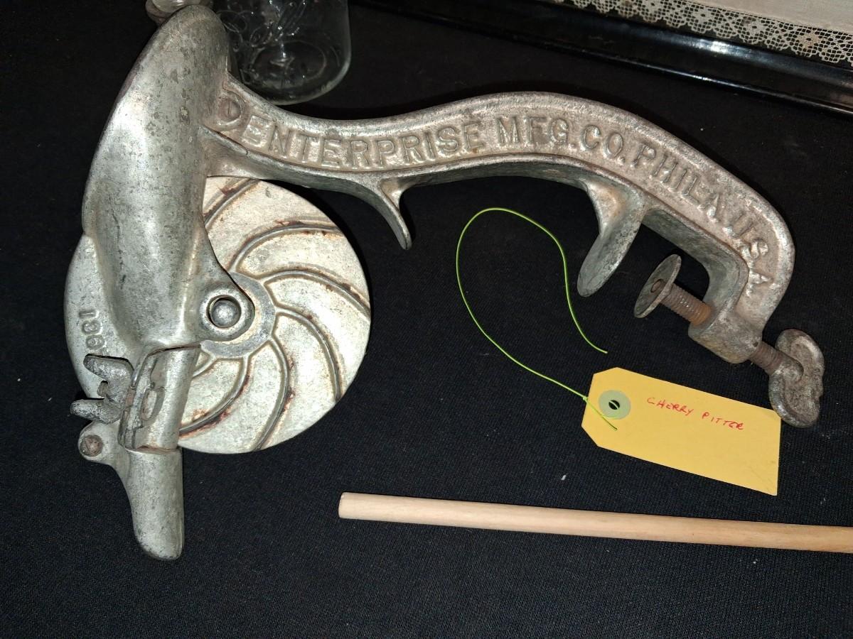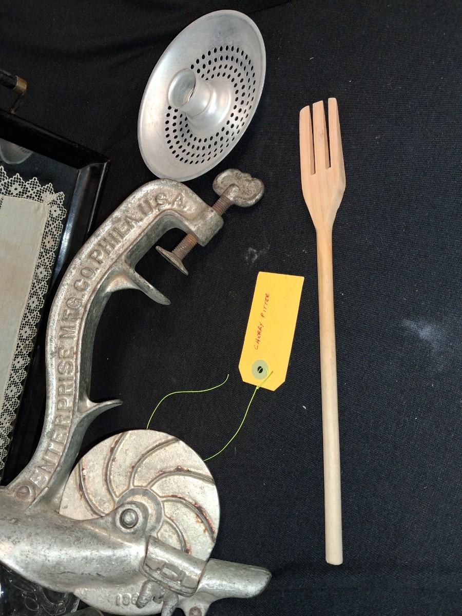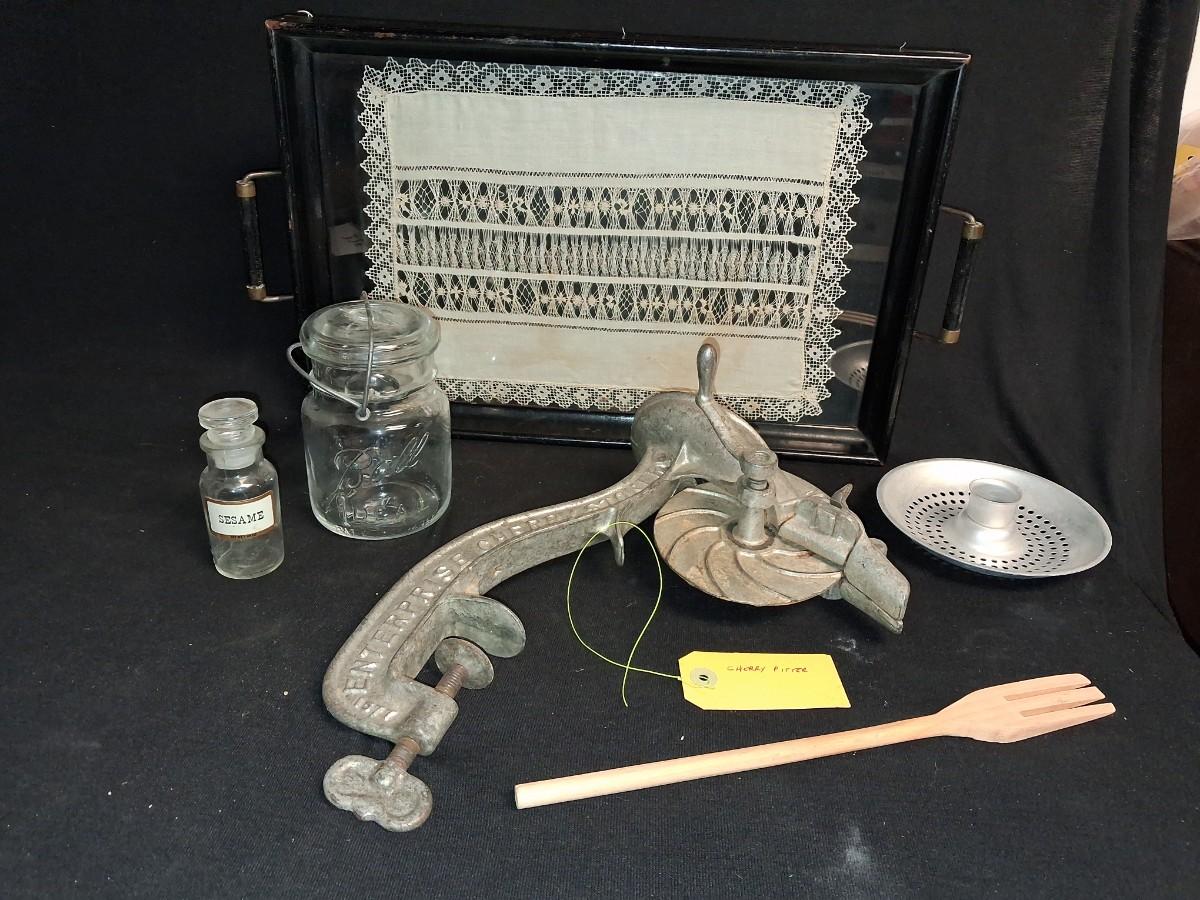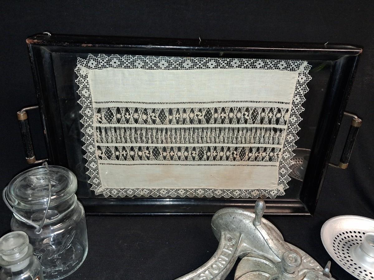 DOILY UNDER GLASS ON A SERVING TRAY, FOOD GRINDER AND MORE
