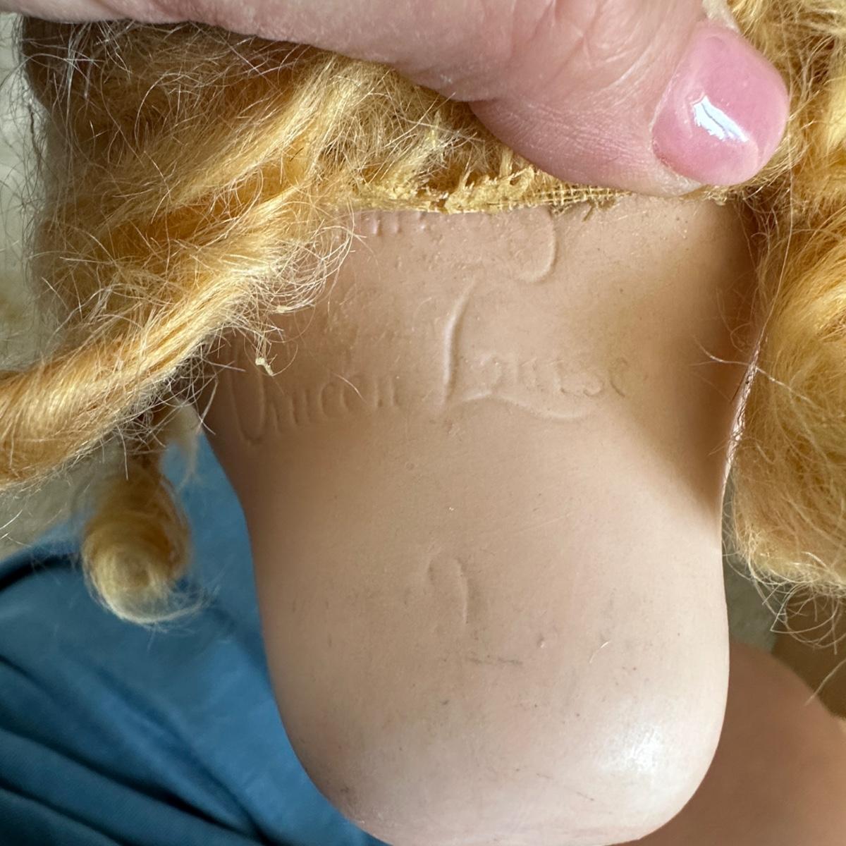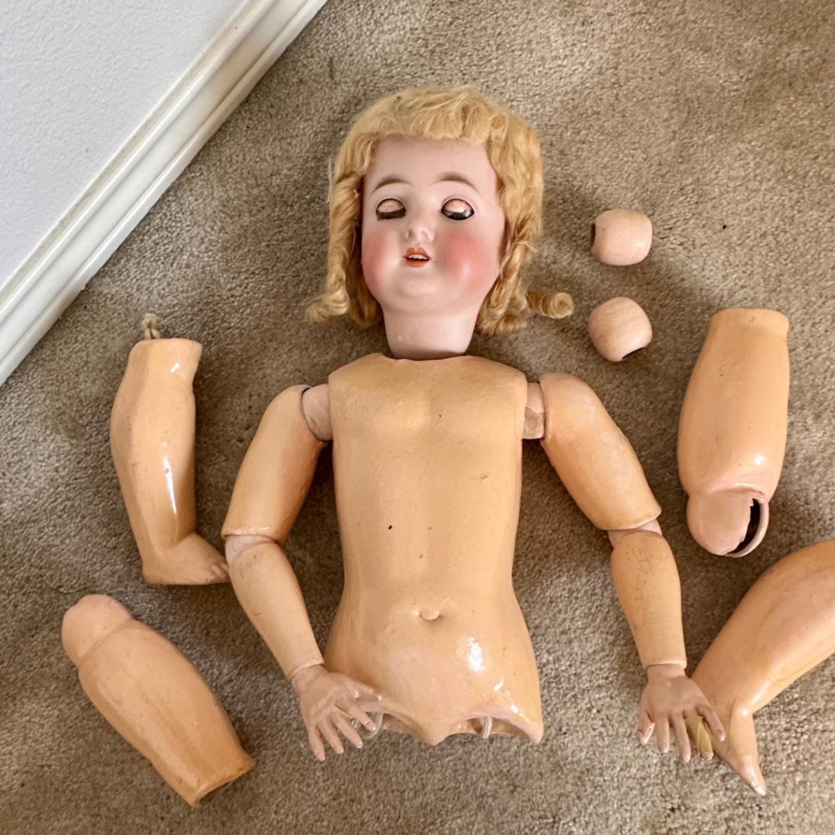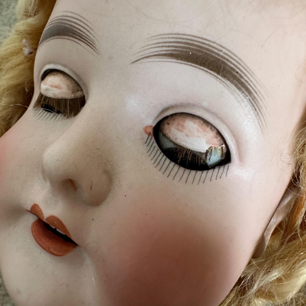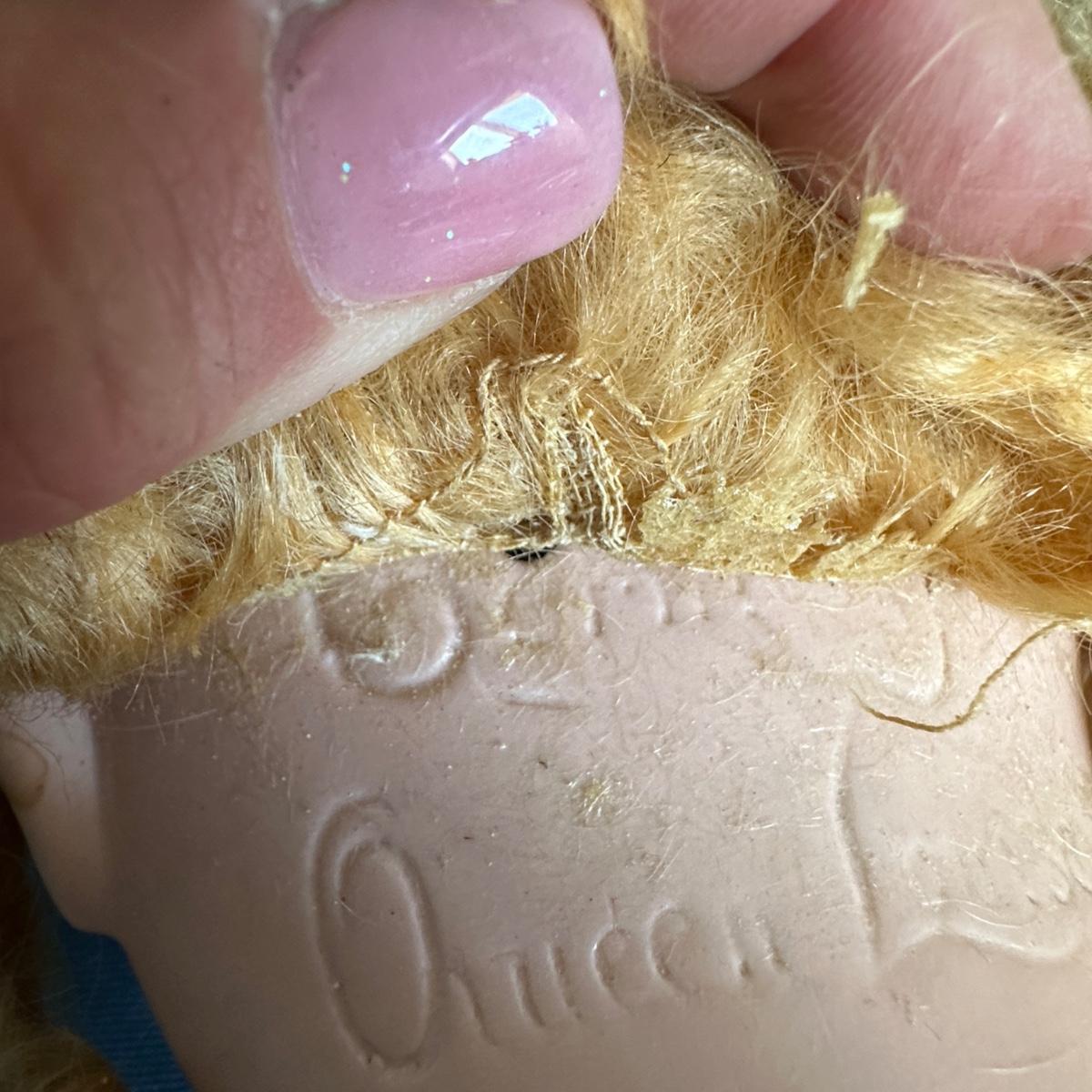 Queen Louise jointed doll from the Germany, Circa 1910. She has a porcelain head and a wooden body. Her hand-blown glass, sleepy eyes are brown with real top lashes and painted bottom lashes and eyebrows. Original mohair wig. She would require restringing before standing approx 24-26" tall. There is no clothing with this doll.
