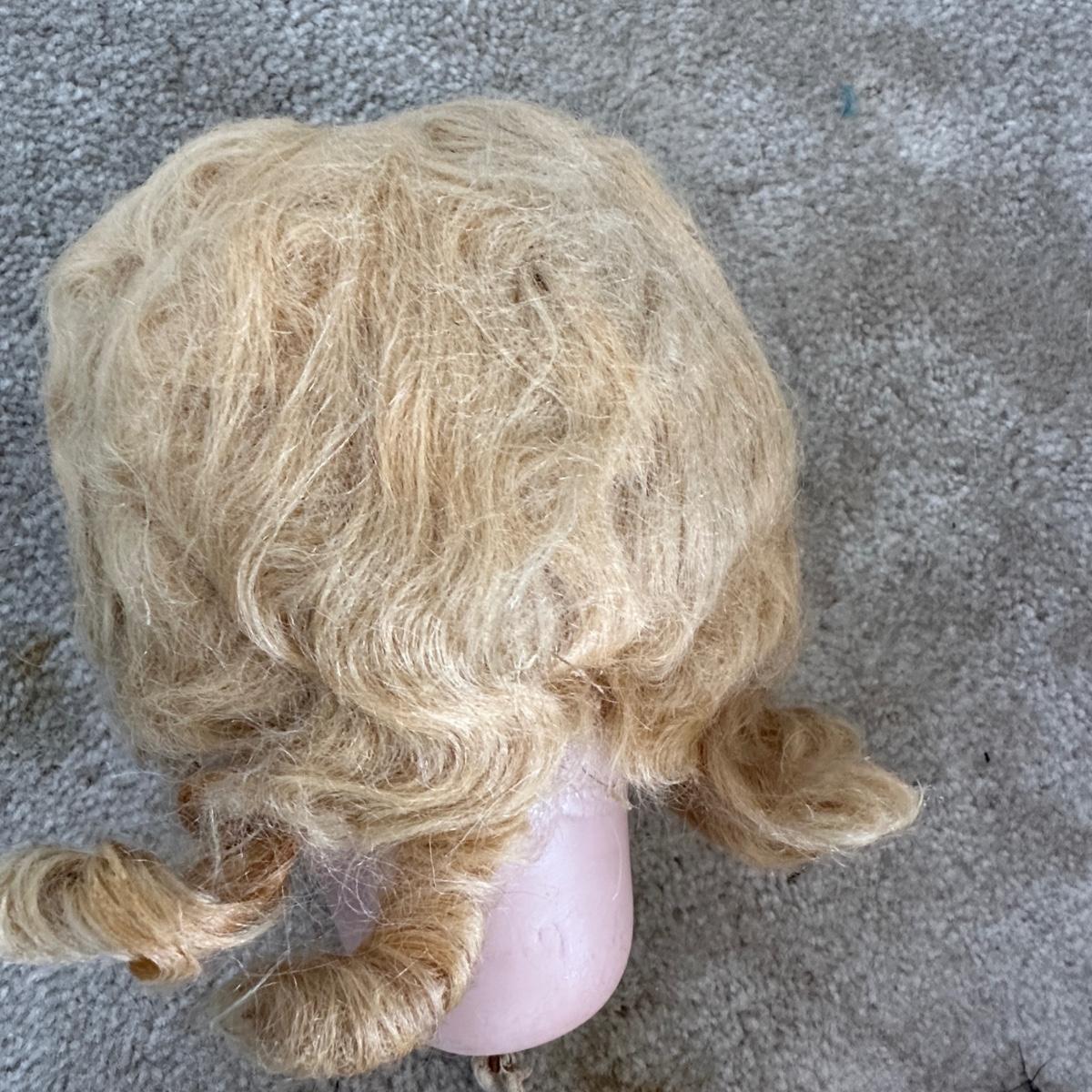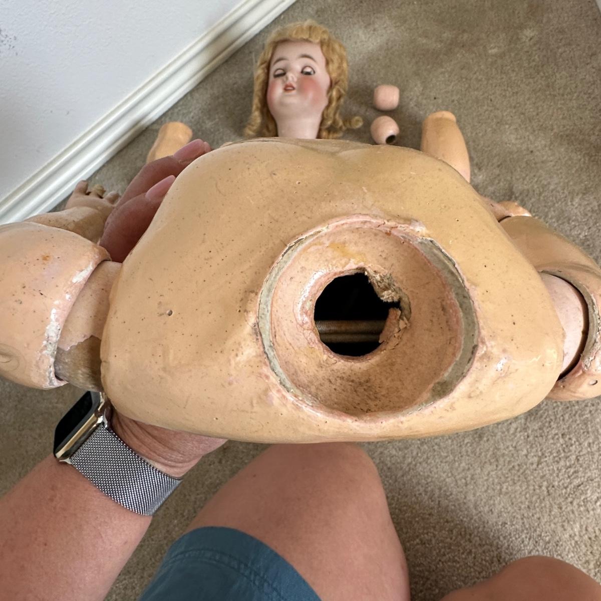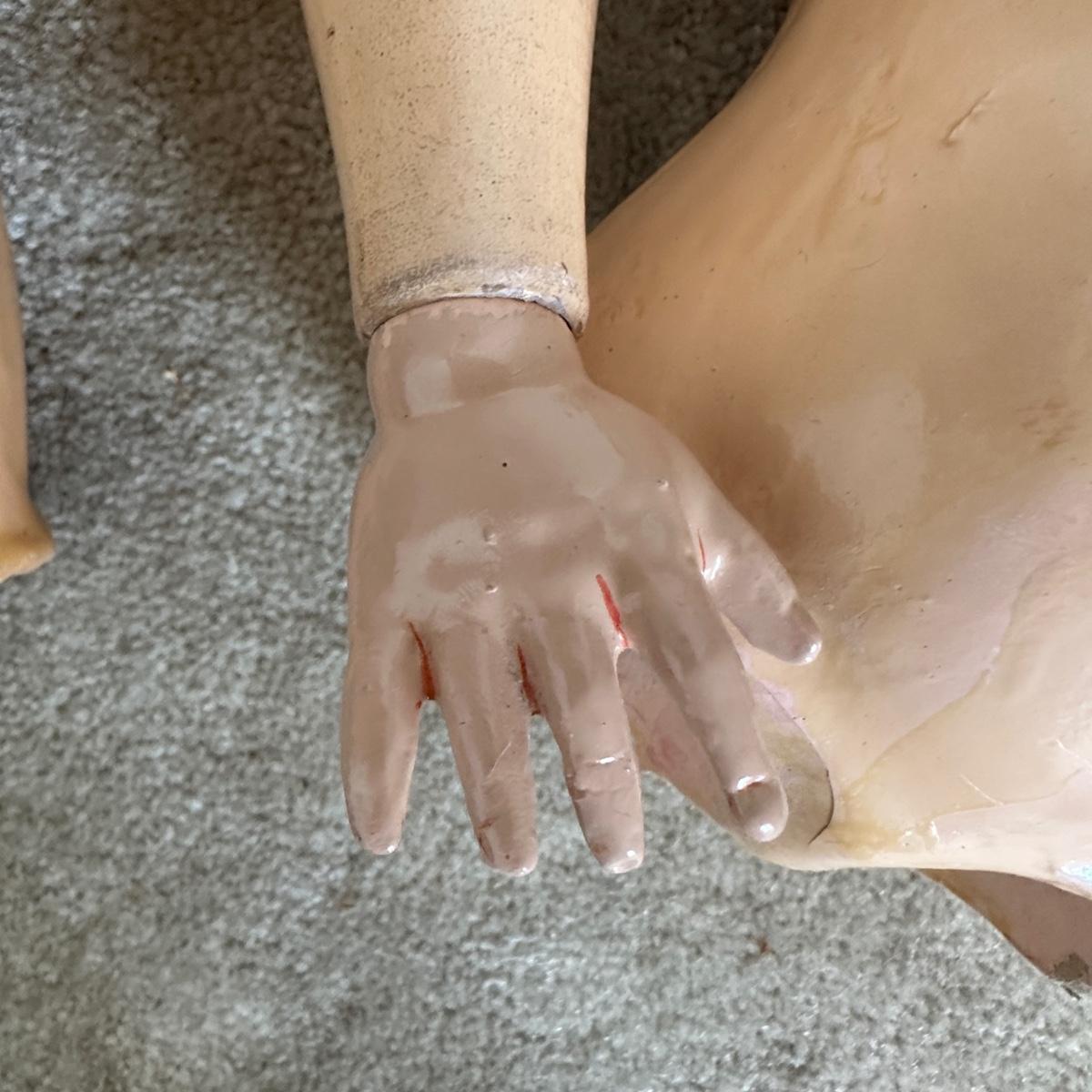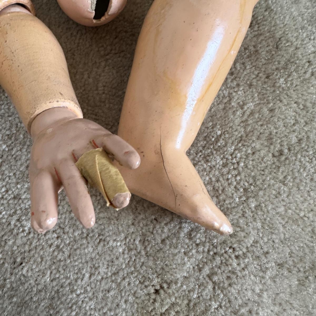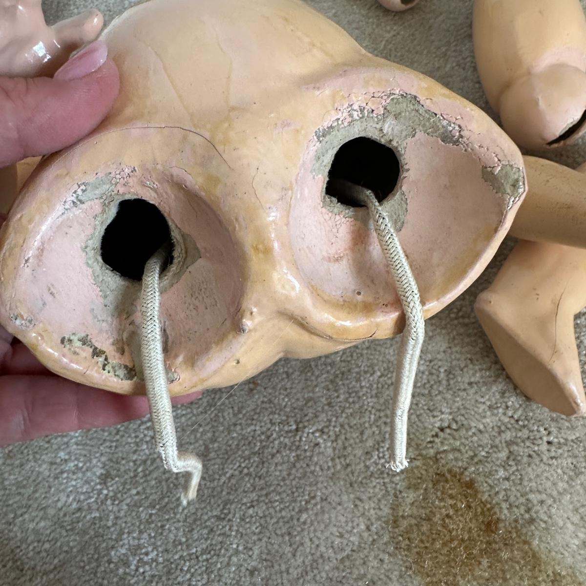 Queen Louise jointed doll from the Germany, Circa 1910. She has a porcelain head and a wooden body. Her hand-blown glass, sleepy eyes are brown with real top lashes and painted bottom lashes and eyebrows. Original mohair wig. She would require restringing before standing approx 24-26" tall. There is no clothing with this doll.