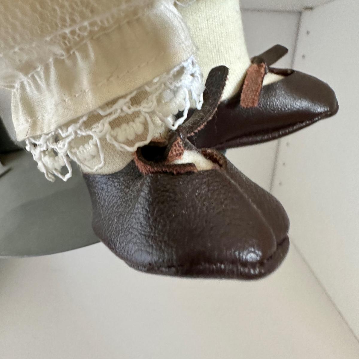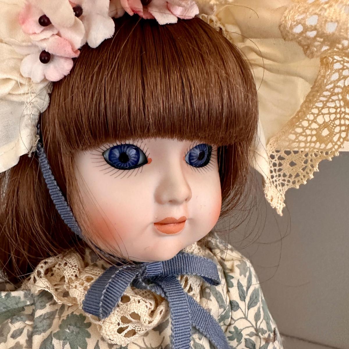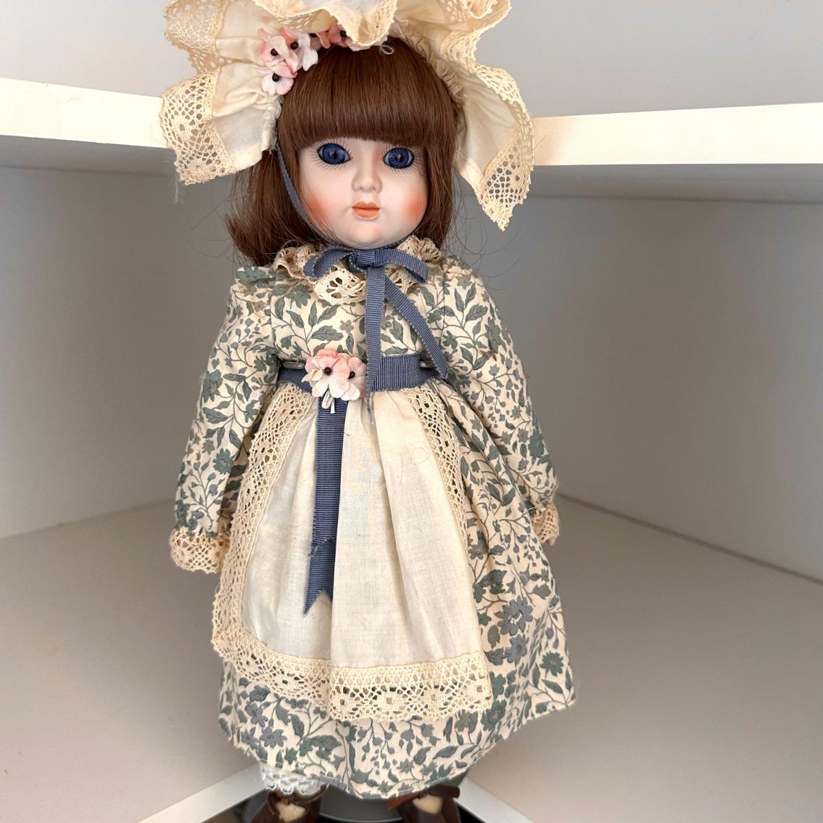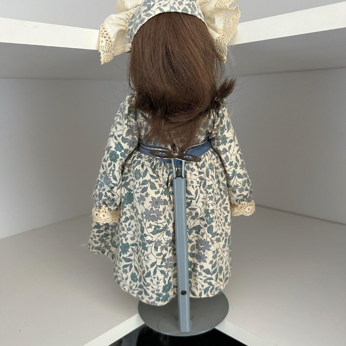 Gorham 1981 "Danielle" Doll with light blue flower dress and white apron trimmed in lace has brown hair and blue eyes. She is wearing a bracelet charm w/ the letter "G." She has a music box built in that plays "You are My Sunshine." She stands 14 inches