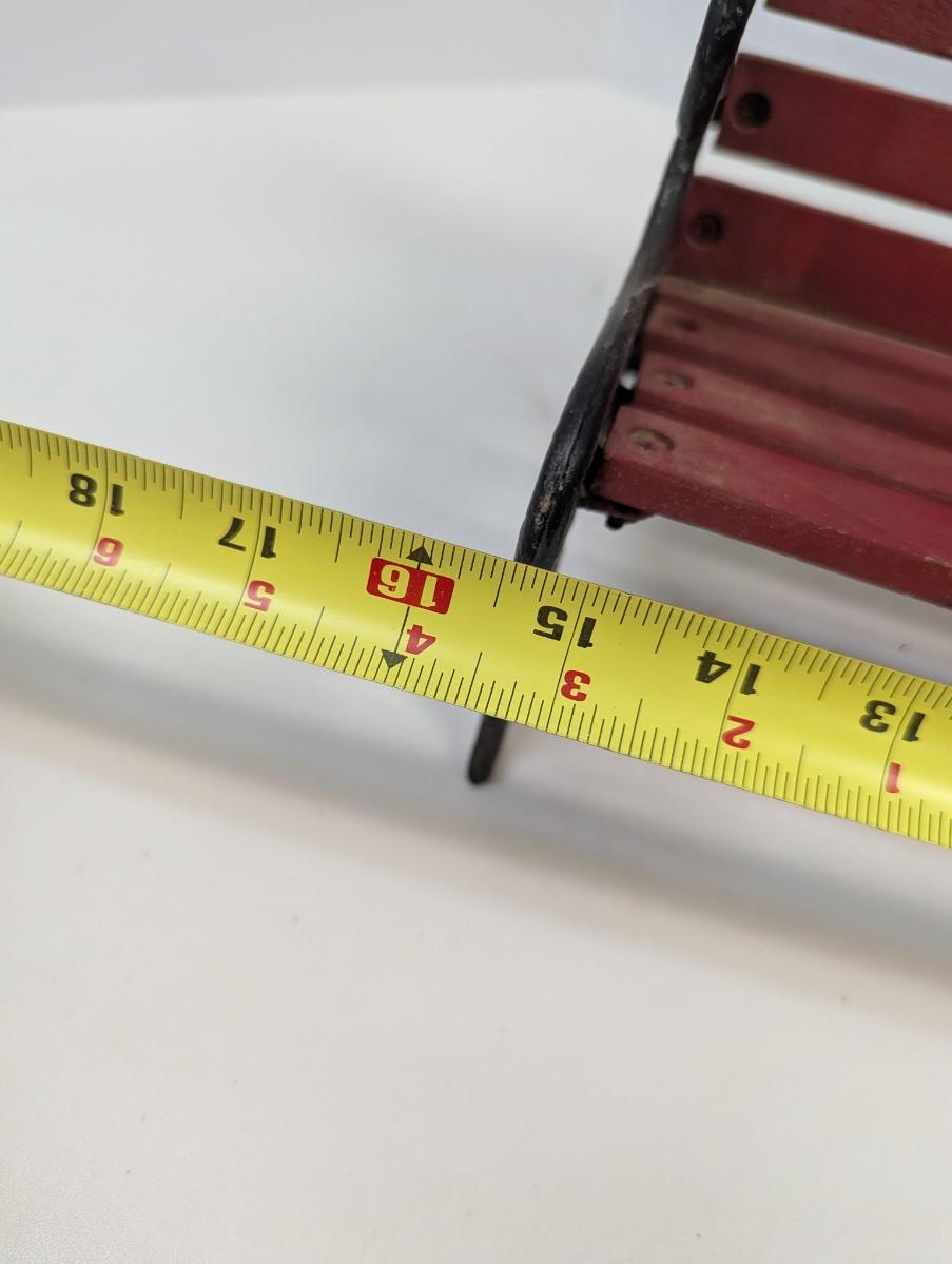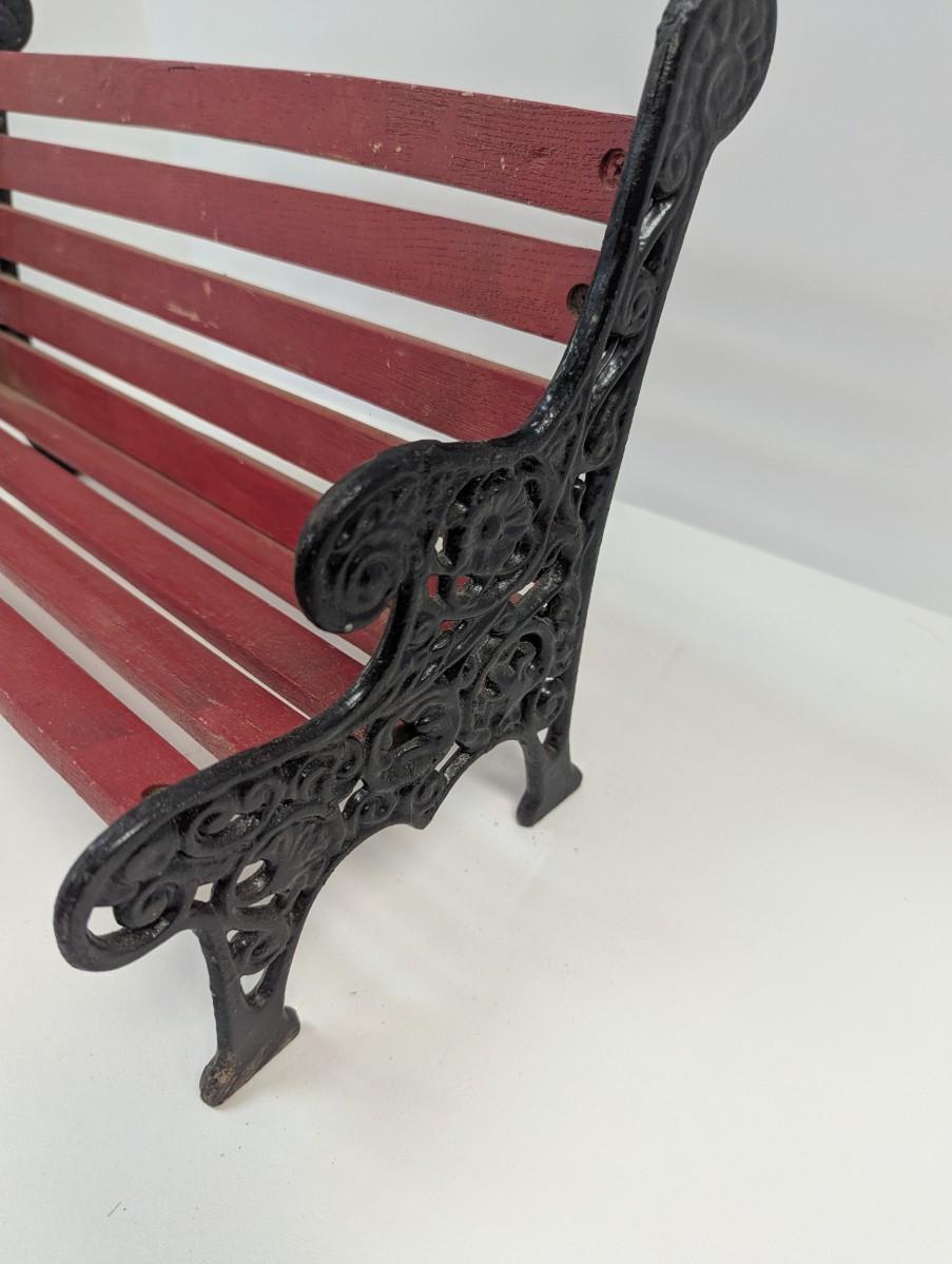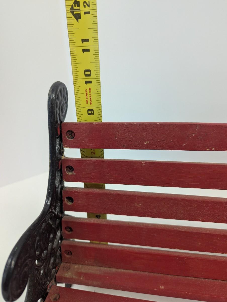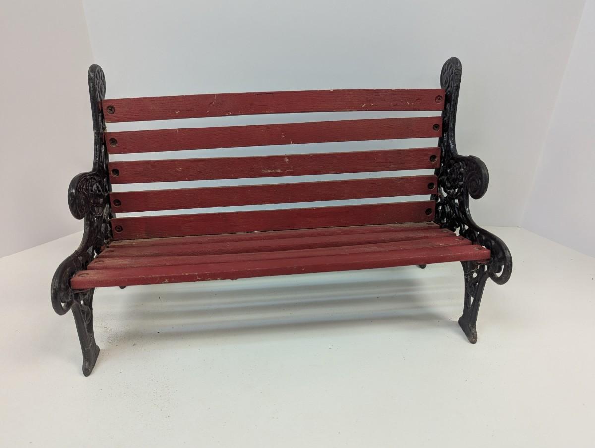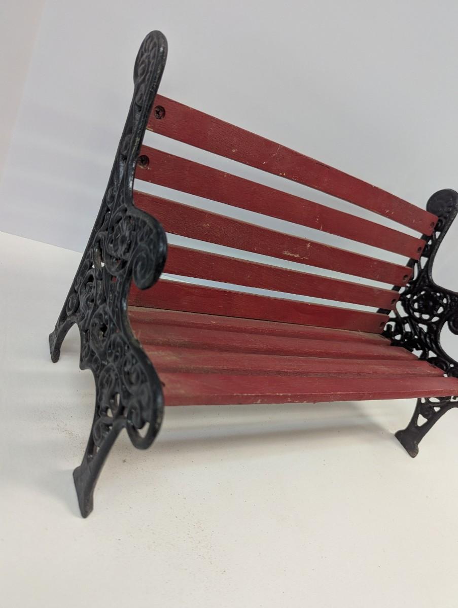 This doll-sized bench with iron detailing is a charming addition to any vintage dollhouse. Crafted from sturdy wood in a warm brown hue, this piece of furniture is a perfect accessory