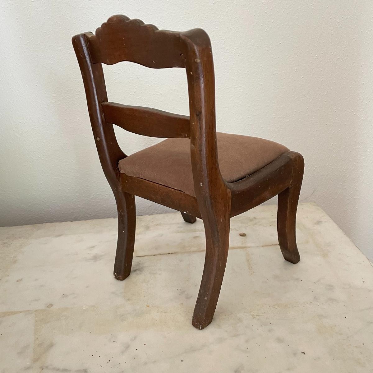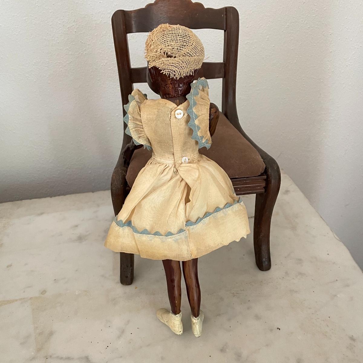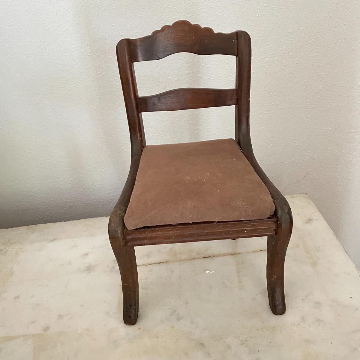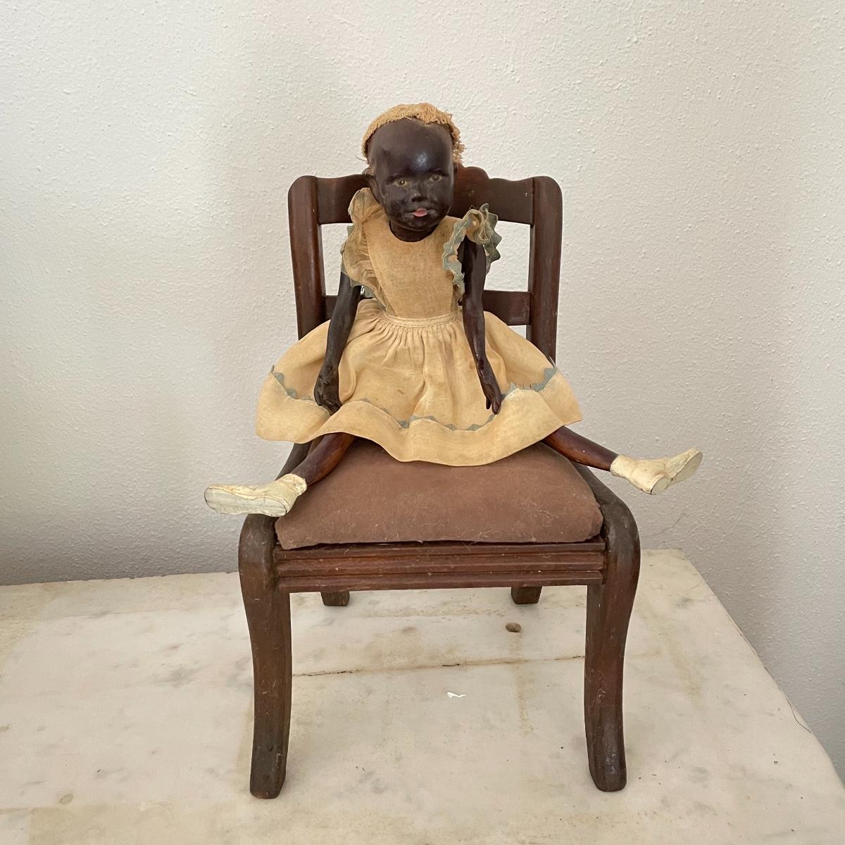 Vintage “Pat. Pend Doll Children by Constance” appears to be a carved and painted 13” wooden doll with mobile arms, head and legs. Doll has painted shoes, a glued cap and an aged dress. We’ve paired her with a miniature 12” tall wooden chair with a cast iron cushioned seat. Shipping available.