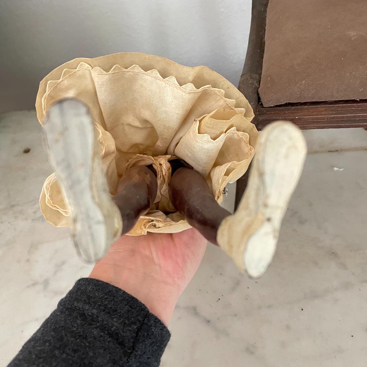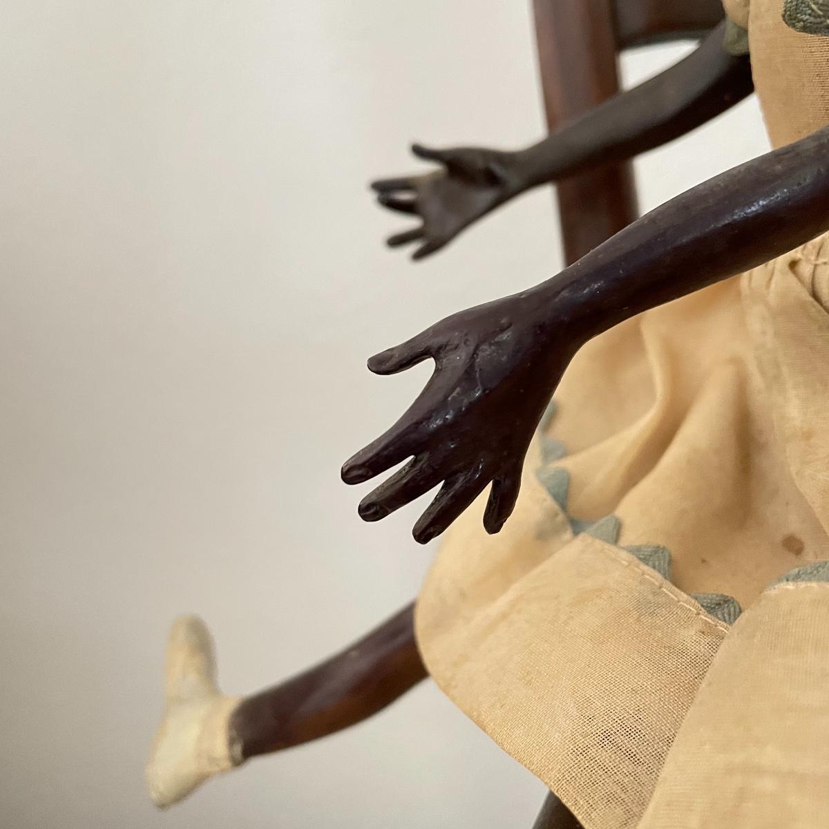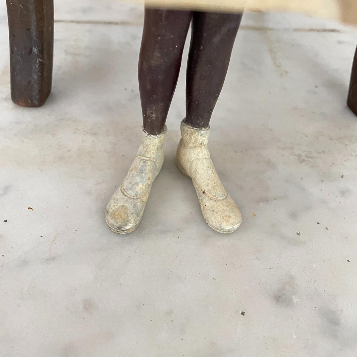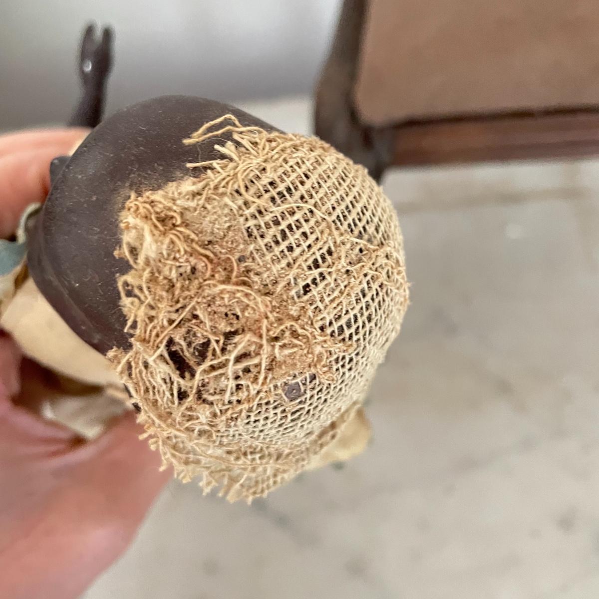 Vintage “Pat. Pend Doll Children by Constance” appears to be a carved and painted 13” wooden doll with mobile arms, head and legs. Doll has painted shoes, a glued cap and an aged dress. We’ve paired her with a miniature 12” tall wooden chair with a cast iron cushioned seat. Shipping available.