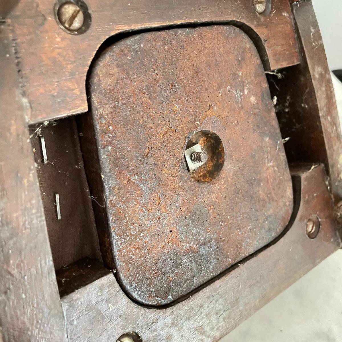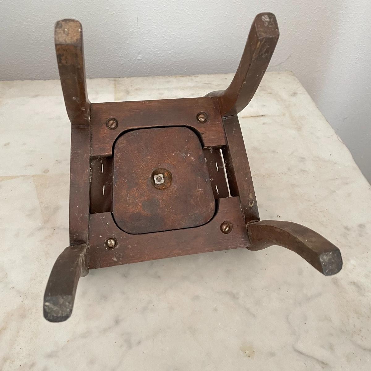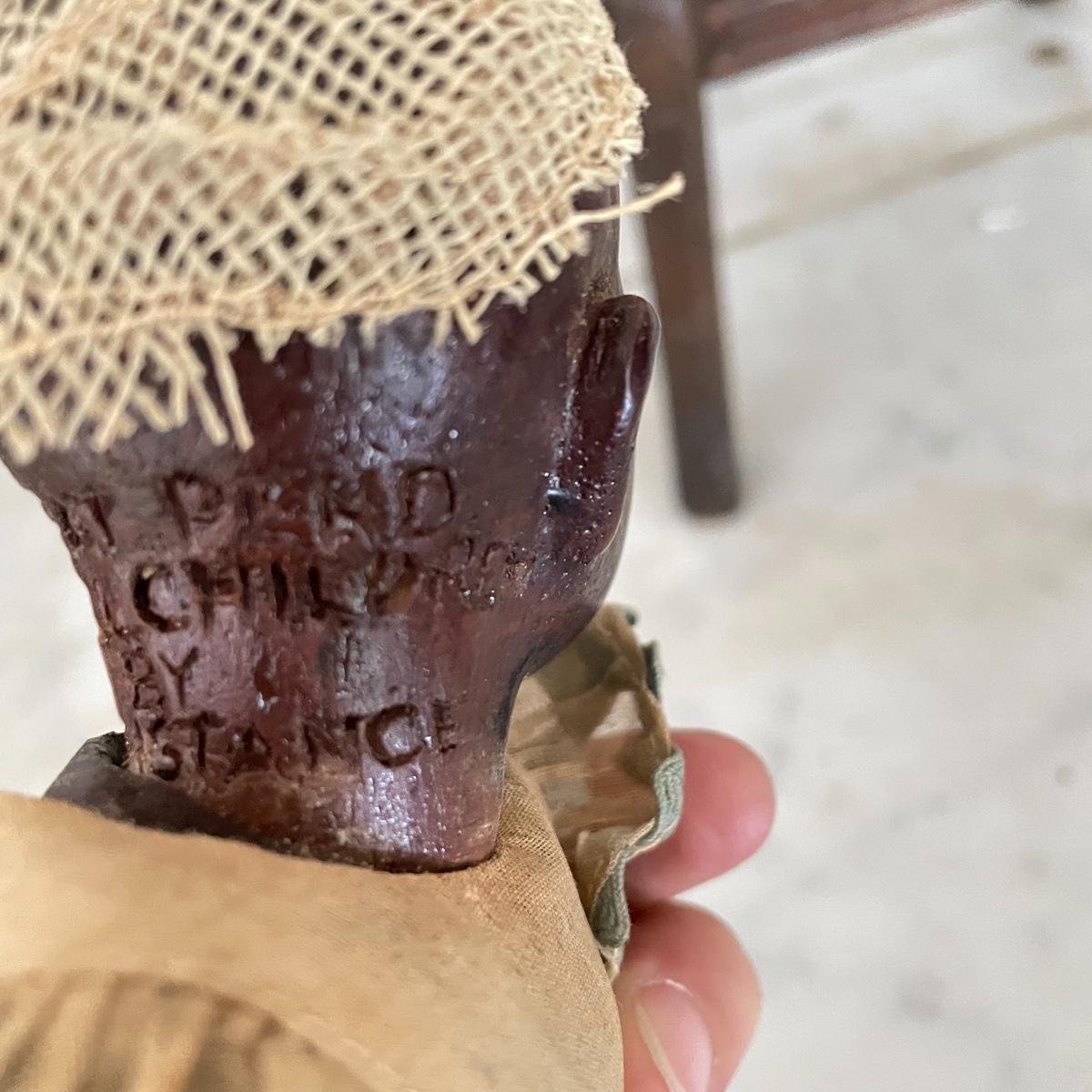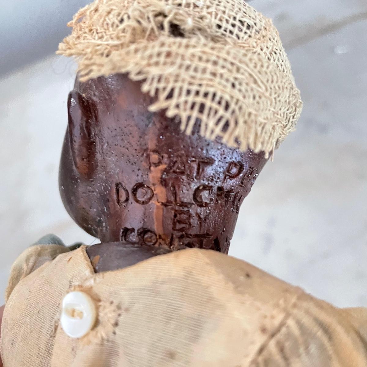 Vintage “Pat. Pend Doll Children by Constance” appears to be a carved and painted 13” wooden doll with mobile arms, head and legs. Doll has painted shoes, a glued cap and an aged dress. We’ve paired her with a miniature 12” tall wooden chair with a cast iron cushioned seat. Shipping available.