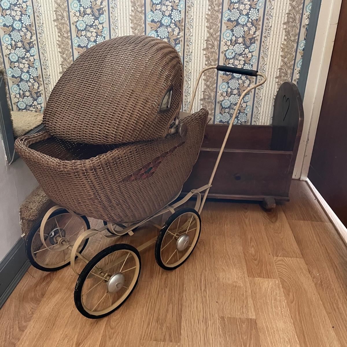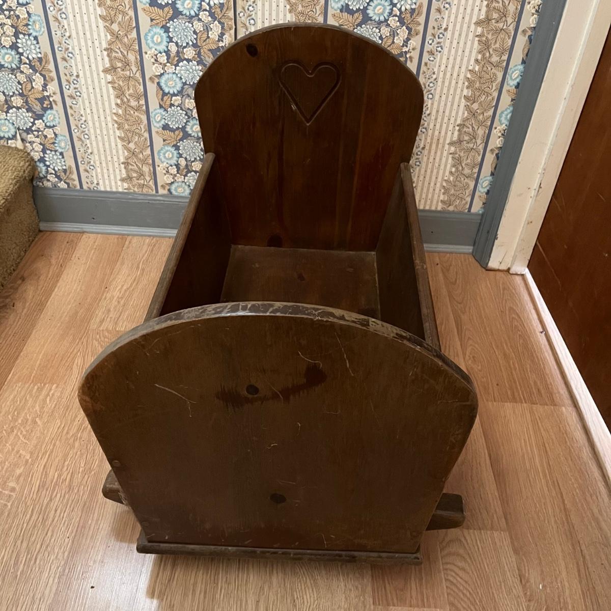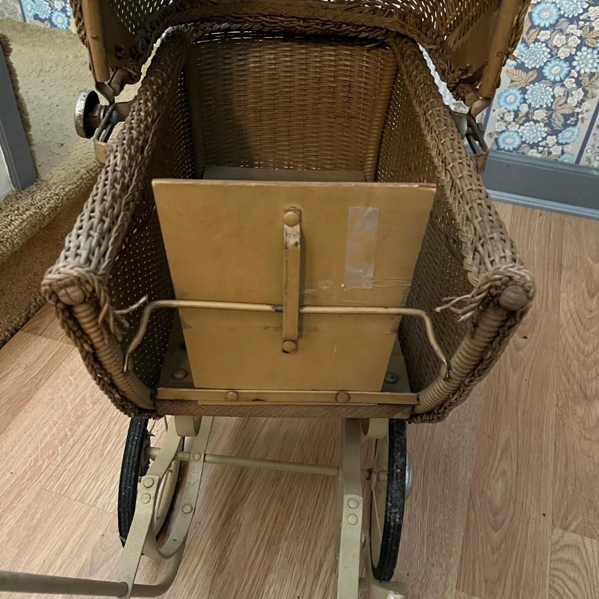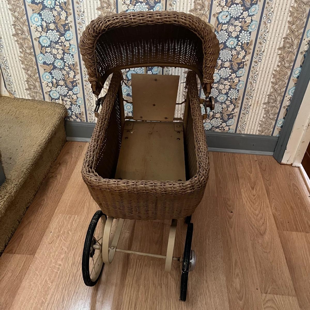Lot includes a wooden doll cradle with a heart carved on each end and a woven doll stroller with a metal frame and handle. Cradle measures 19” x 26” x 20”.