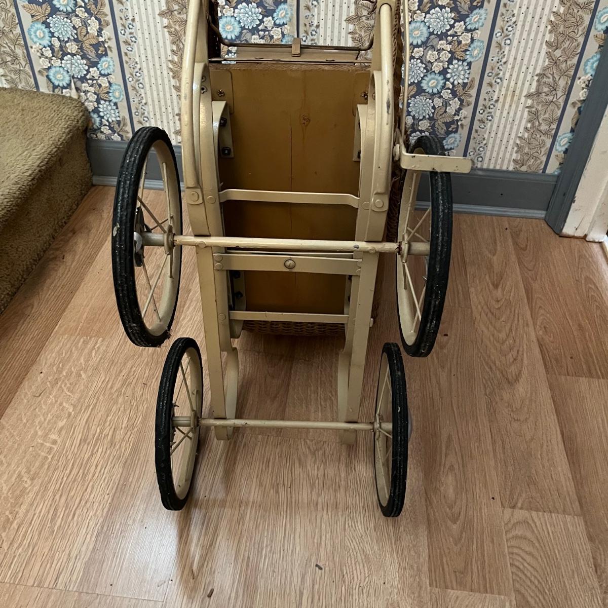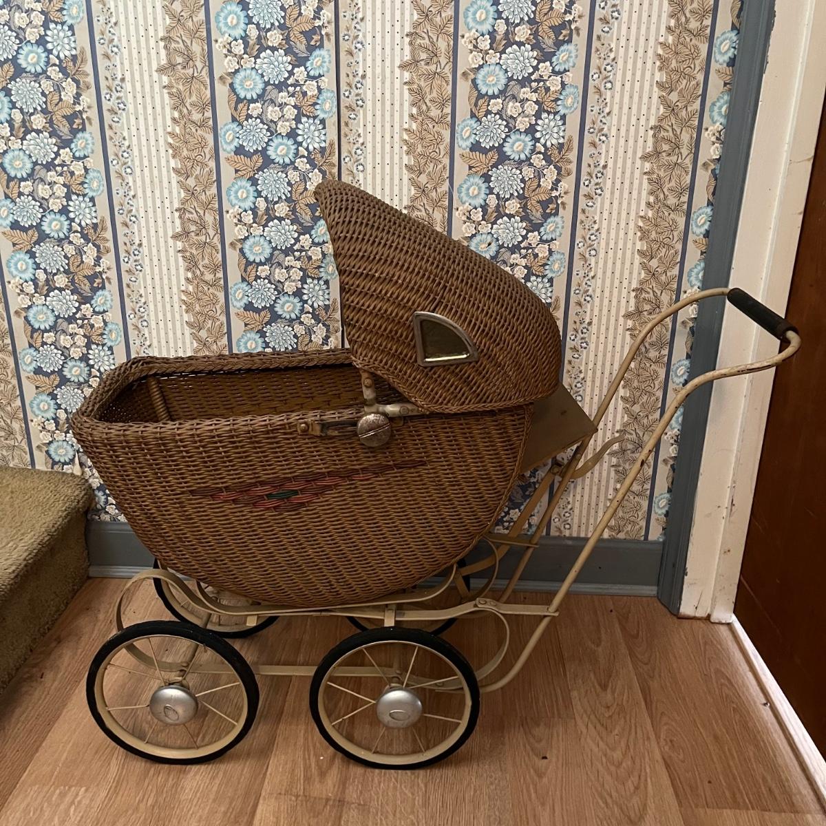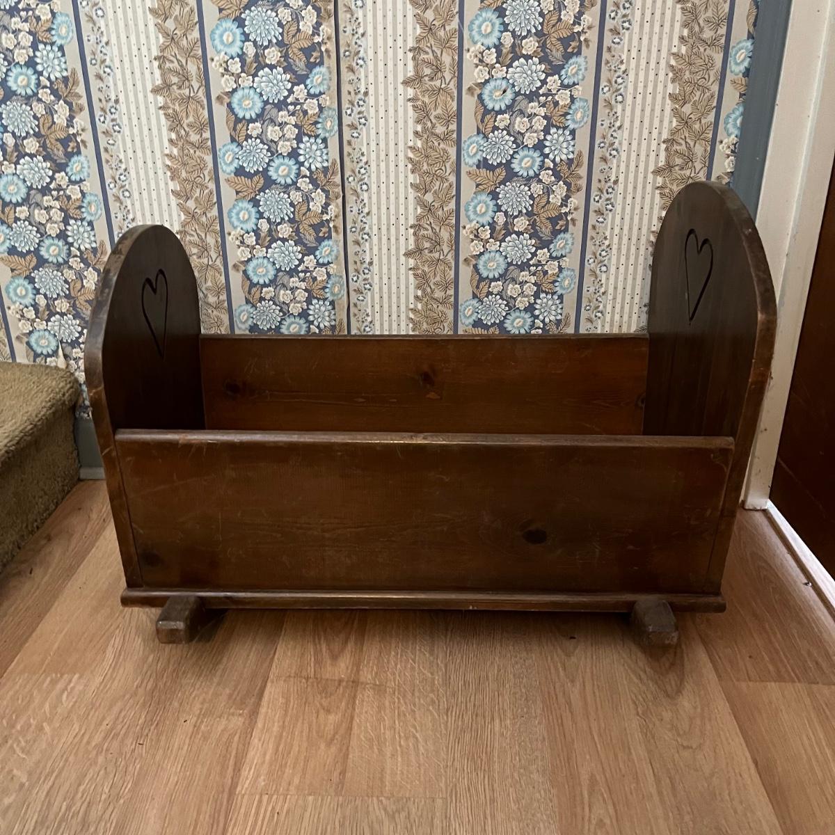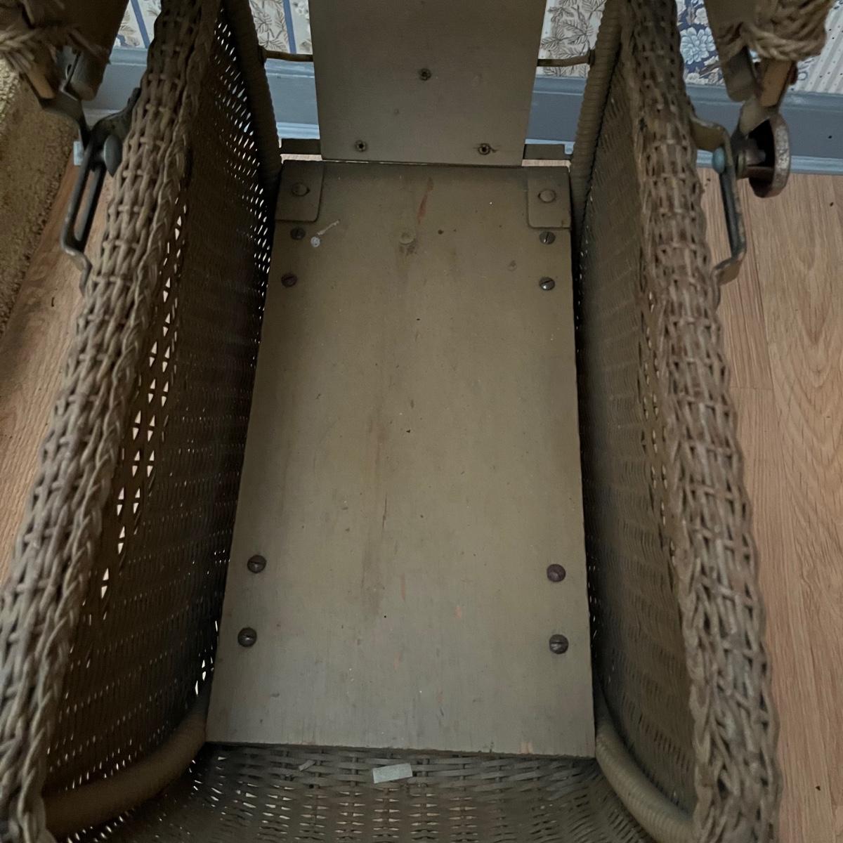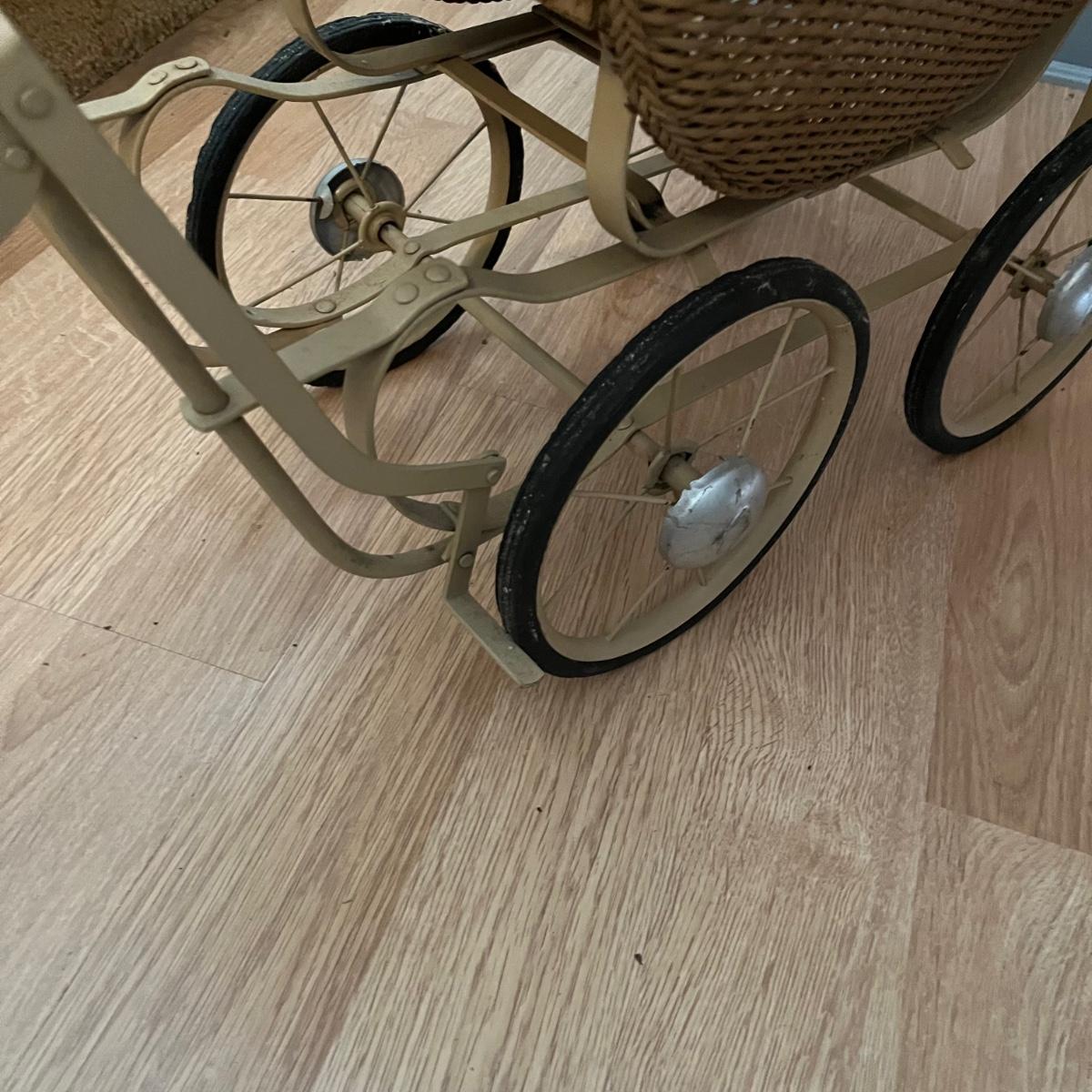 Lot includes a wooden doll cradle with a heart carved on each end and a woven doll stroller with a metal frame and handle. Cradle measures 19” x 26” x 20”.