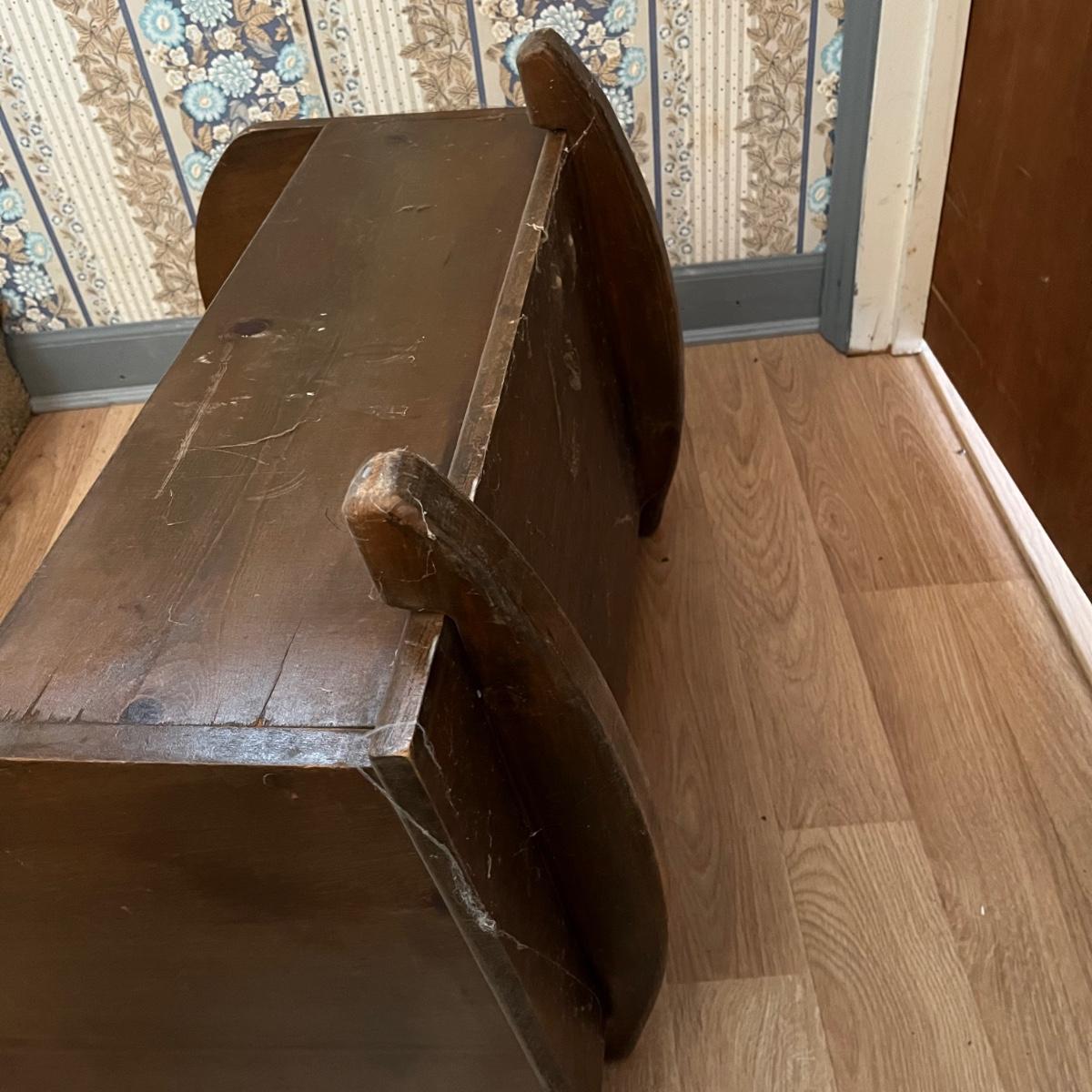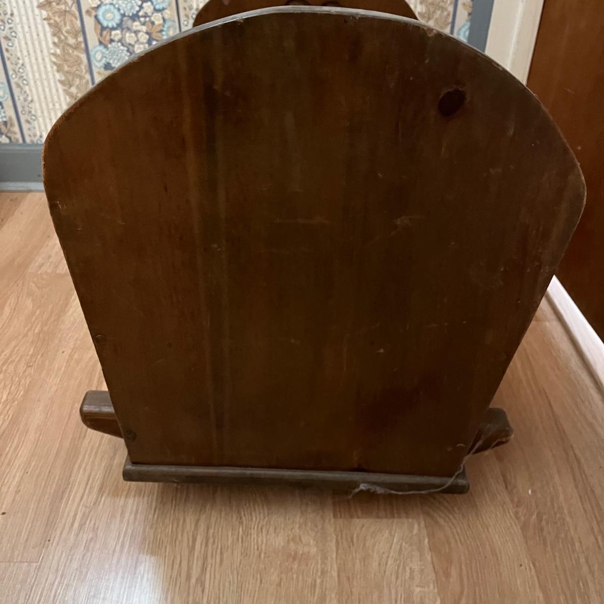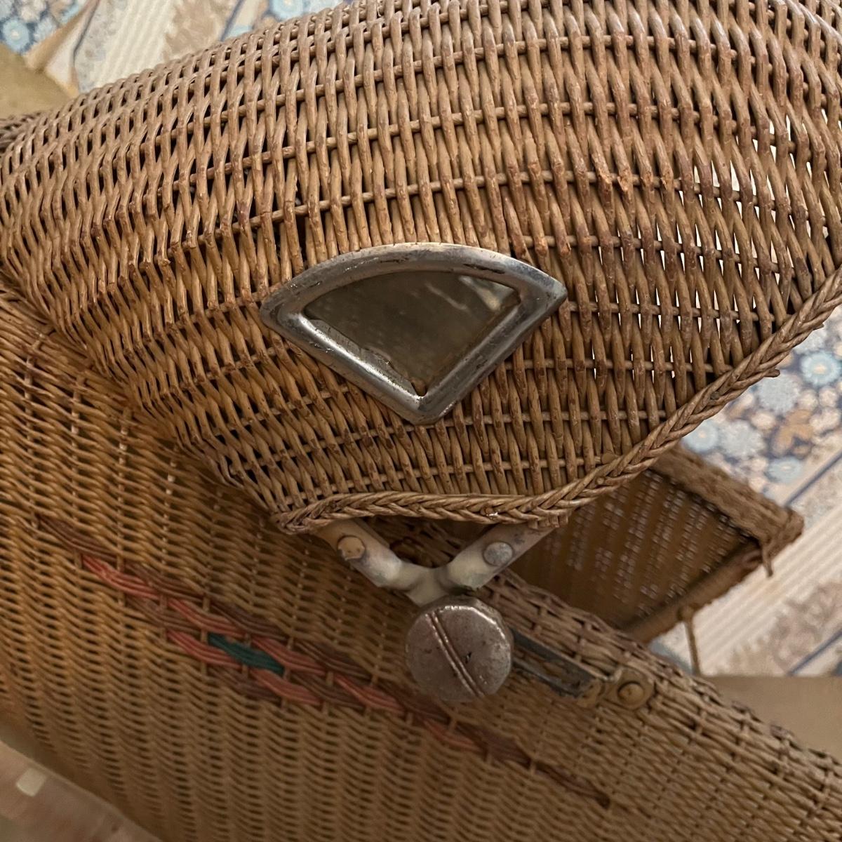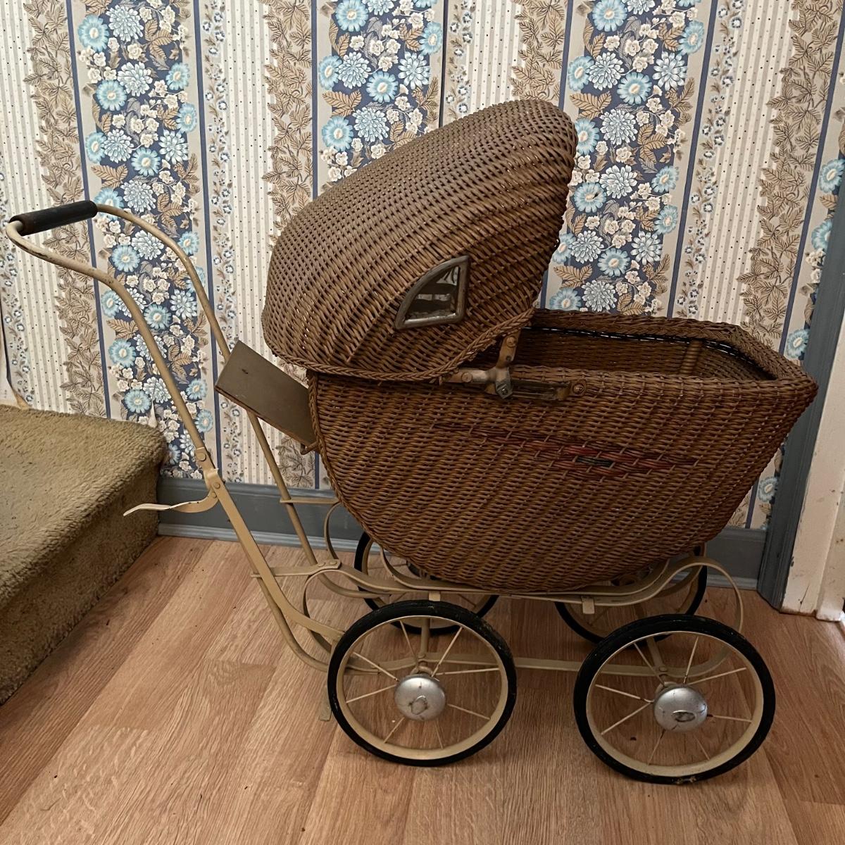 Lot includes a wooden doll cradle with a heart carved on each end and a woven doll stroller with a metal frame and handle. Cradle measures 19” x 26” x 20”.