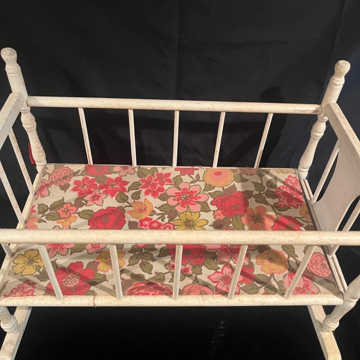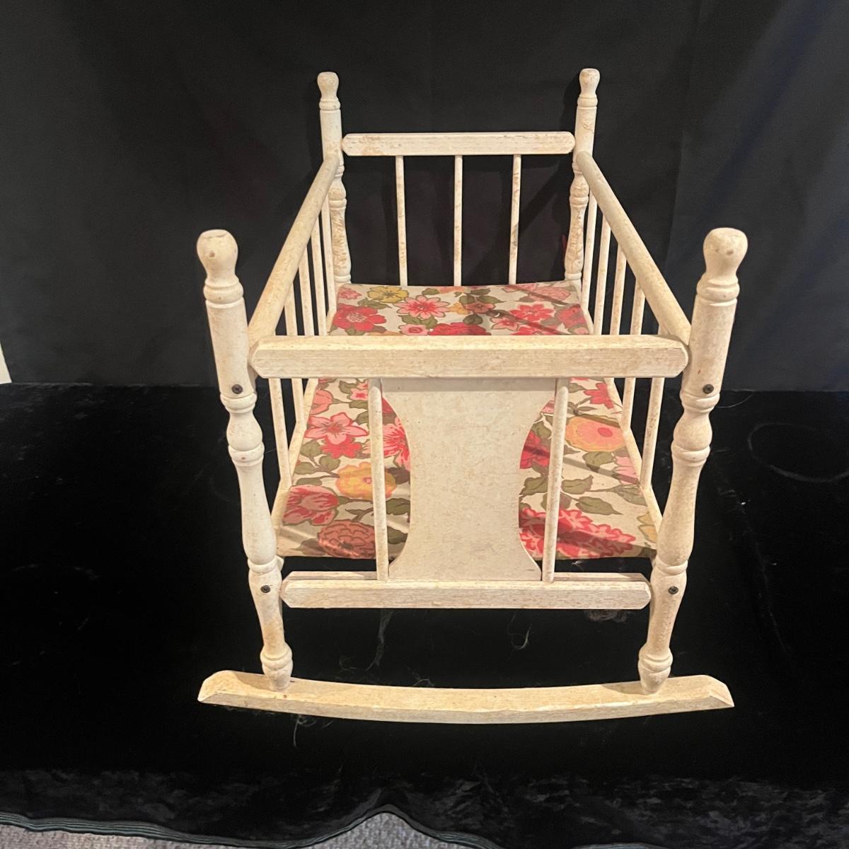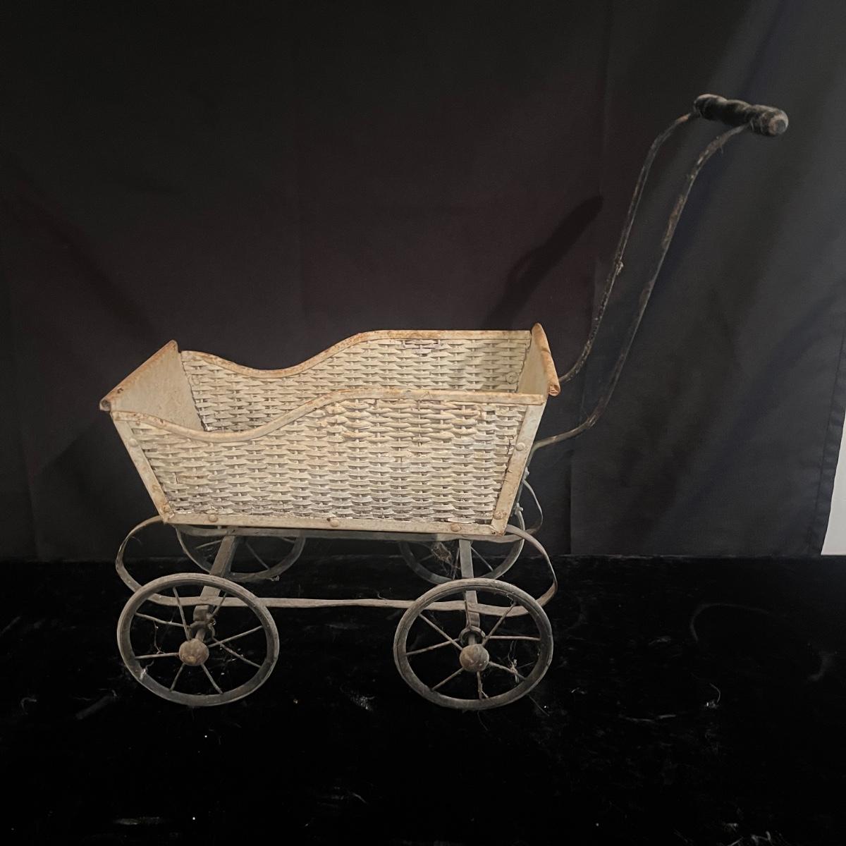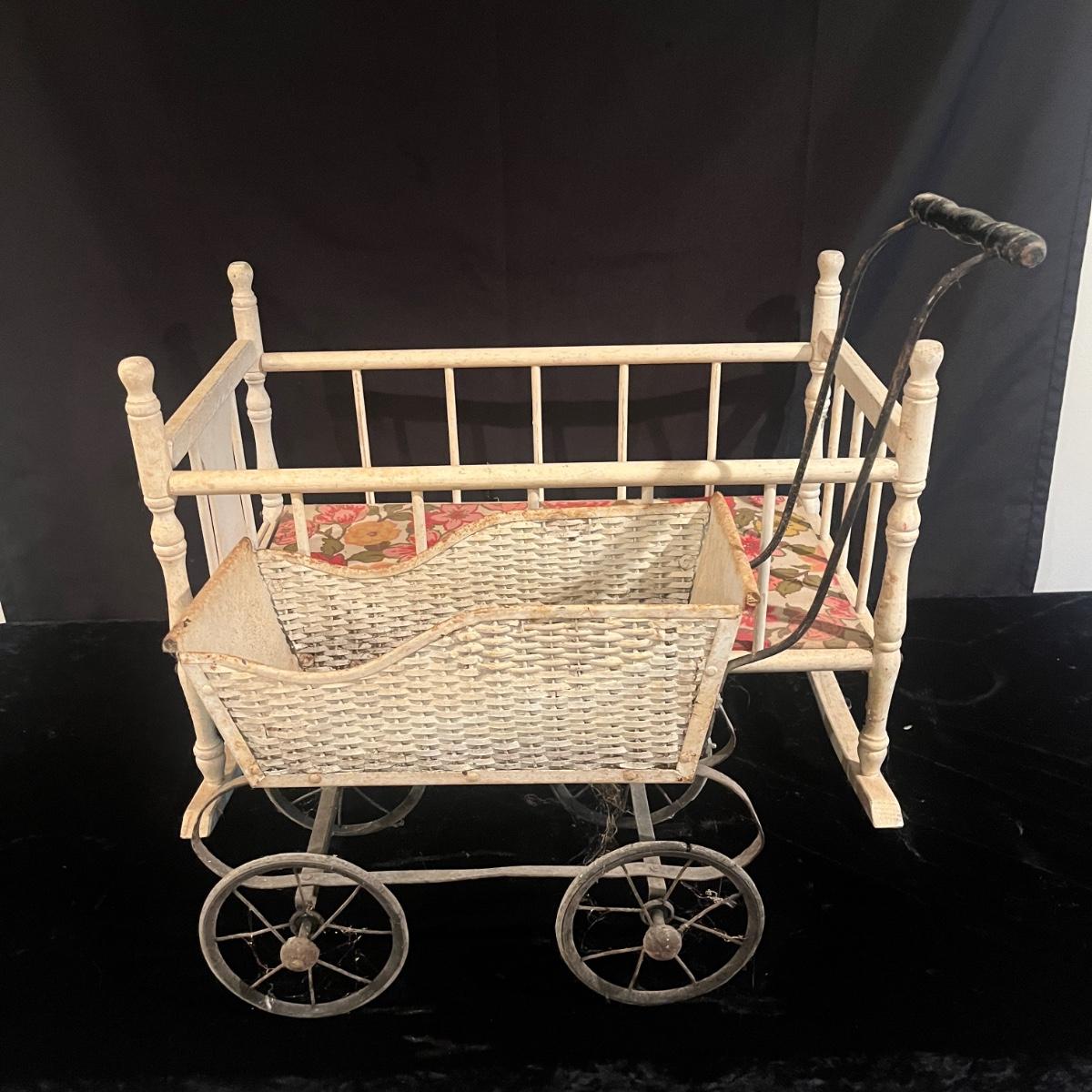 Lot includes a rocking wooden doll crib and a metal doll carriage with woven sides. Crib measures 19” x 26” x 19”H. Some condition issues due to age. Please see photos for details.