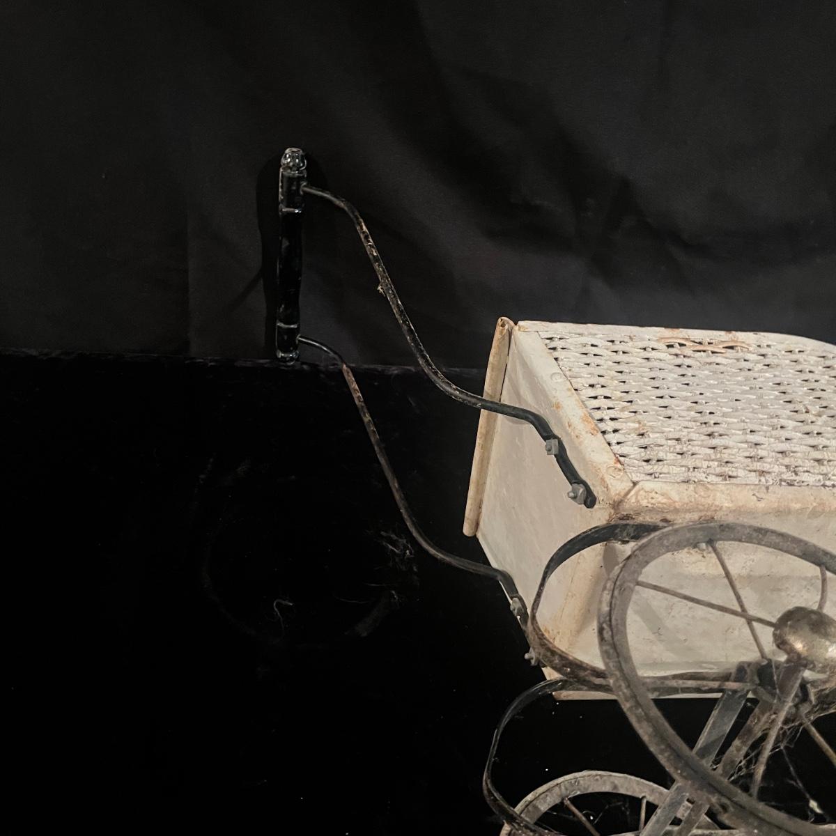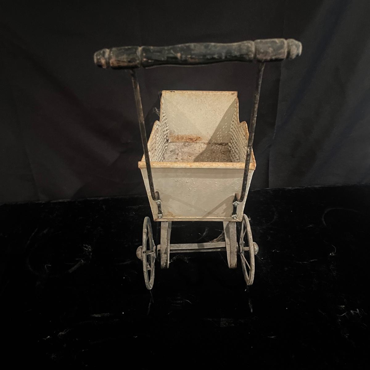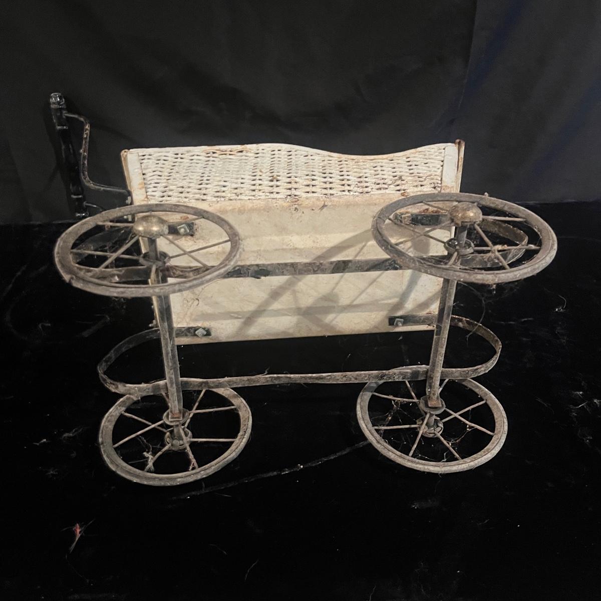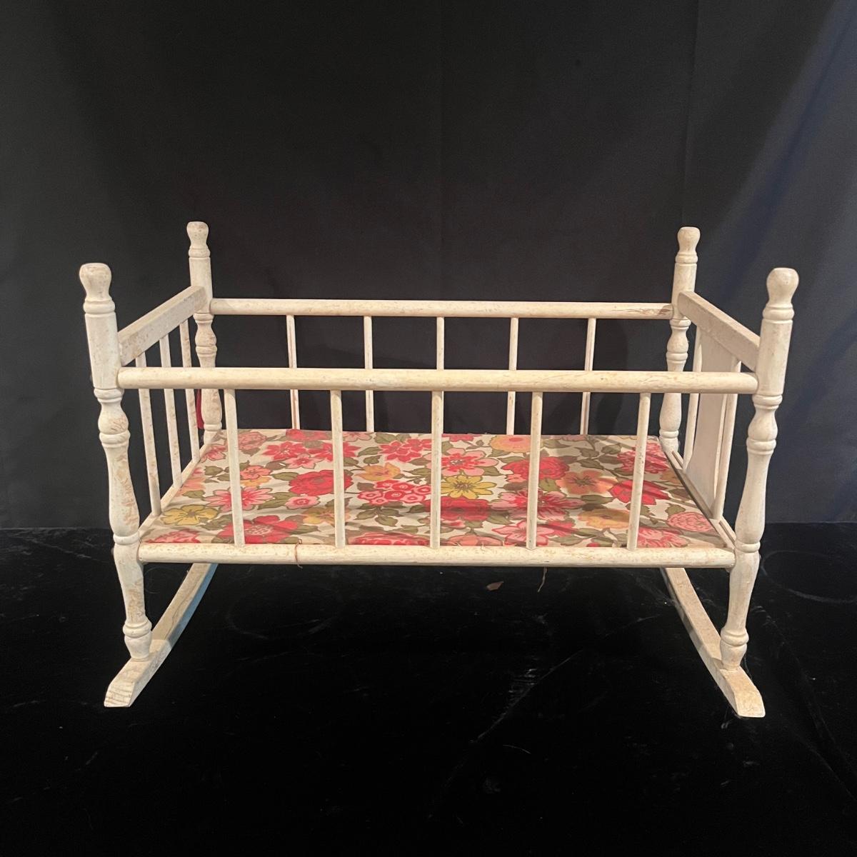 Lot includes a rocking wooden doll crib and a metal doll carriage with woven sides. Crib measures 19” x 26” x 19”H. Some condition issues due to age. Please see photos for details.