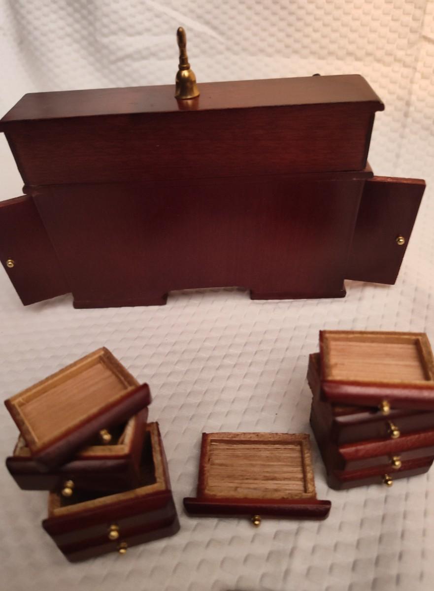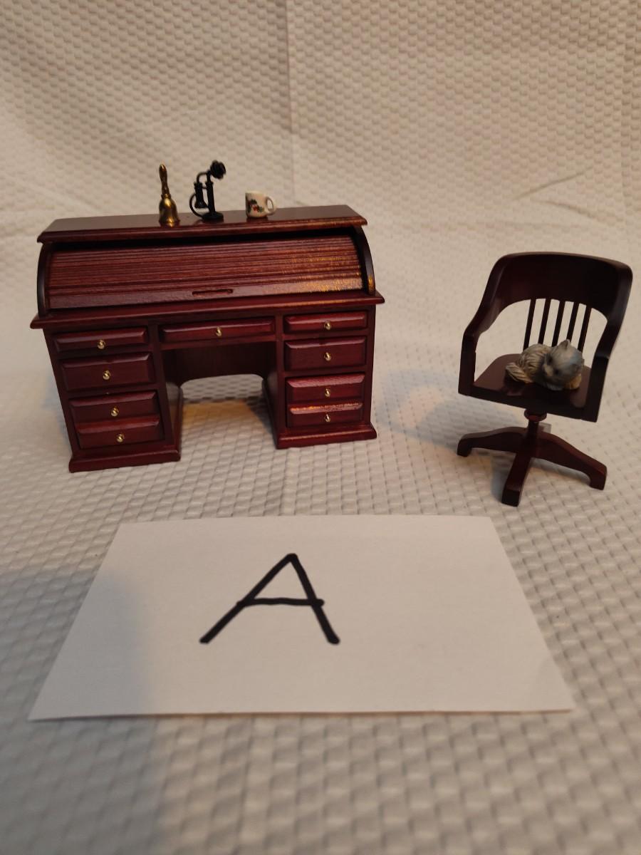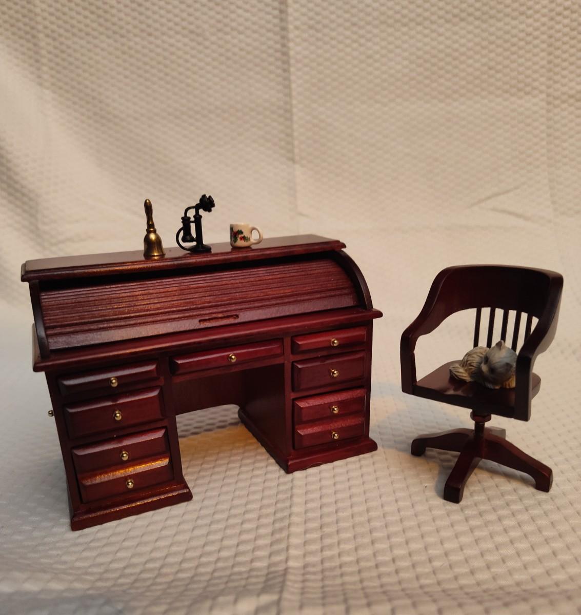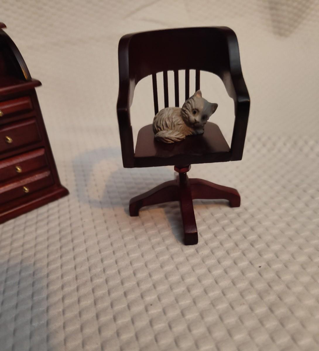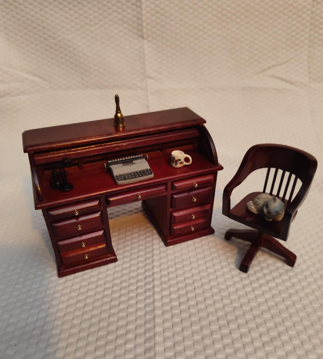 DOLLHOUSE FURNITURE, ROLL TOP DESK, CHAIR AND PHONE, COFFEE CUP, TYPEWRITER, AND KITTY