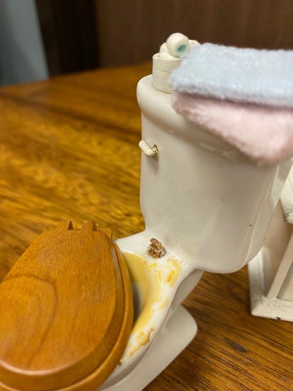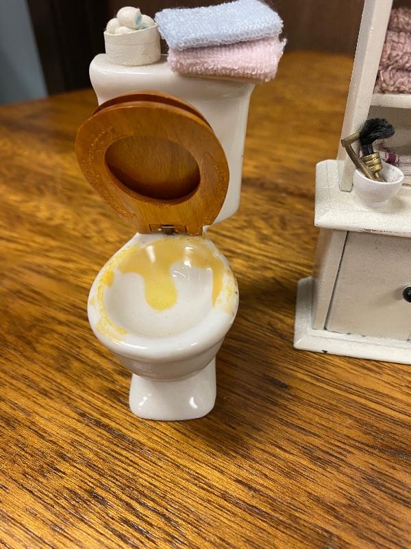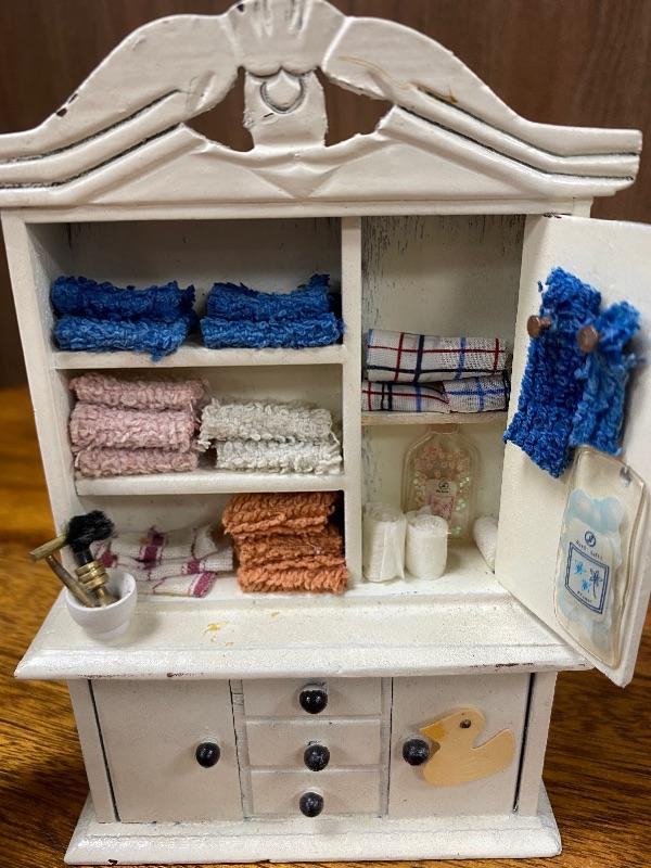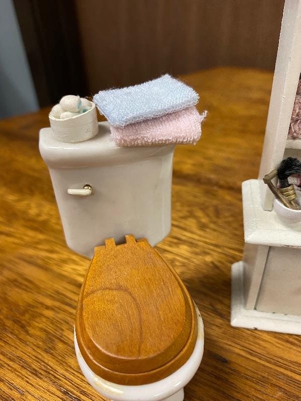 Pair of dollhouse miniatures bathroom fixtures. Included is a toilet and the towel closet. All of the accessories have been glued on to the pieces, they might be able to be removed. There is signs of glue on the toilet seat and the seat hinge is broken. Pieces are used.