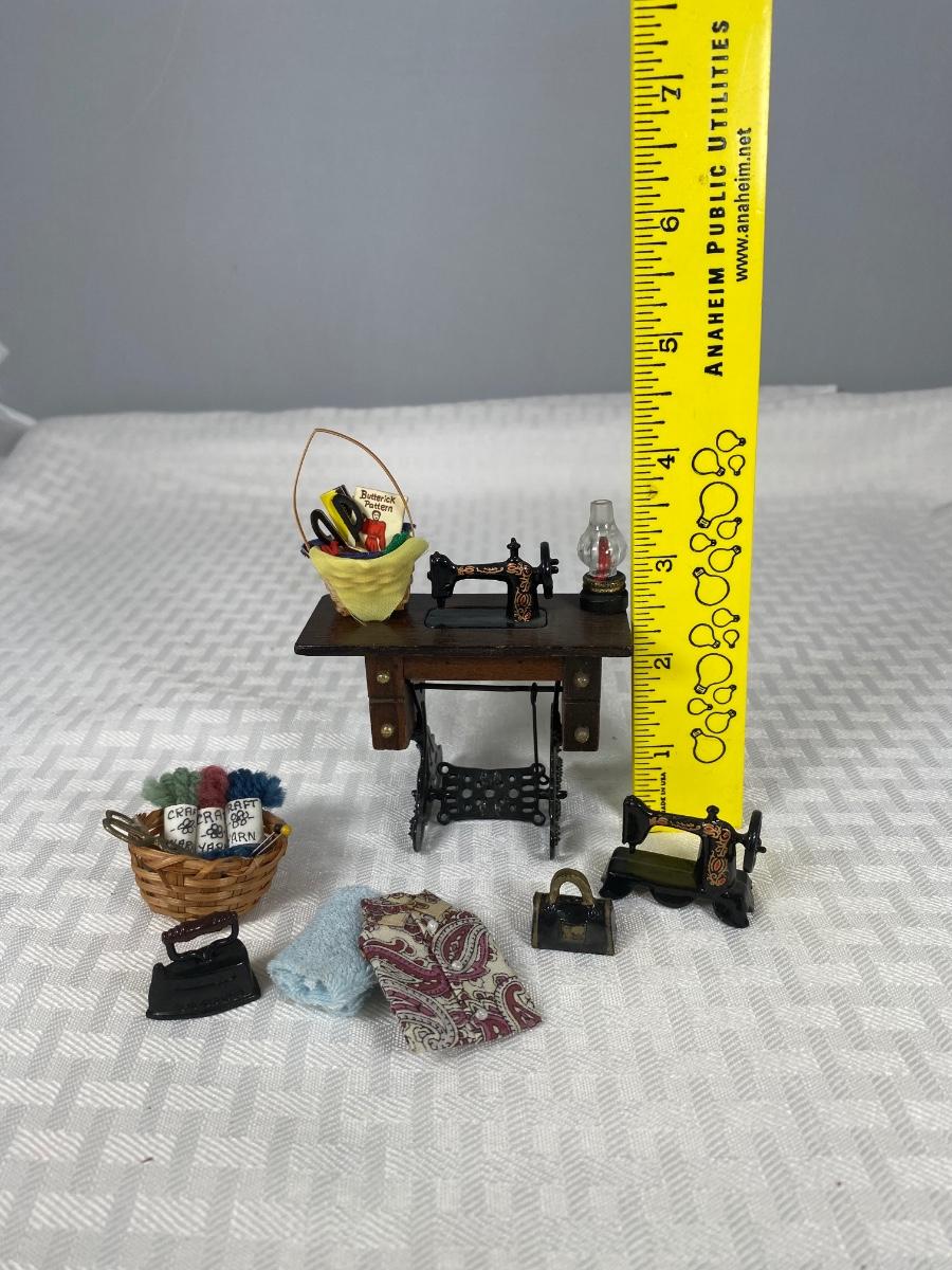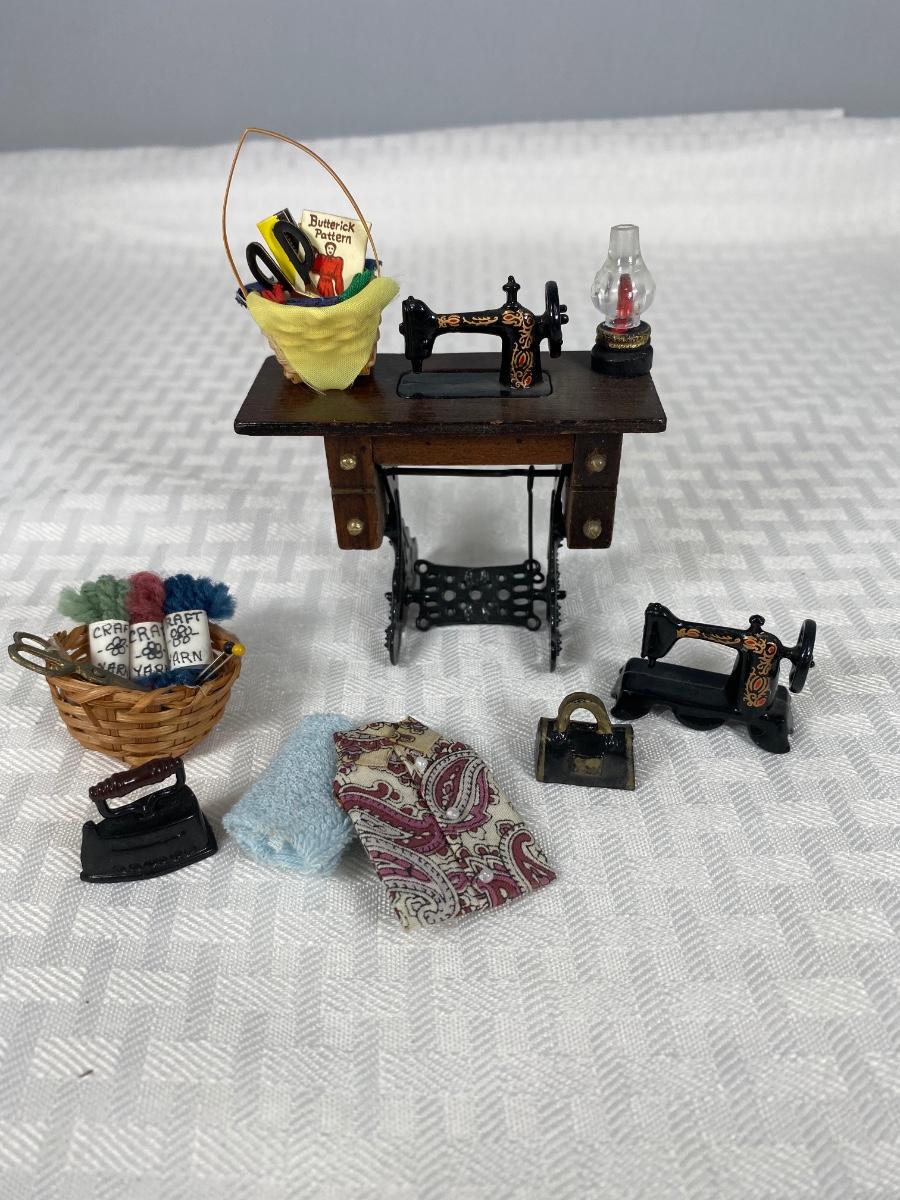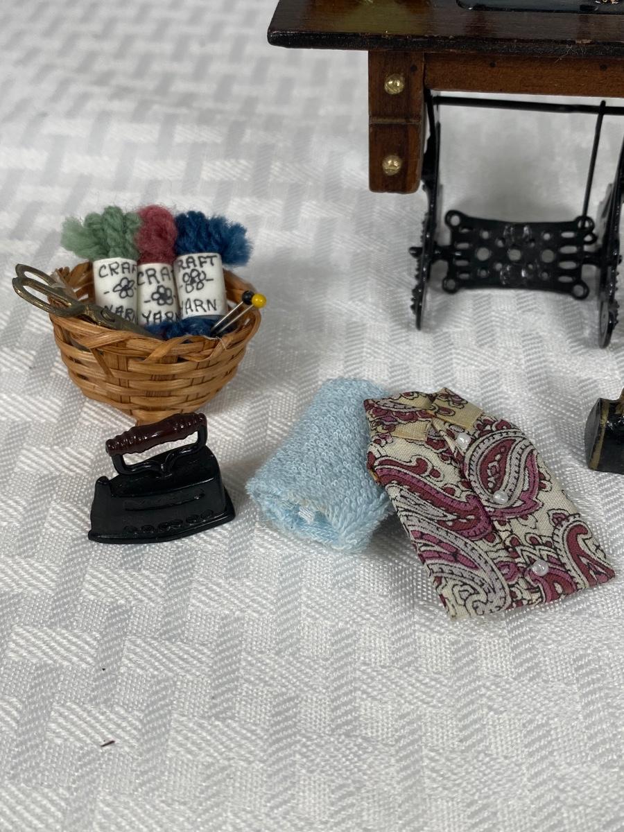 Doll House Miniatures Sewing Room Decor. Sewing machine, iron, and small black bag are metal.