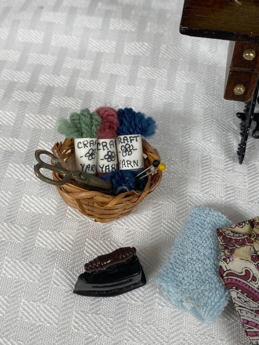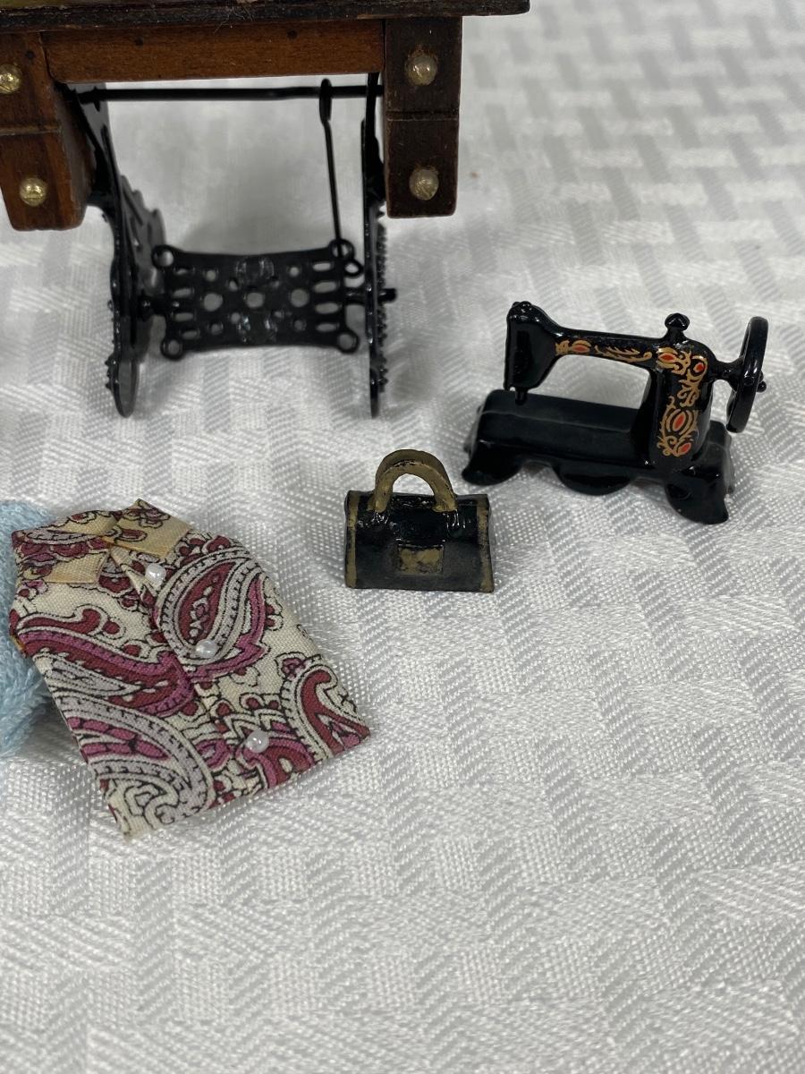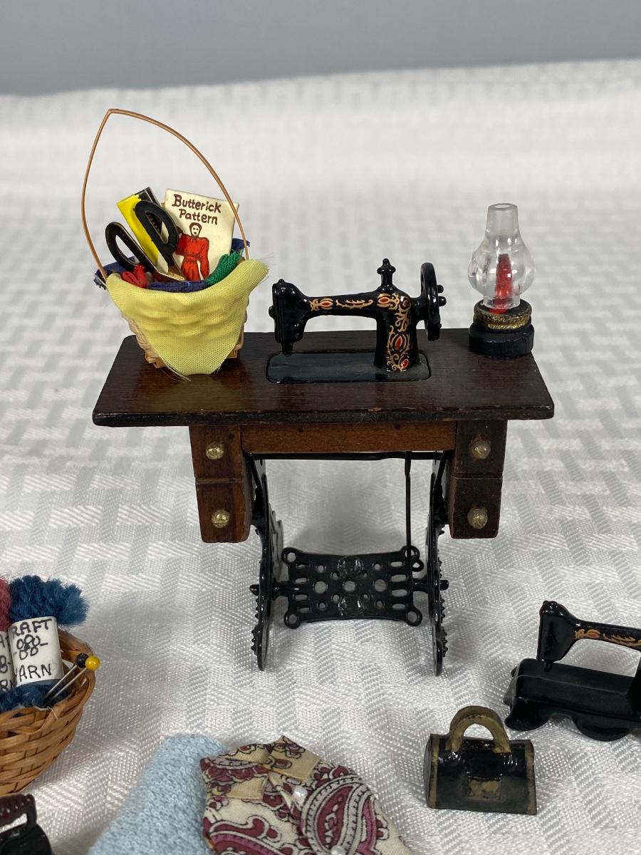 Doll House Miniatures Sewing Room Decor. Sewing machine, iron, and small black bag are metal.
