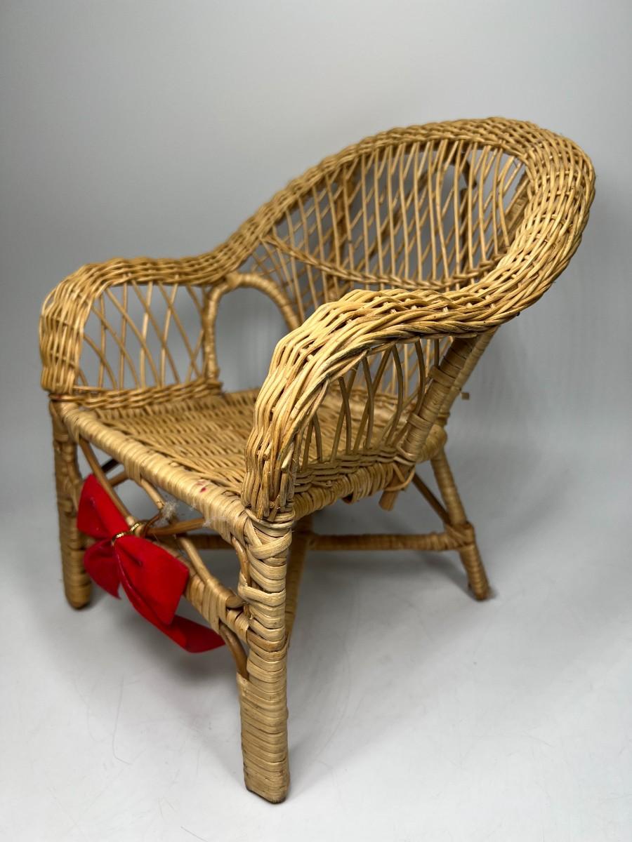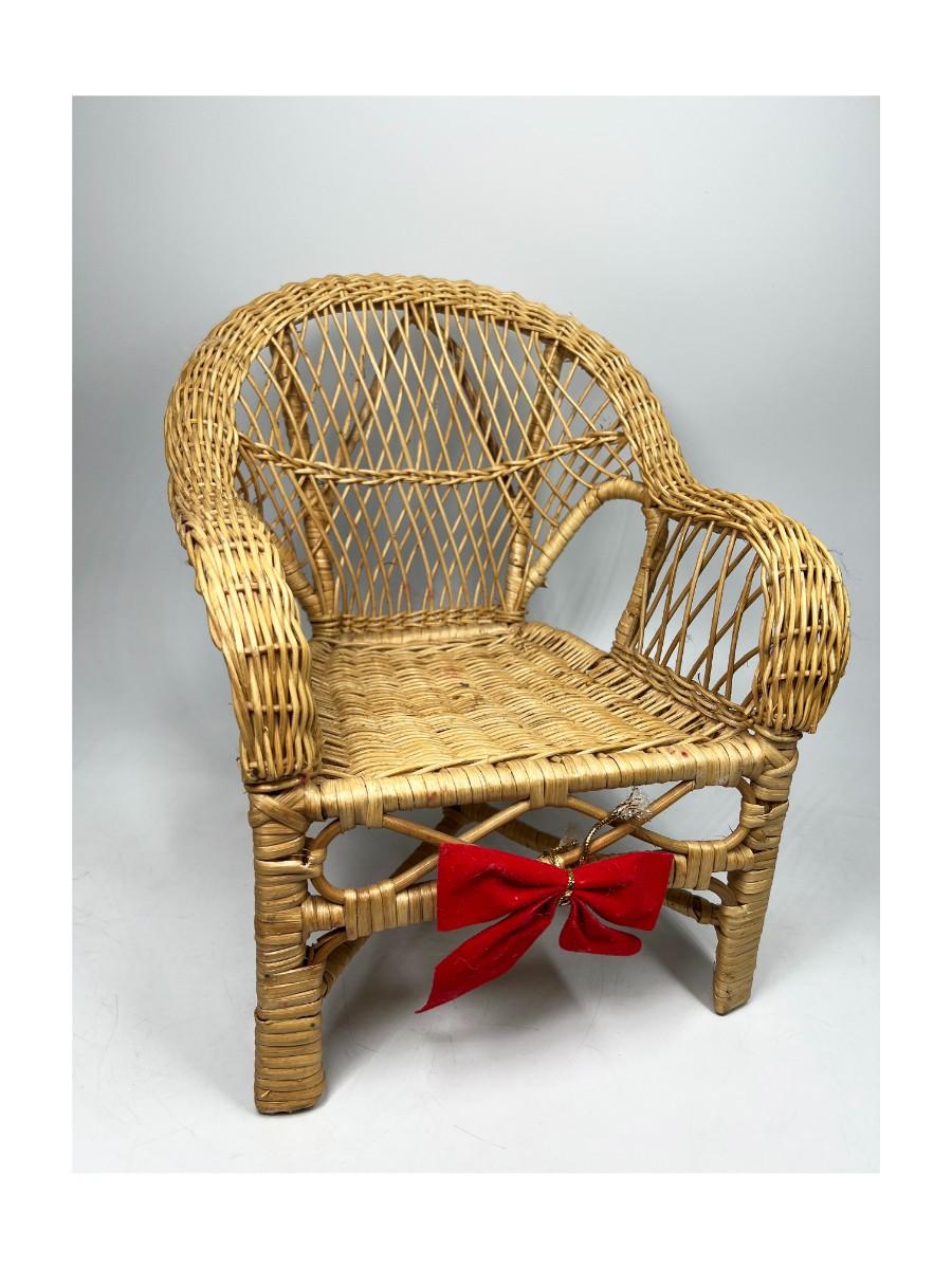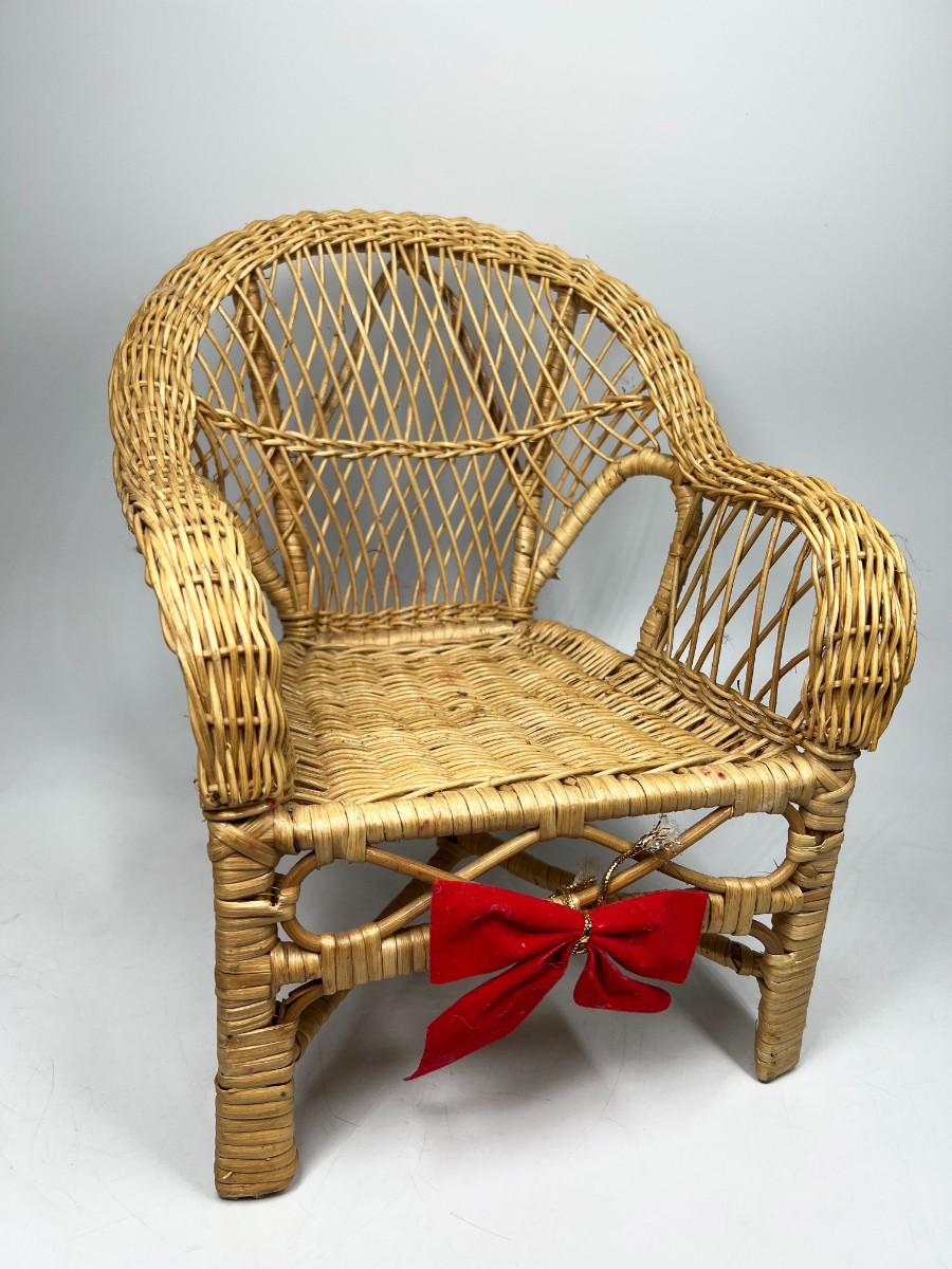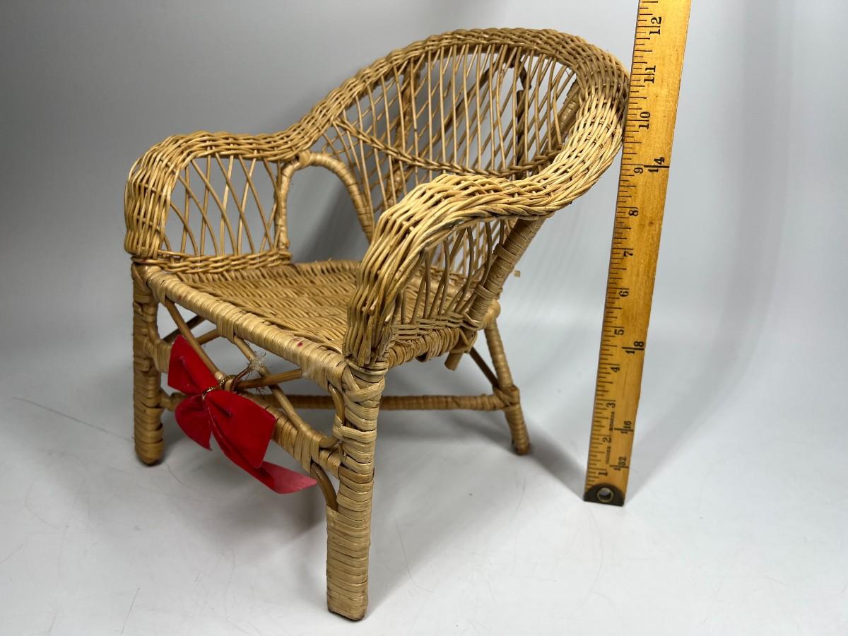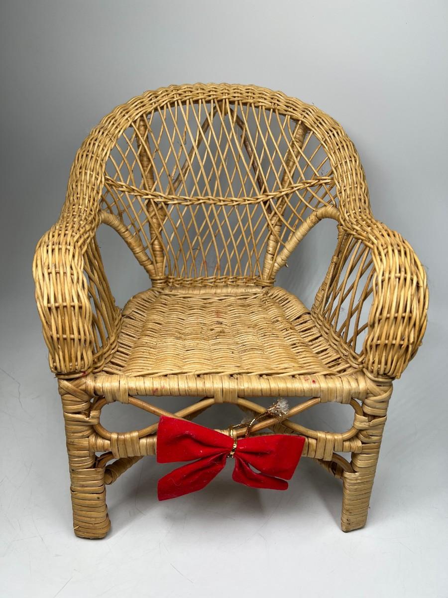 Doll Size Wicker Rattan Arm Chair. In good condition, bow can be removed.