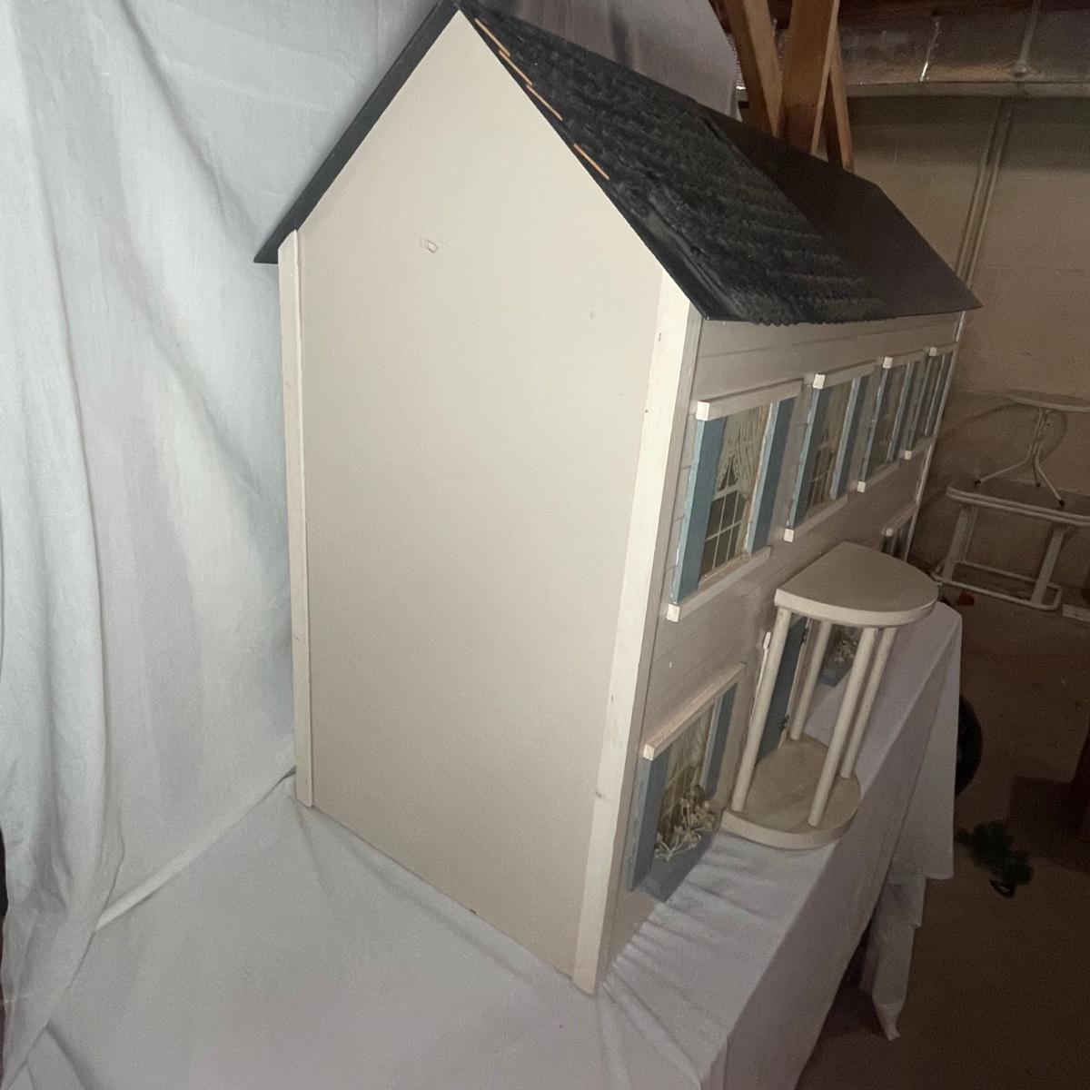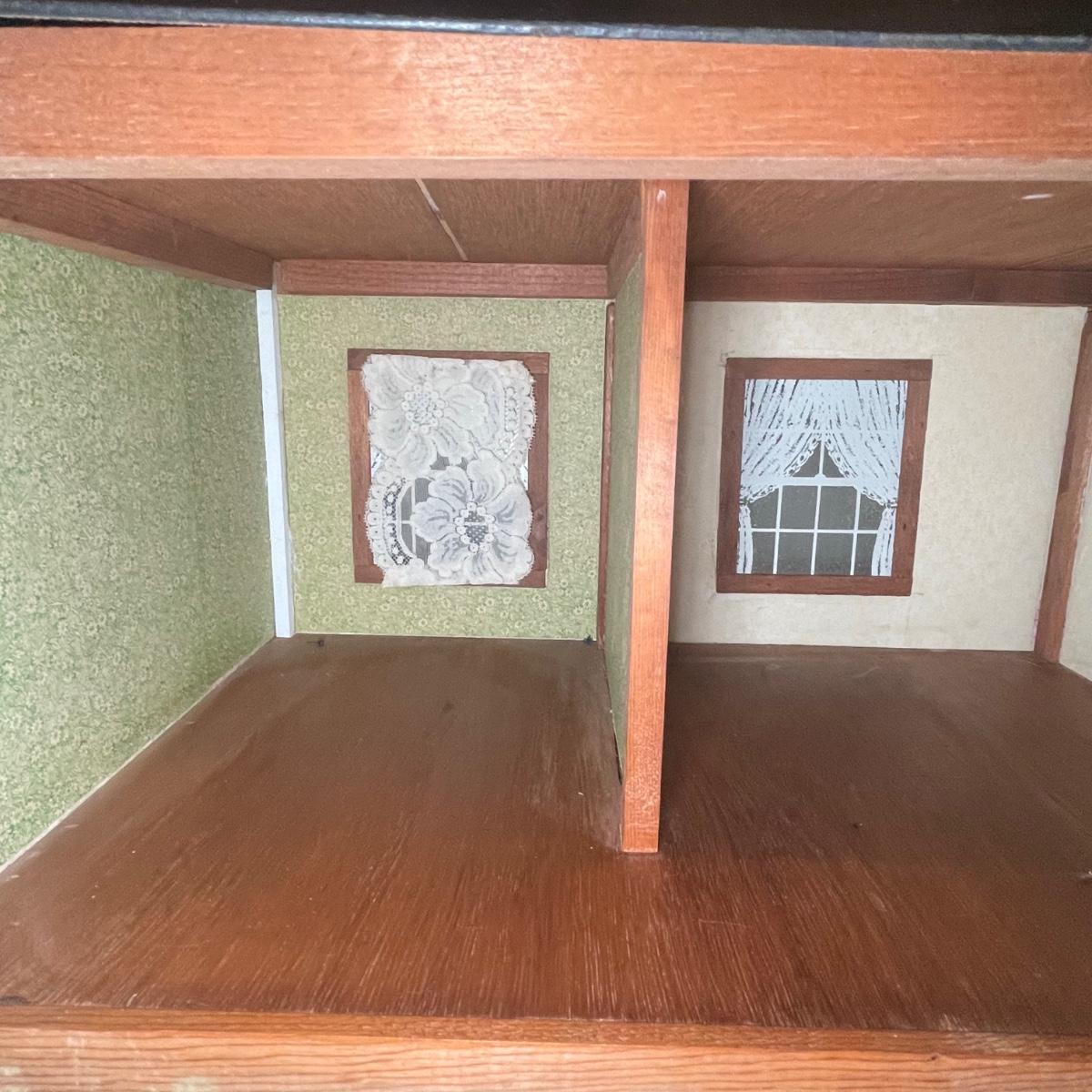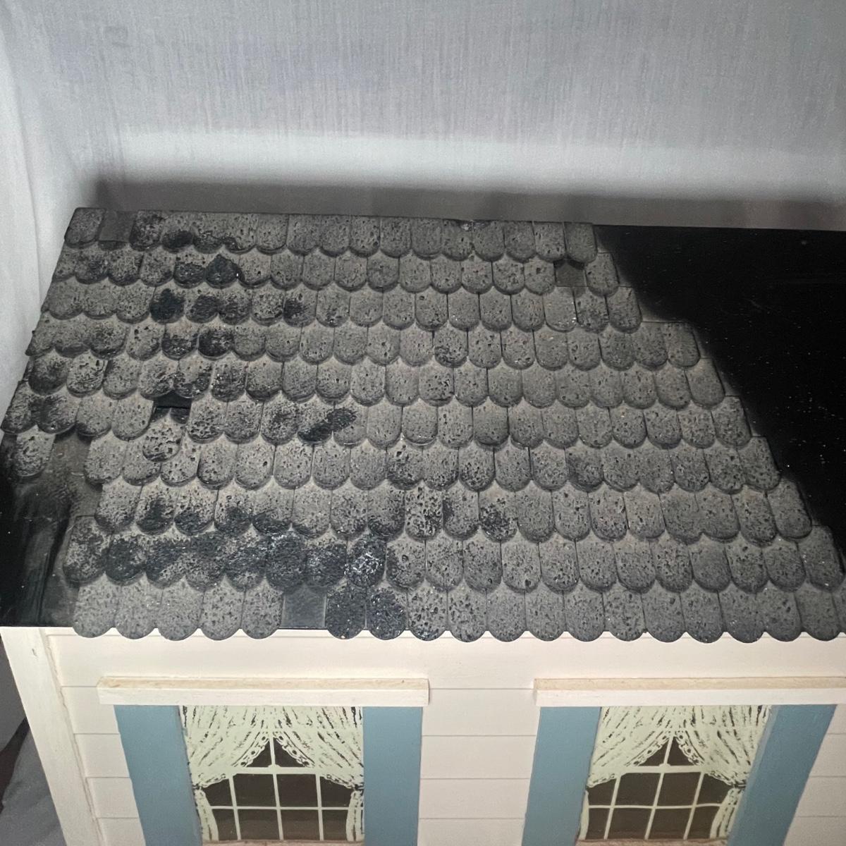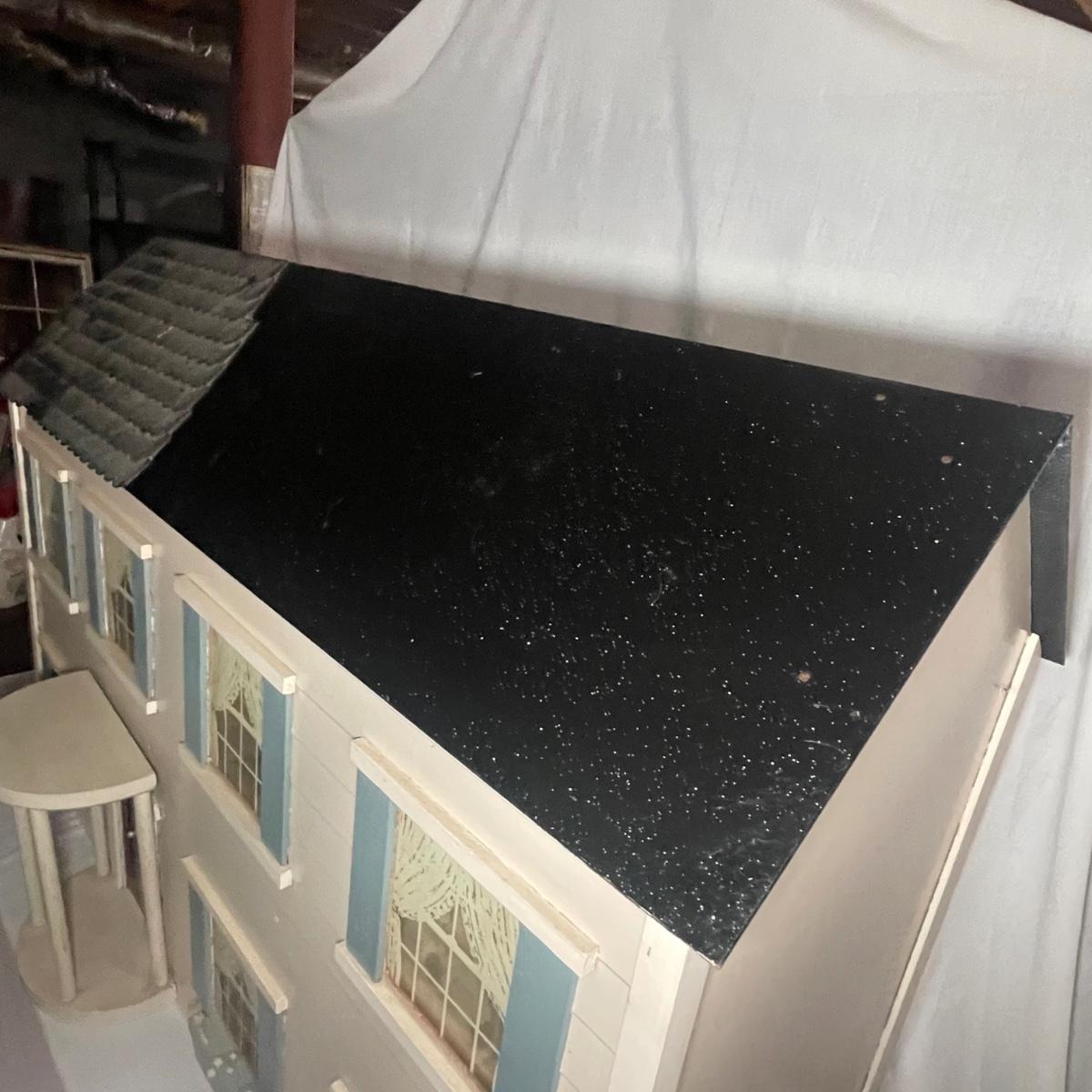 This adorable dollhouse is in good condition. It is missing a lot of shingles, though the ones it has are lightly stuck on so could easily be removed. One piece of exterior trim has broken off, see image. The house is made from thin plywood. Amazing dollhouse furniture can be found in another lot in this sale.