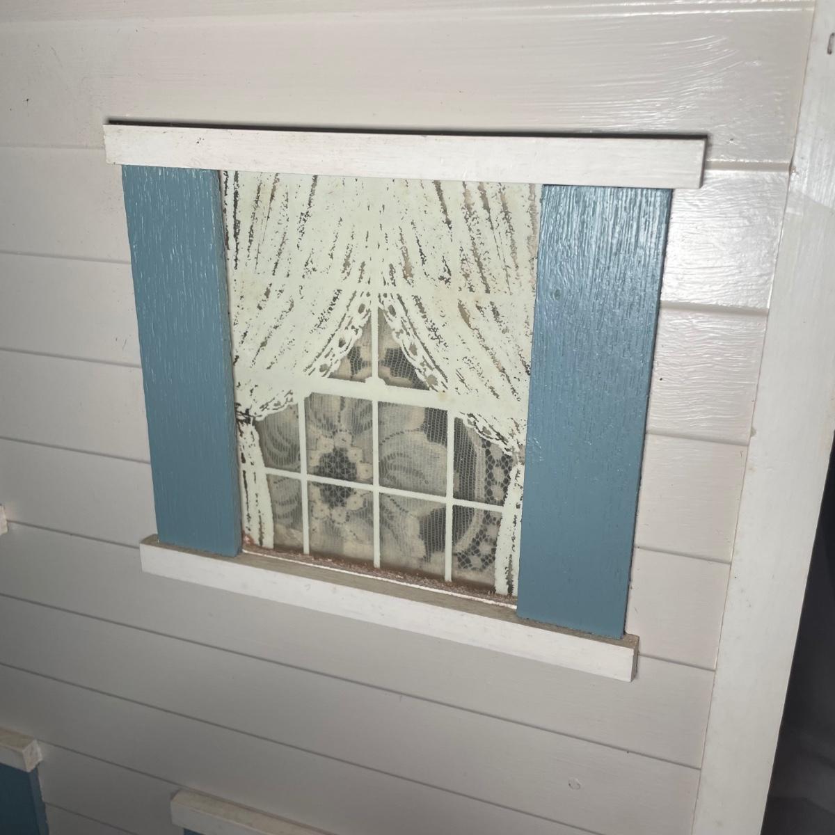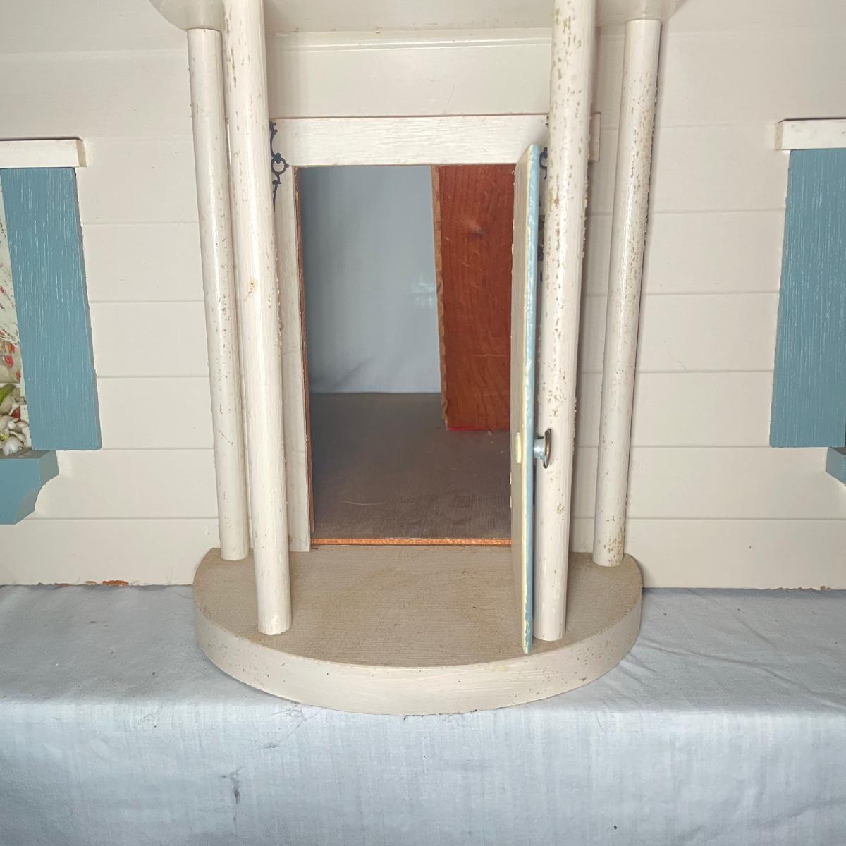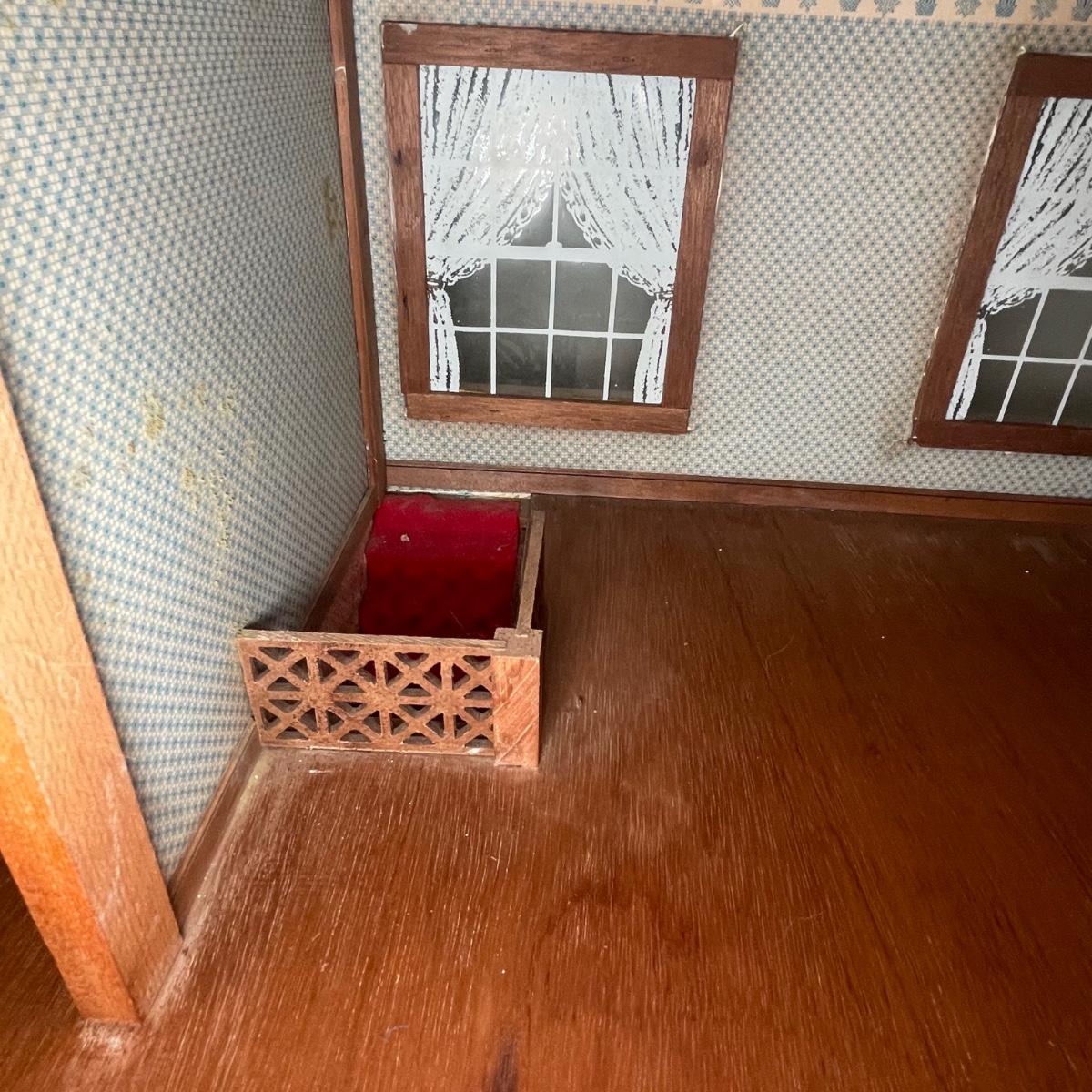 This adorable dollhouse is in good condition. It is missing a lot of shingles, though the ones it has are lightly stuck on so could easily be removed. One piece of exterior trim has broken off, see image. The house is made from thin plywood. Amazing dollhouse furniture can be found in another lot in this sale.