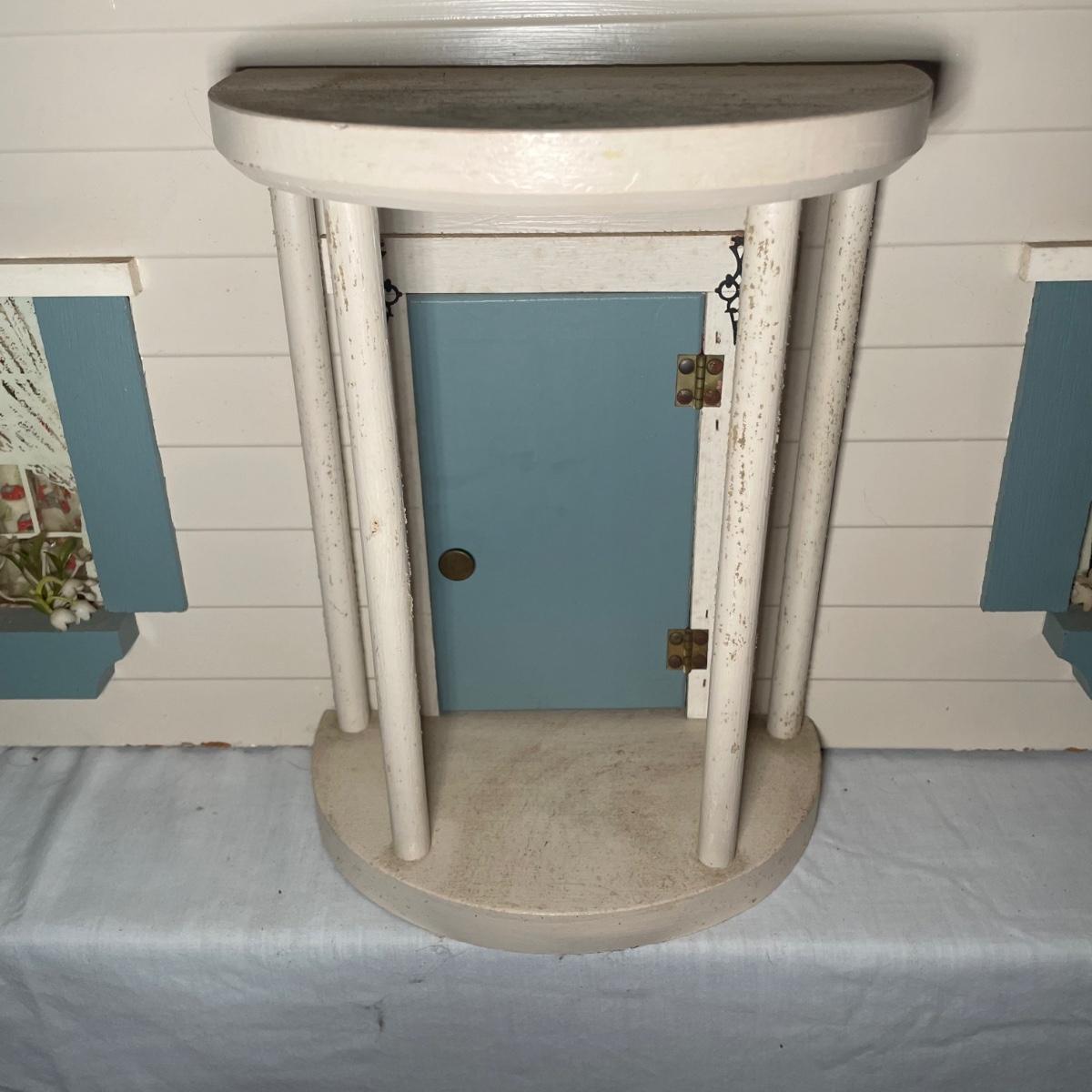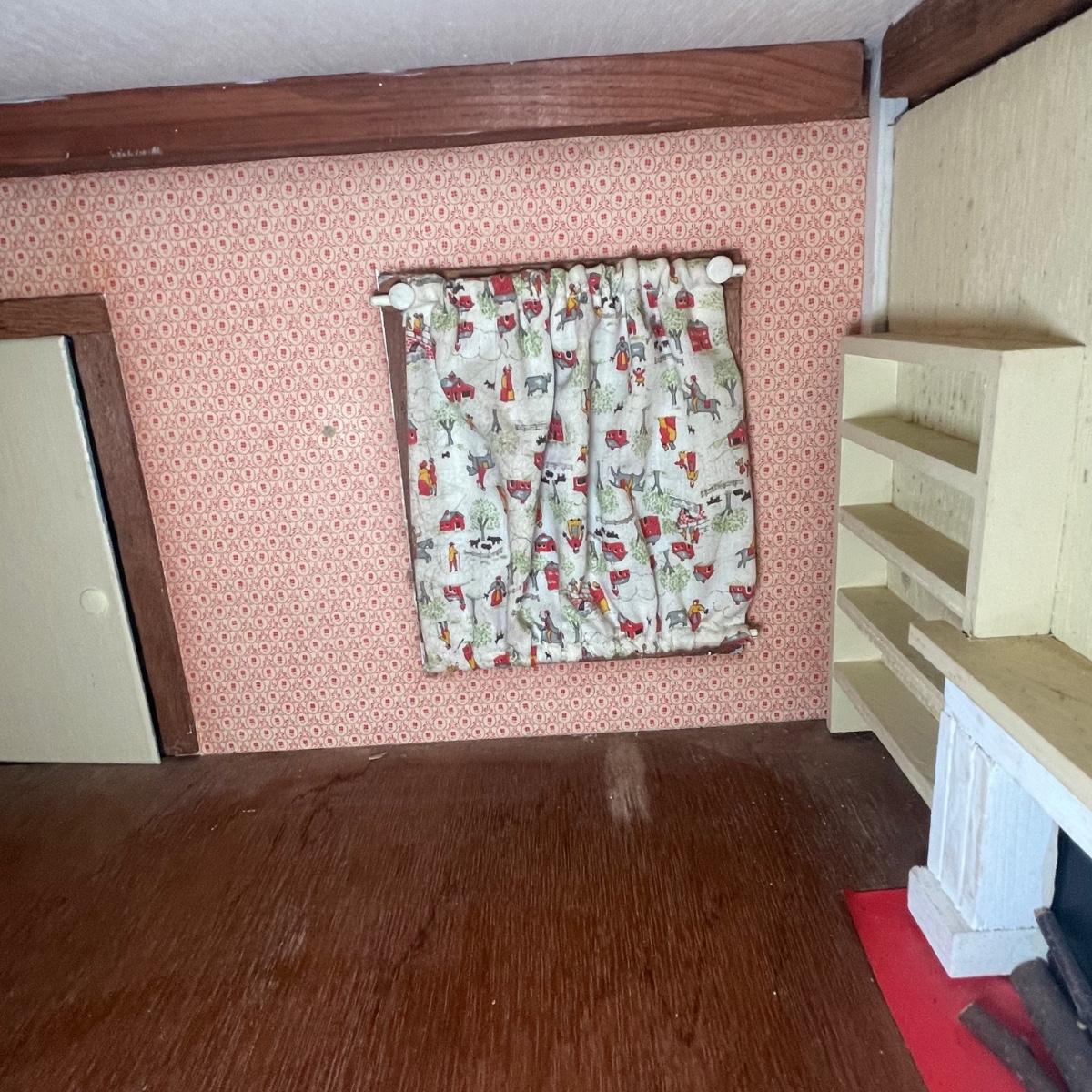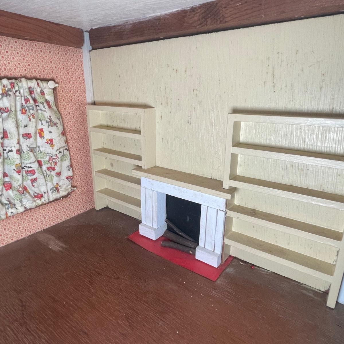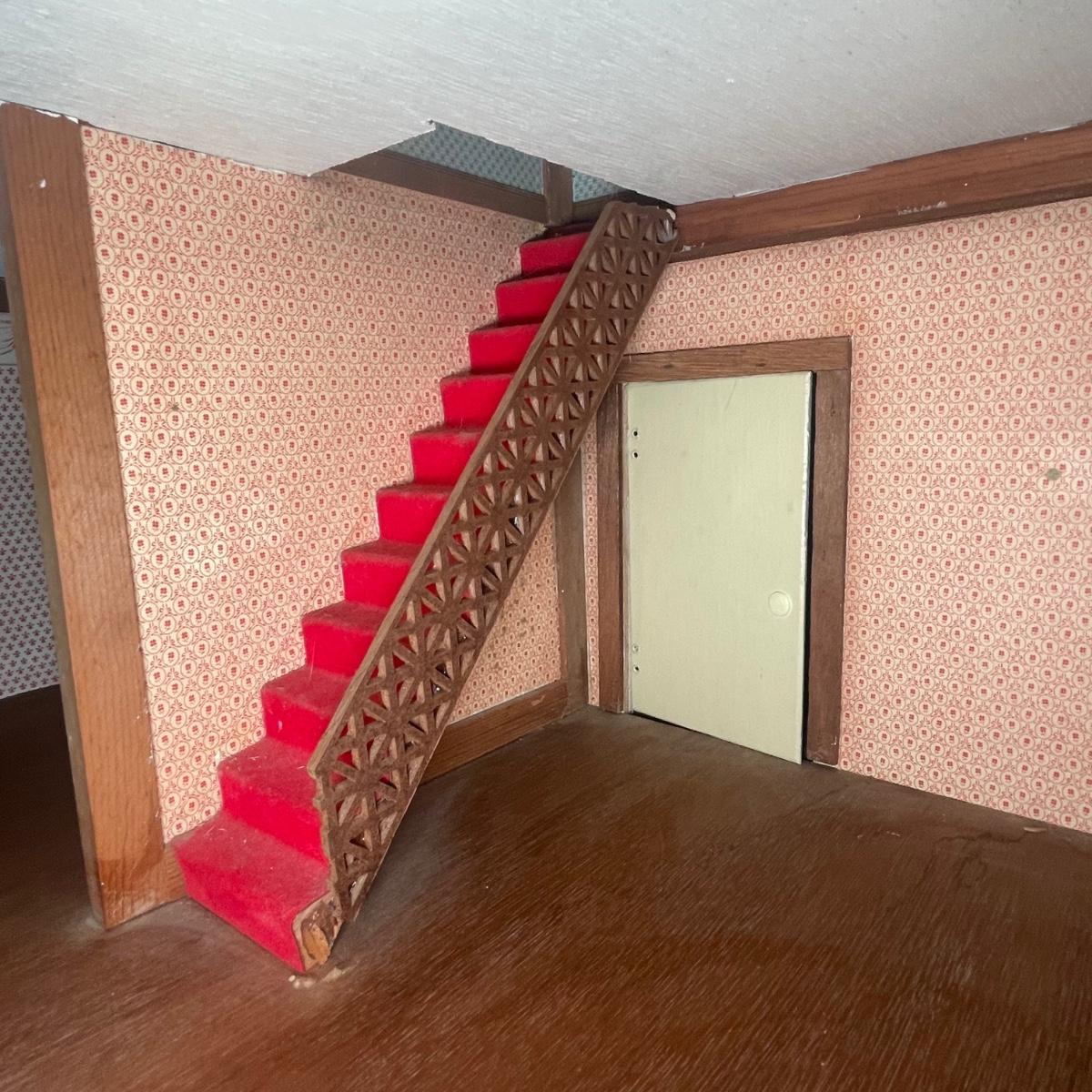 This adorable dollhouse is in good condition. It is missing a lot of shingles, though the ones it has are lightly stuck on so could easily be removed. One piece of exterior trim has broken off, see image. The house is made from thin plywood. Amazing dollhouse furniture can be found in another lot in this sale.