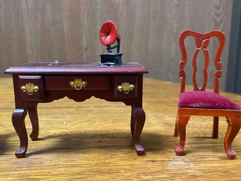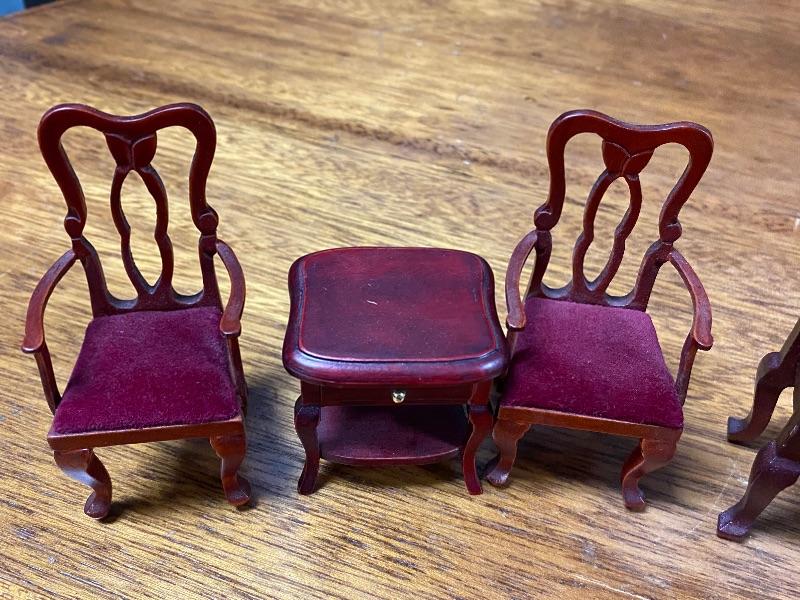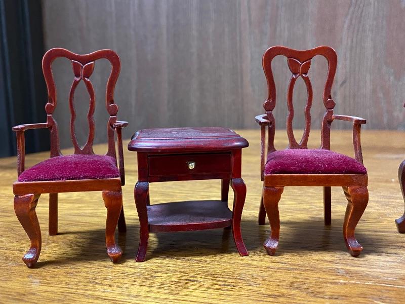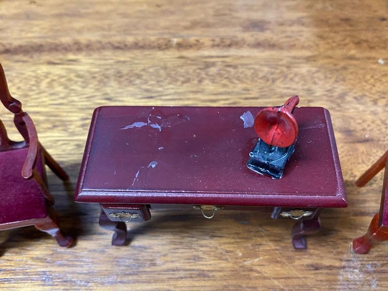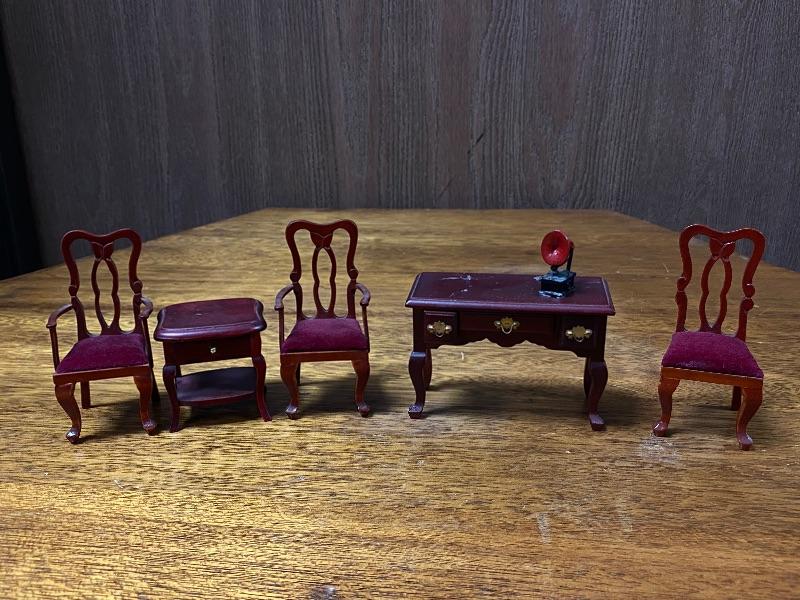 Dollhouse miniature lot. Includes 2 arm chairs and a matching armless chair, an end table, and an entryway table. The tables are wood with drawers. The record player on the entry table is glued in place. Chairs are plastic. Previously used.