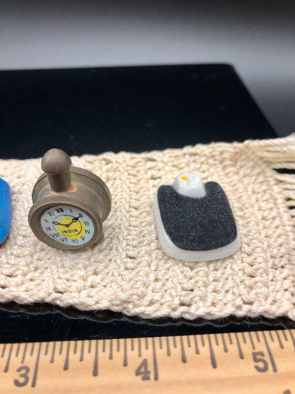 Dollhouse miniatures bathroom accessories. Everything pictured included. The clock is brass and heavy for its size. The toothpaste has a label that needs to be reattached. Previously displayed.