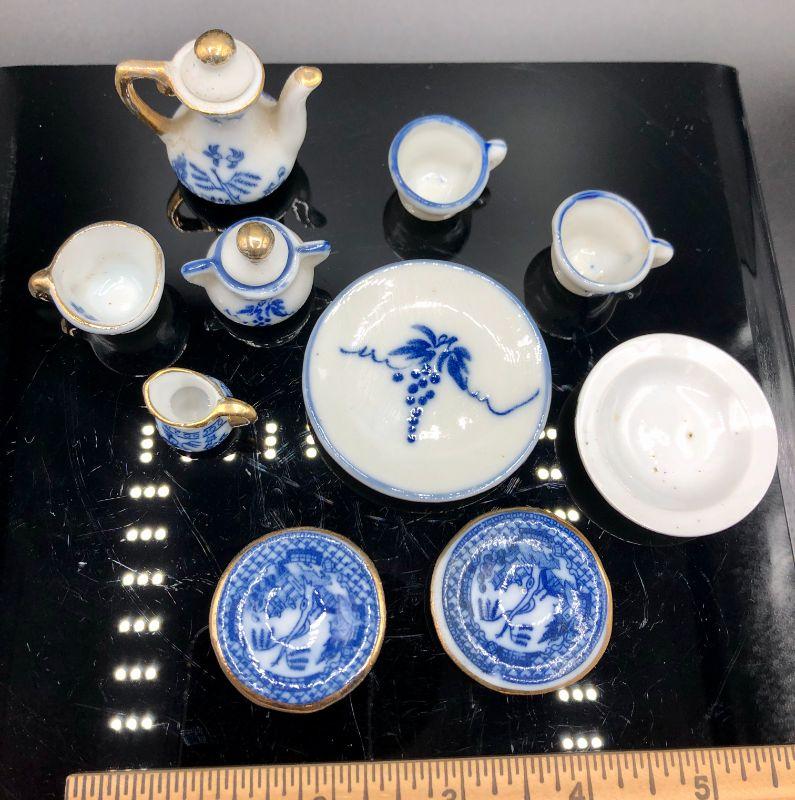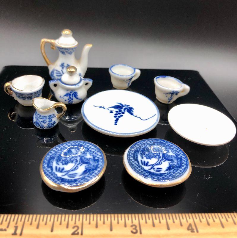 Dollhouse Miniatures Blue & White Tea Set and Dishes. Everything seen in the pictures included. Good Previously Displayed Condition.