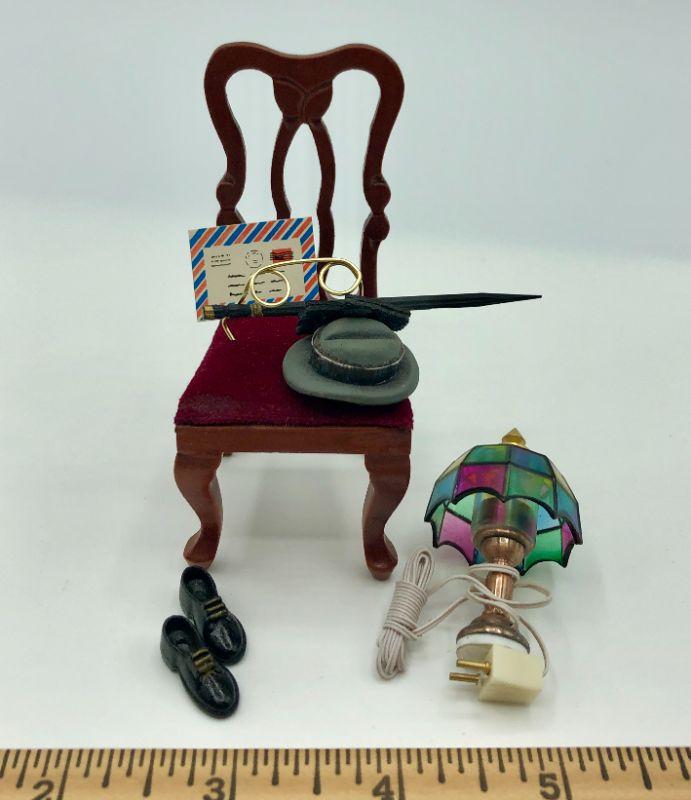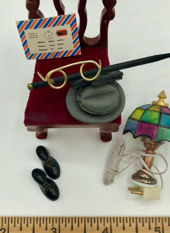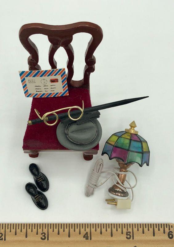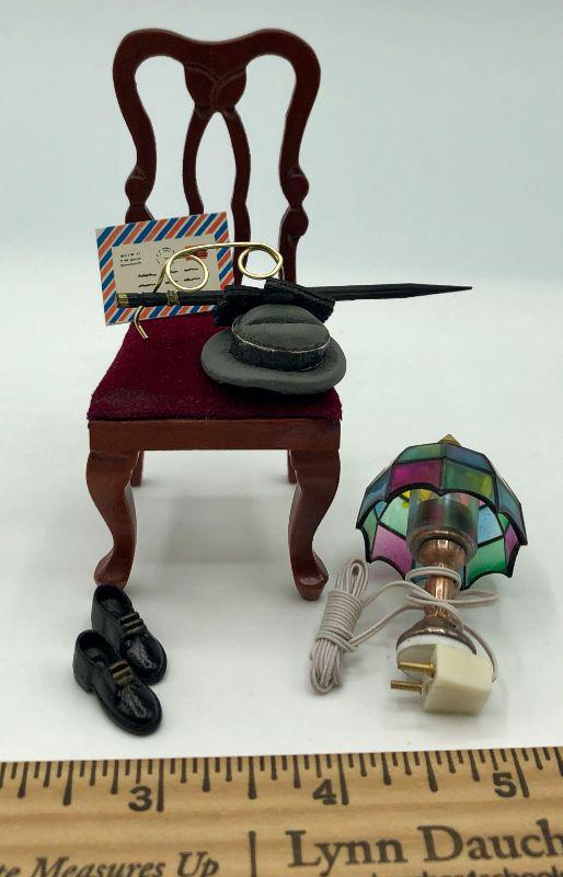 Dollhouse Miniatures Chair Accessories and an electric Tiffany Lamp - Chair, man's hat with cane, spectacles, Stained Glass Lamp, etc