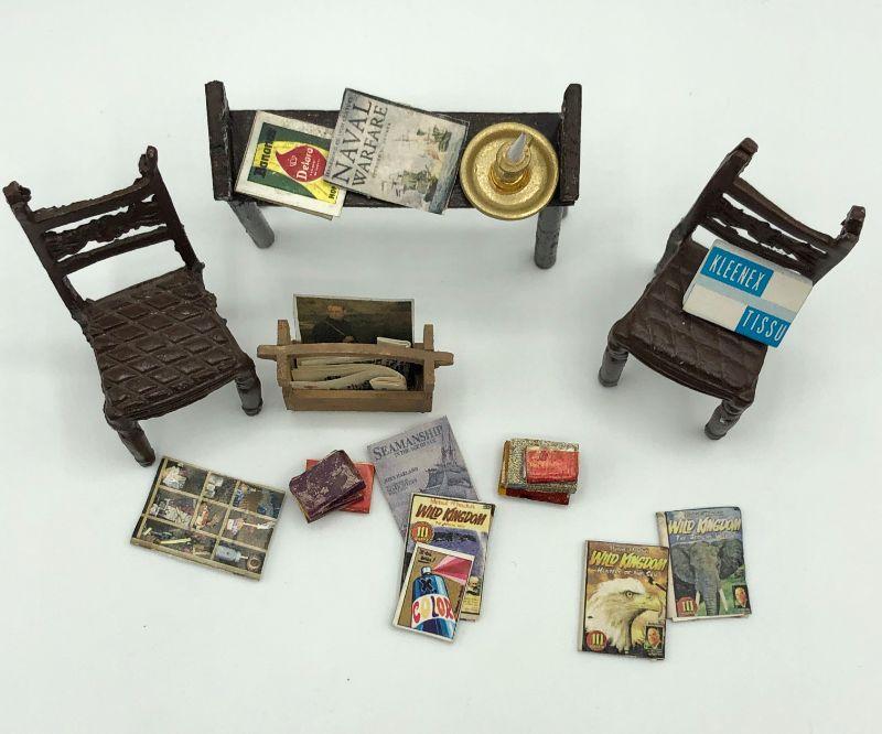 Dollhouse Miniatures Chairs, Side Table, Reading Material Lot  - chairs, books, library table, candlestick, magazine, Kleenex