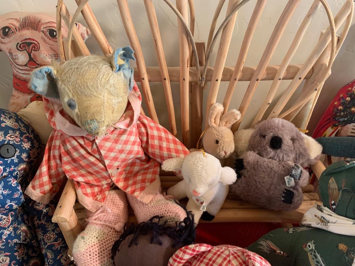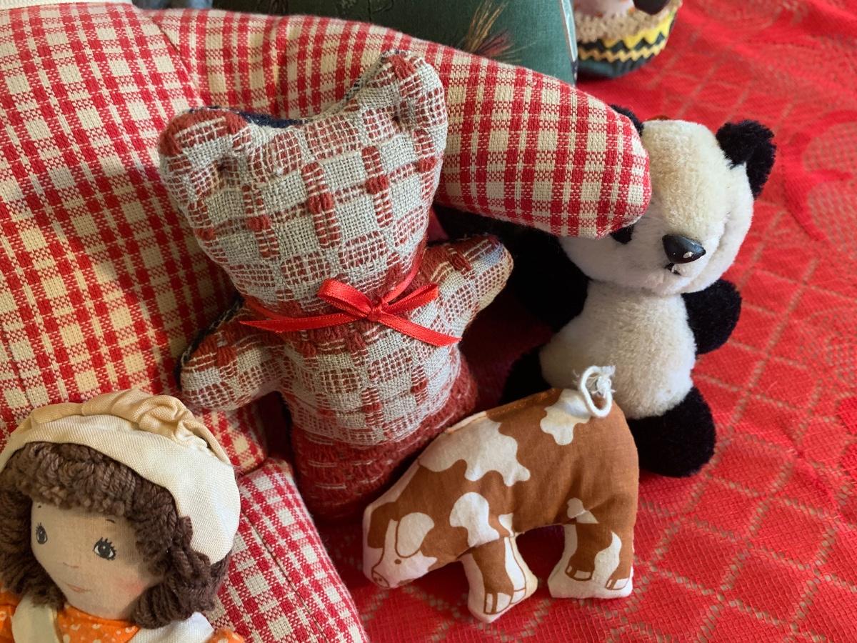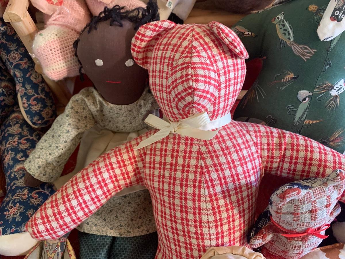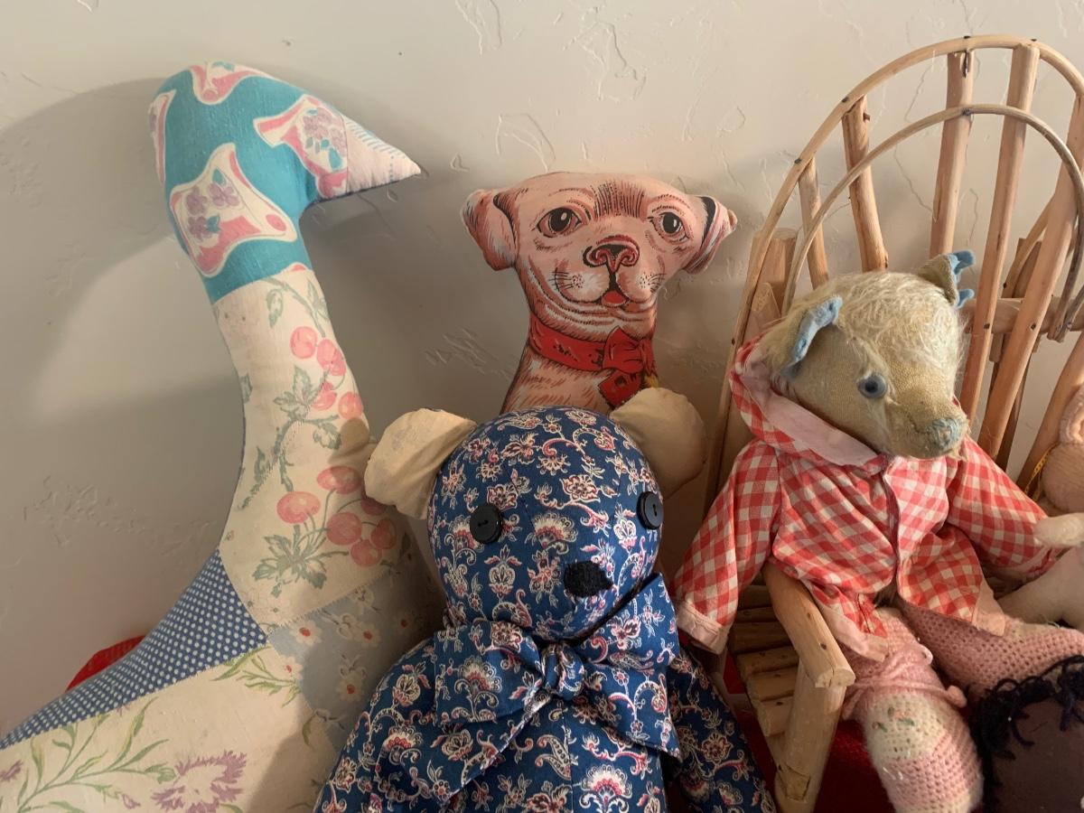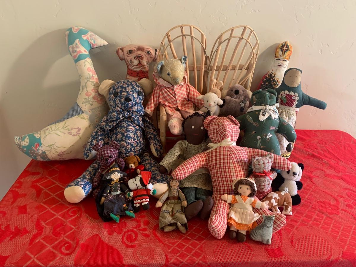 An assortment of dolls including some vintage dolls. There are small mohair animals, handmaid fabric dolls and a larger antique mohair bear that has become bare in areas.