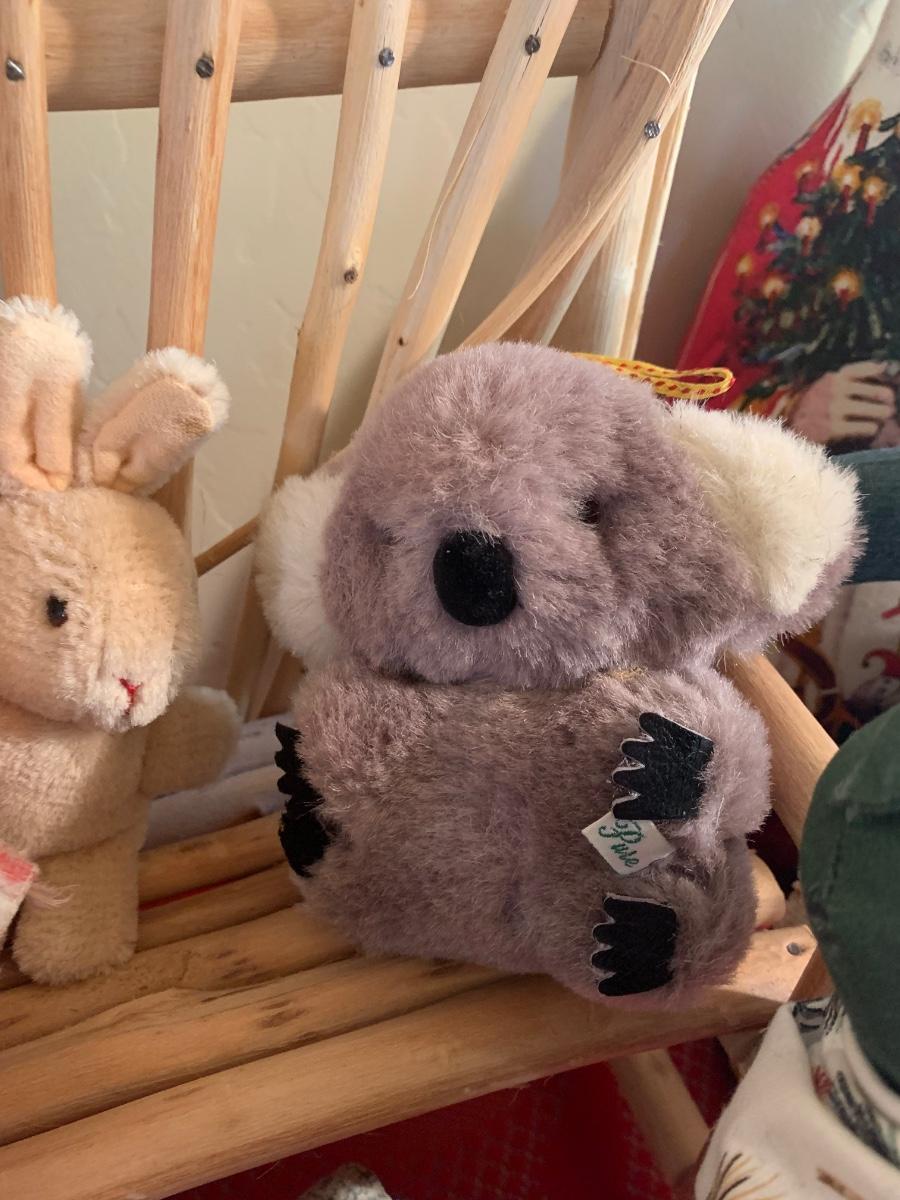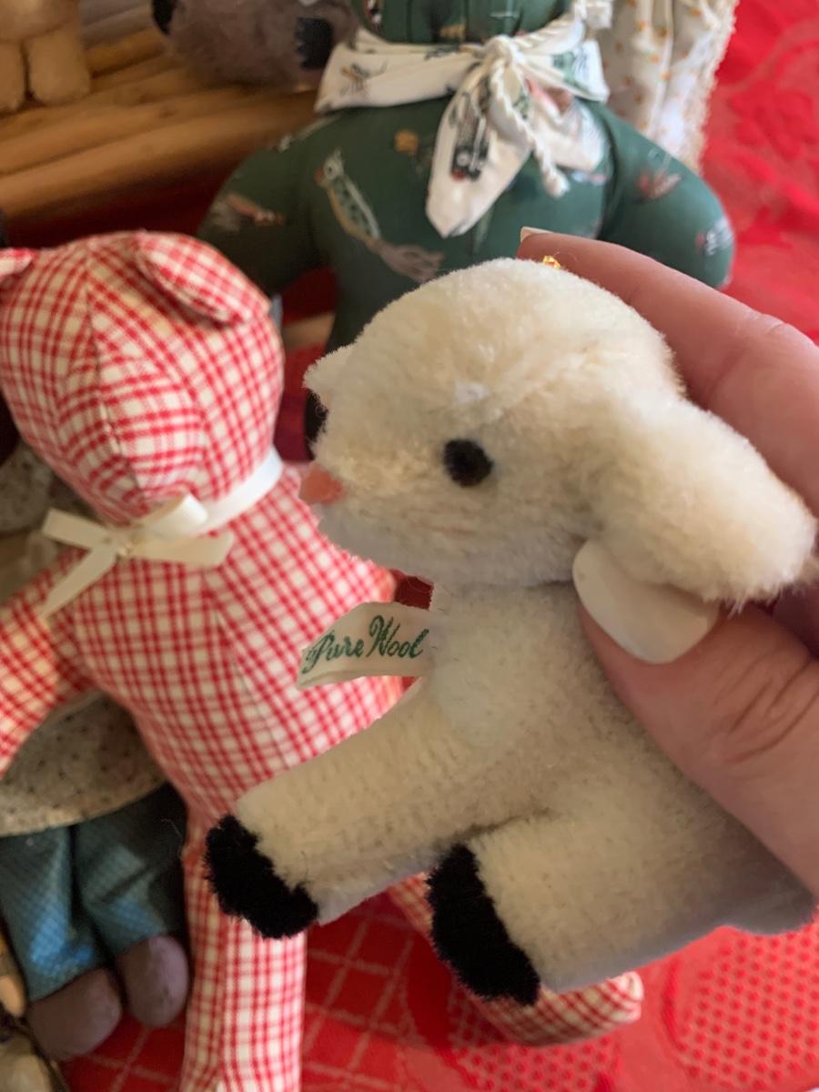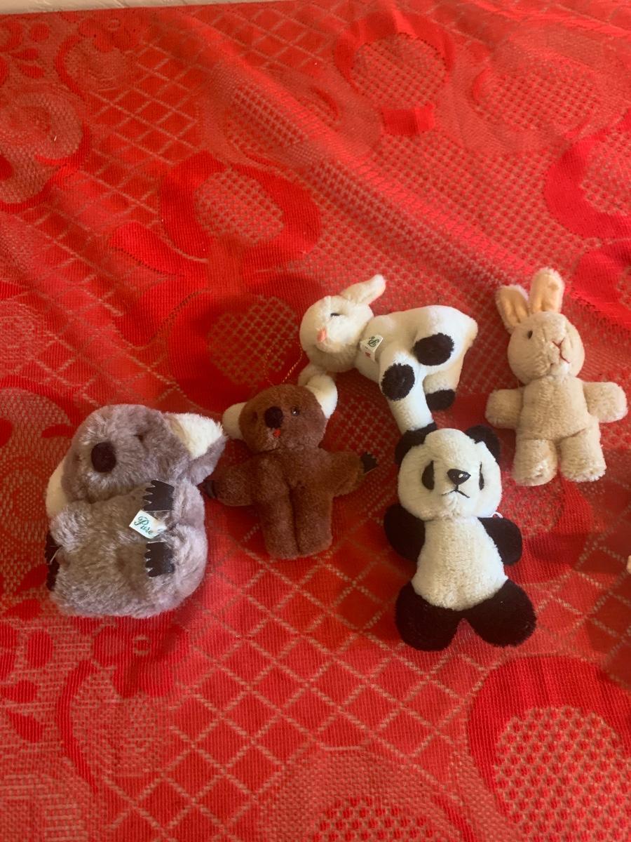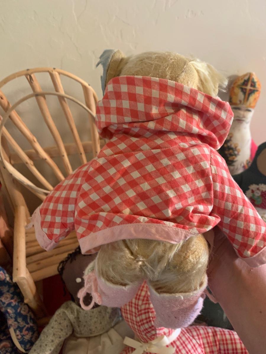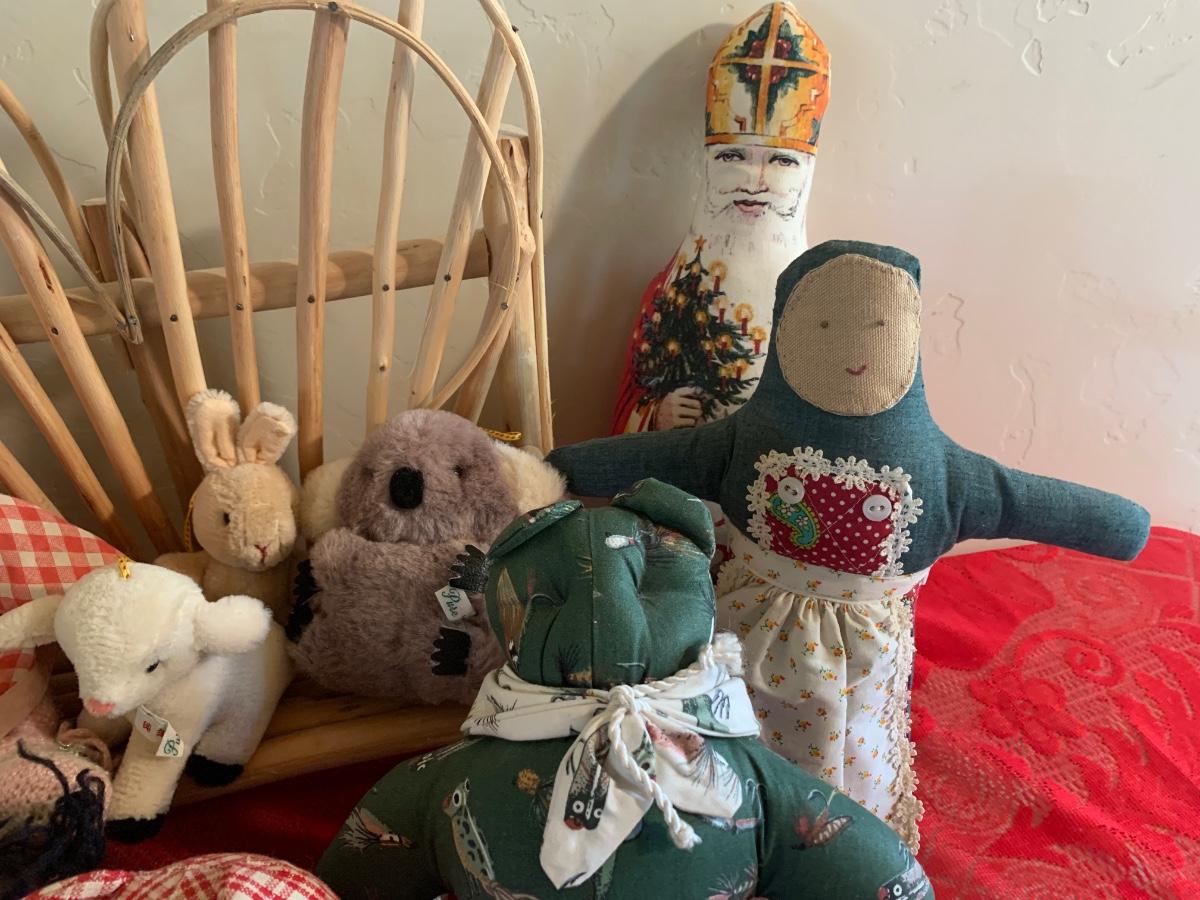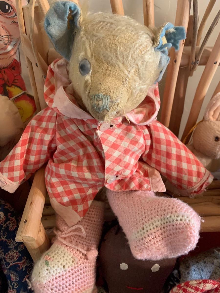 An assortment of dolls including some vintage dolls. There are small mohair animals, handmaid fabric dolls and a larger antique mohair bear that has become bare in areas.