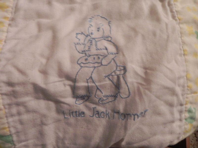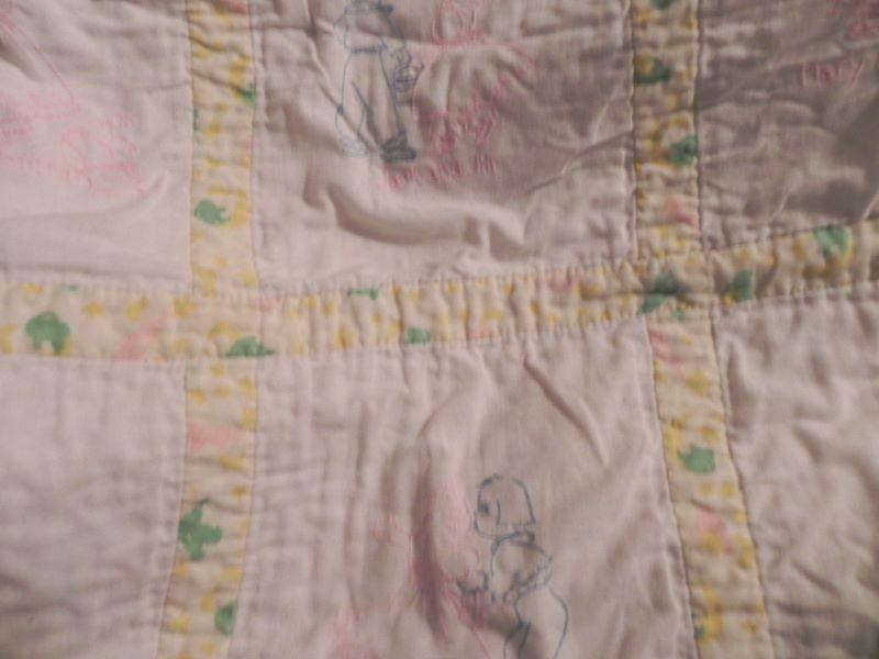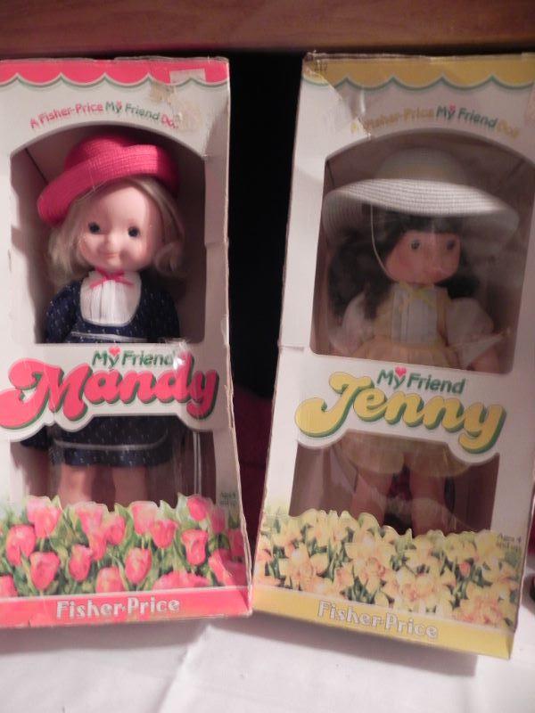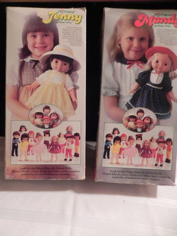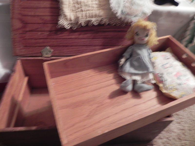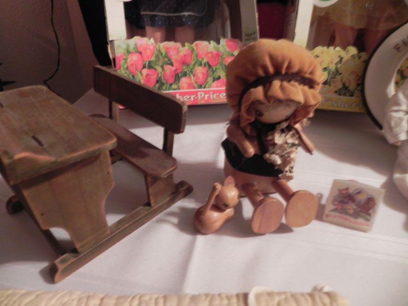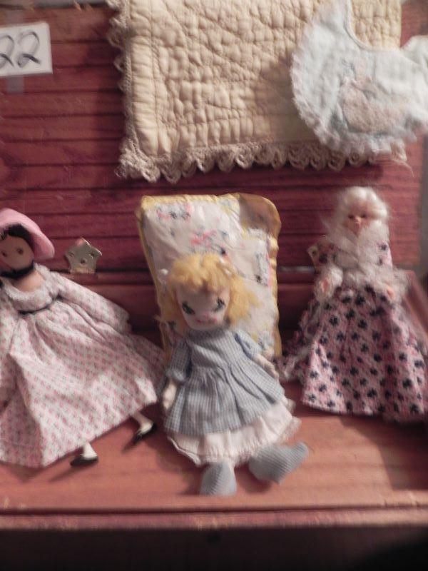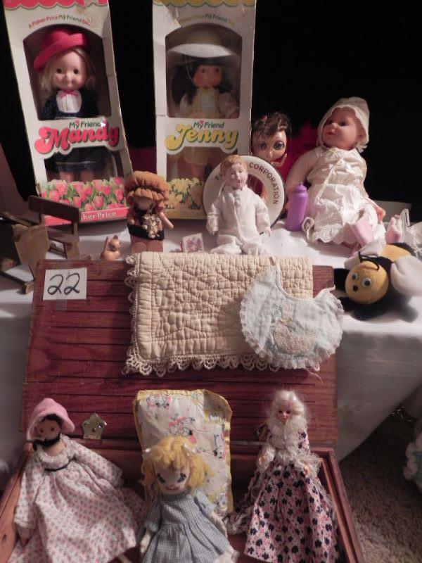Mandy & Jenny 10" tall, Music box wood doll by Schmid, wood doll box holds doll items under the tray where doll sleeps 19"Wx91/2""H, Hand sewn quilt with nursey rhymes stitched on, miscellaneous dolls and over 40 doll clothing and accessory items