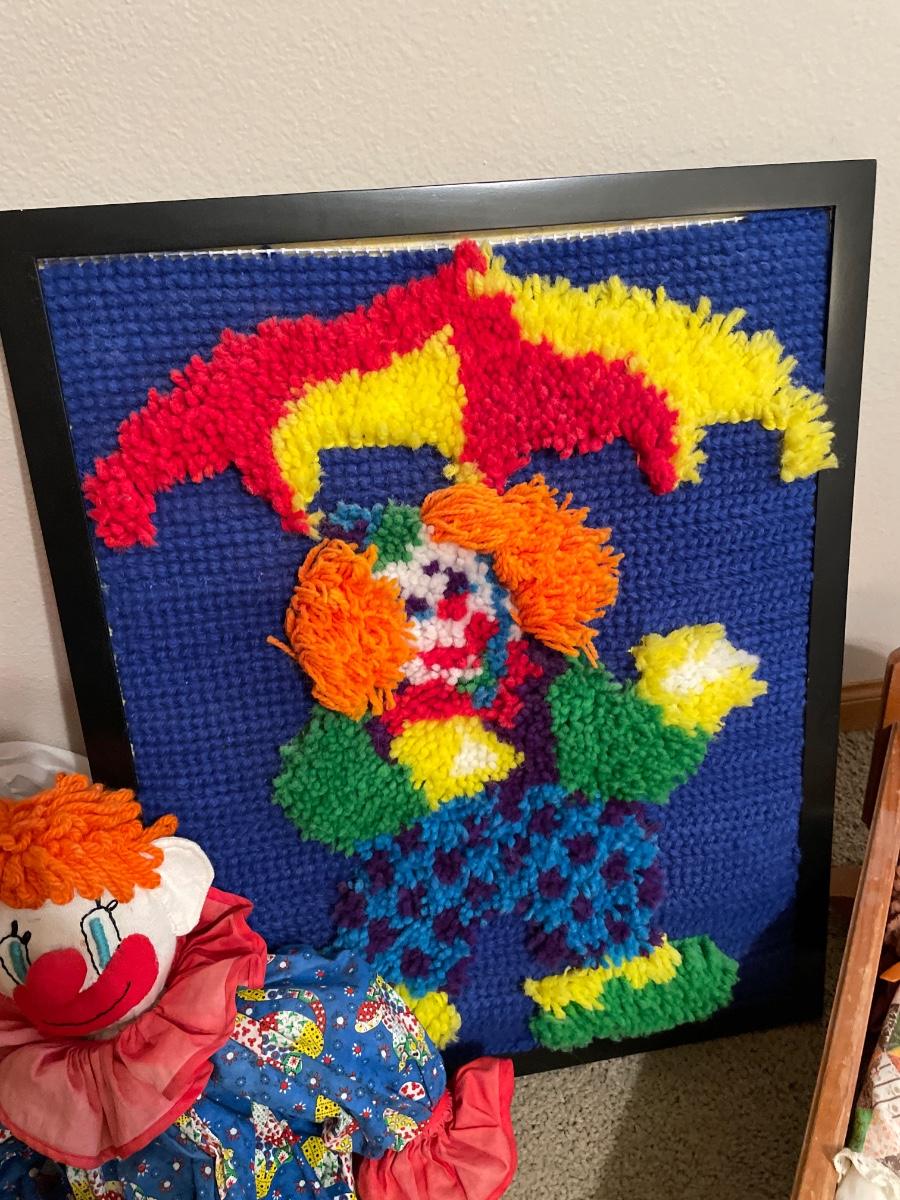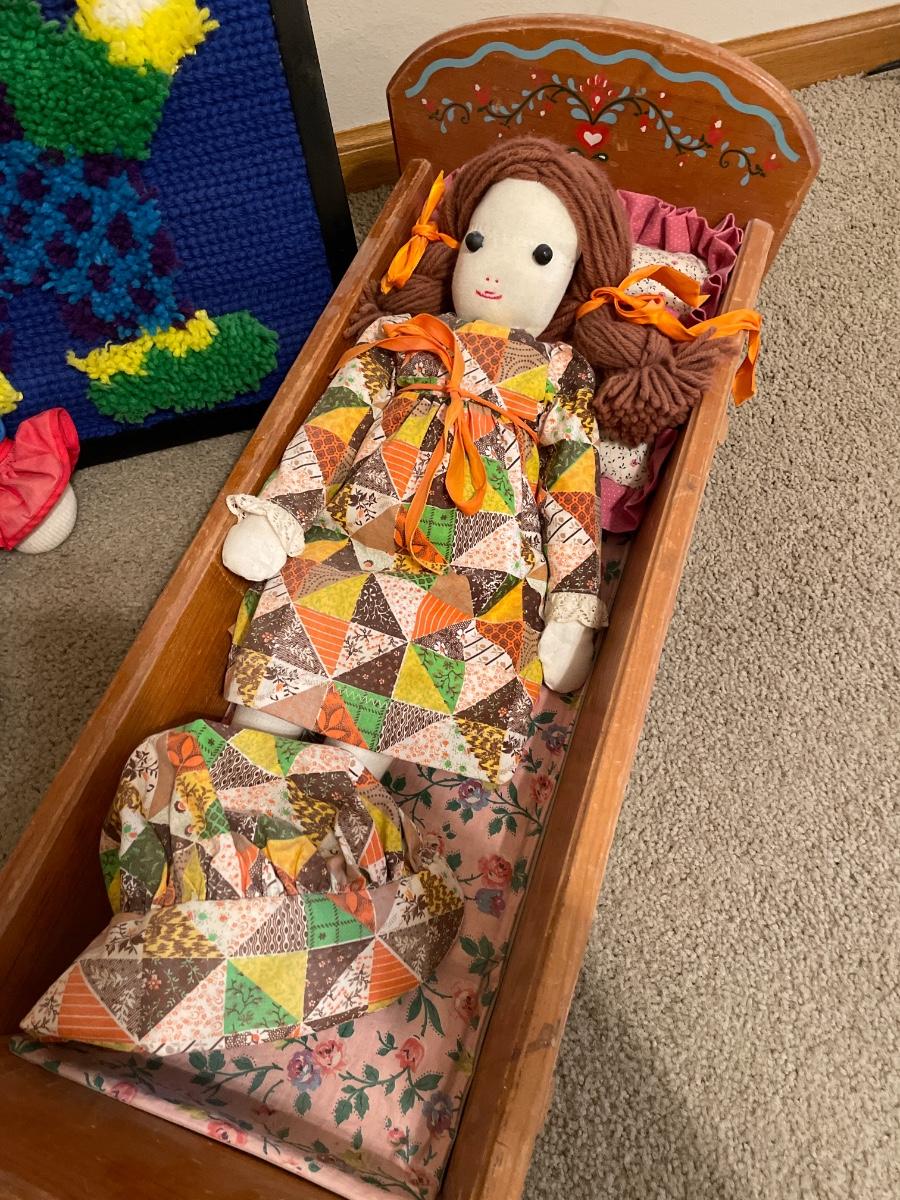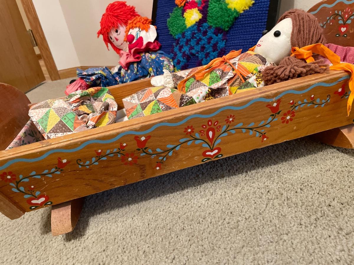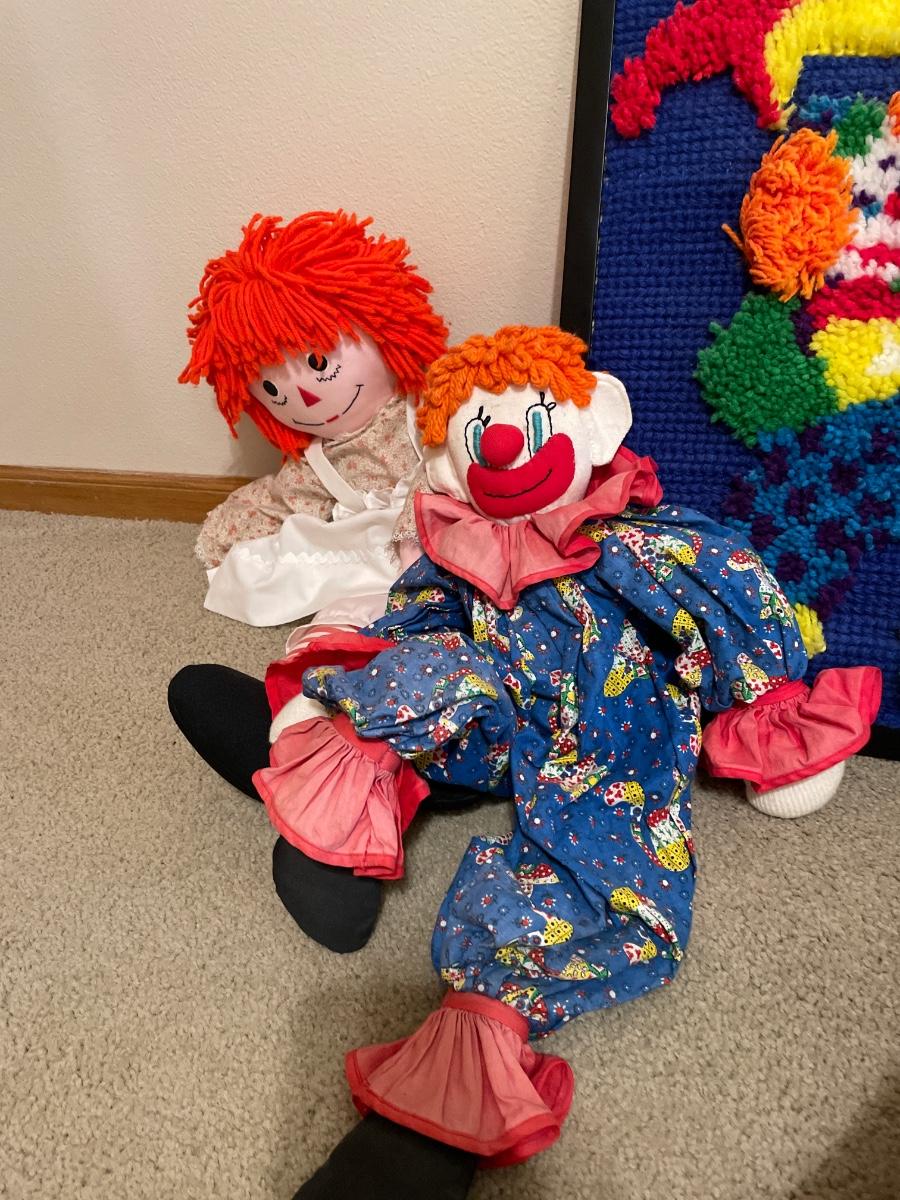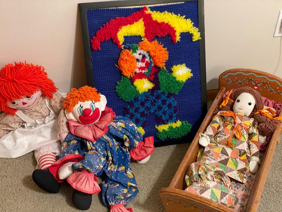 Dolls, clowns & doll crib