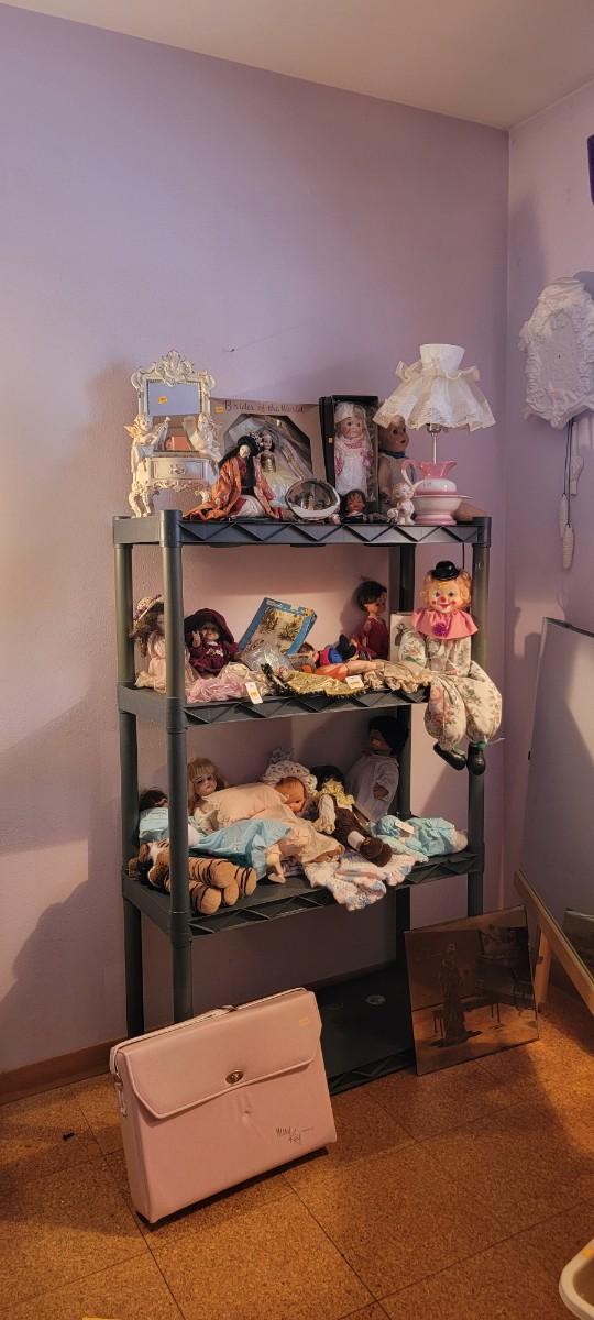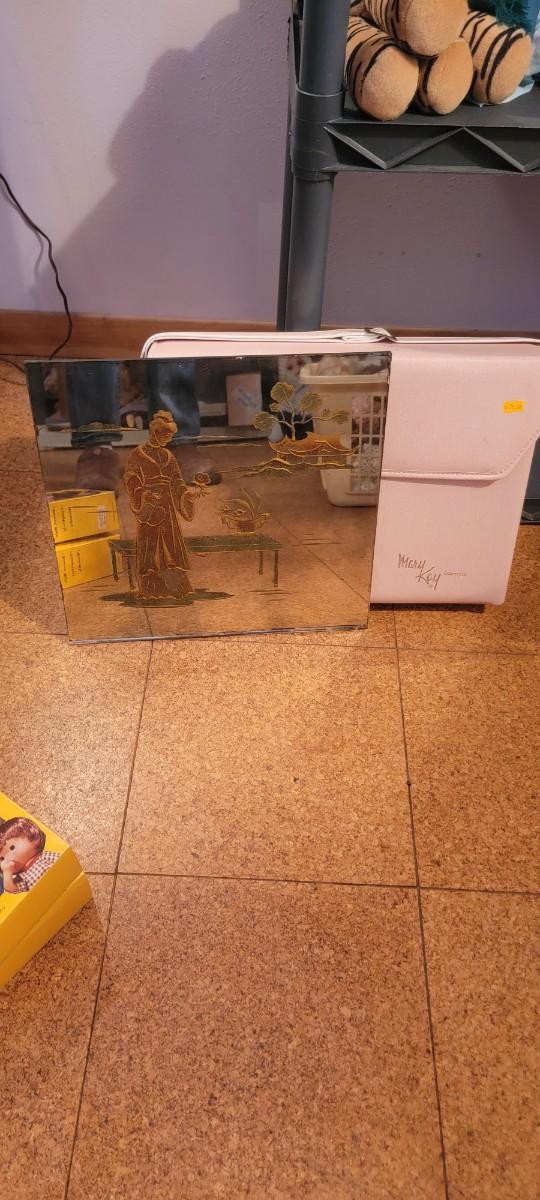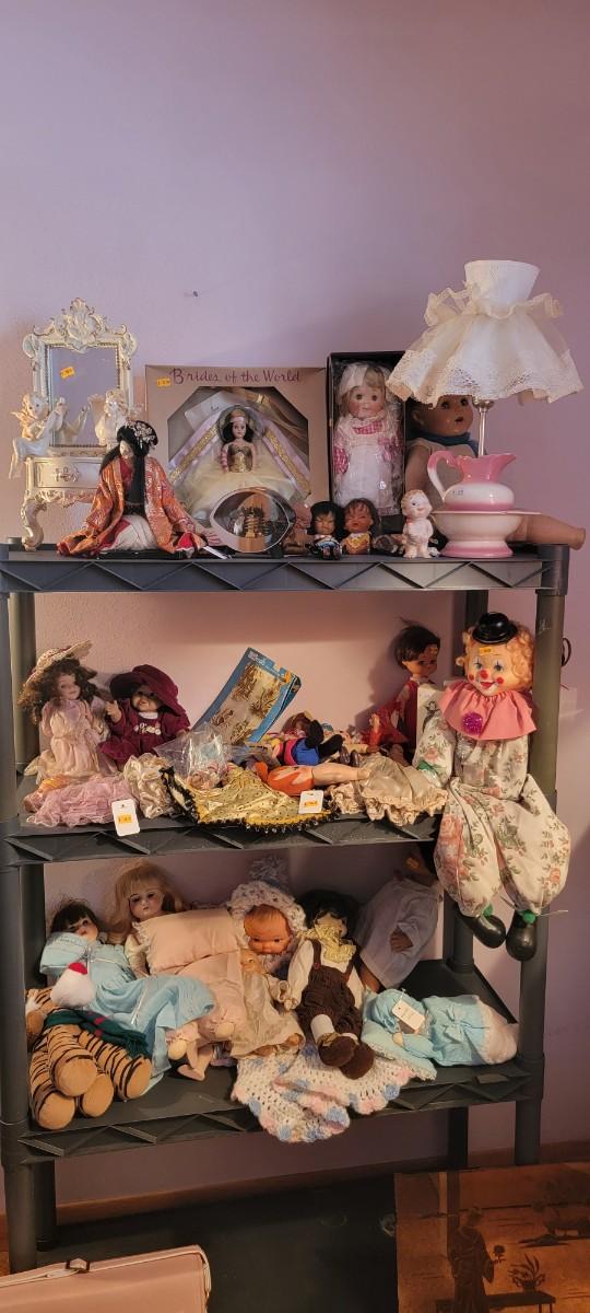 Assortment of dolls, jewelry box with cherubs. Mary Kay case and artist signed mirror. Shelf excluded.