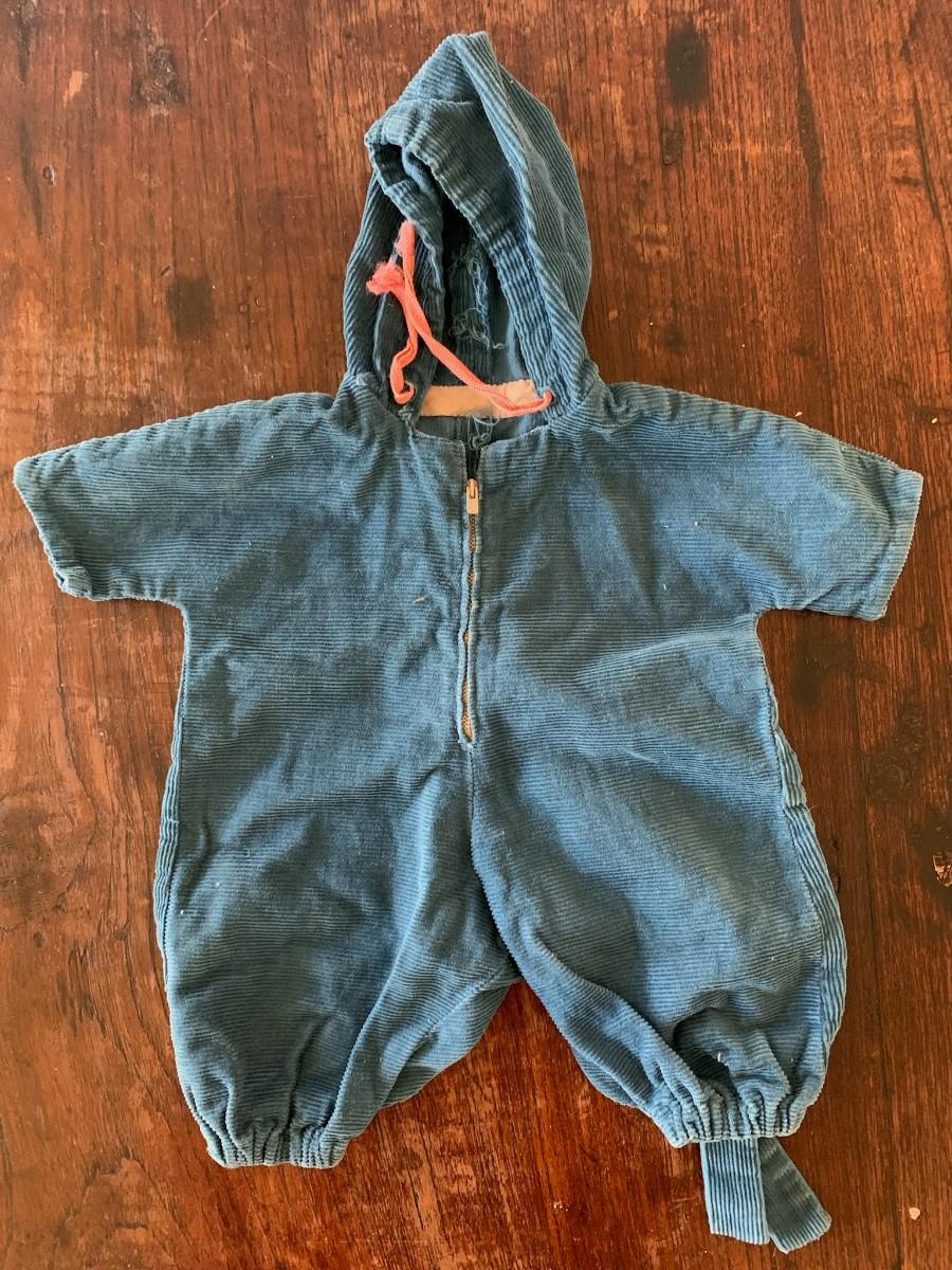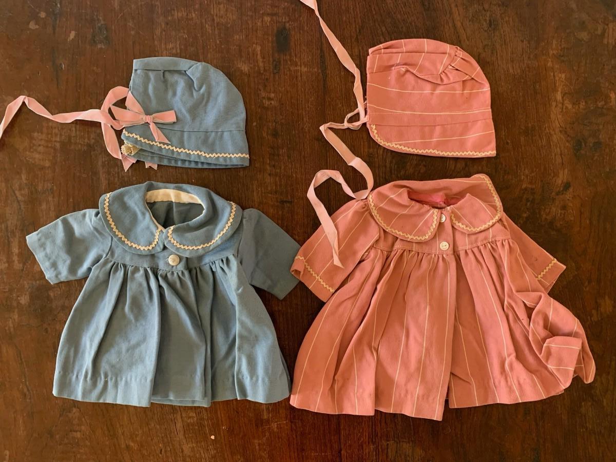 Hand-crocheted peachy pink sweater, hat and booties; one light blue and one pink dress with a Peter Pan collars and matching bonnets; hooded one-piece; striped cotton overalls.