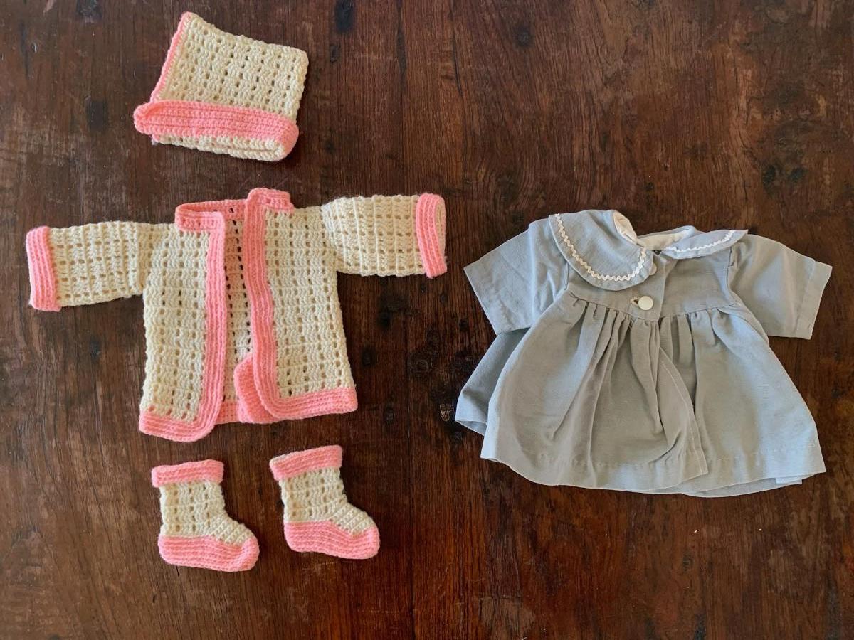 Lot of Vintage Doll Clothes, Medium, with Hand-crocheted Sweater Set 1932