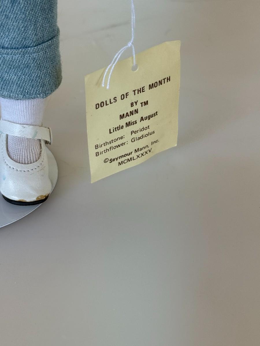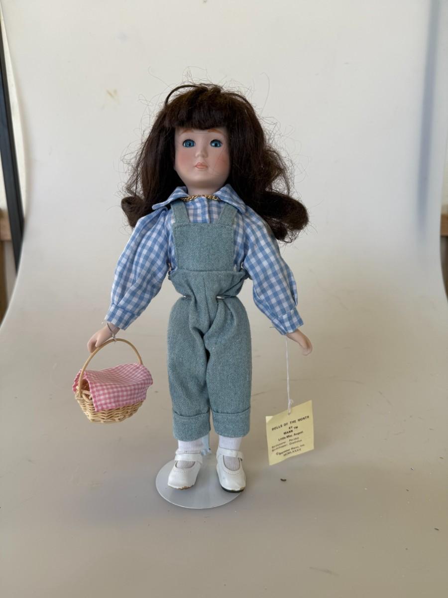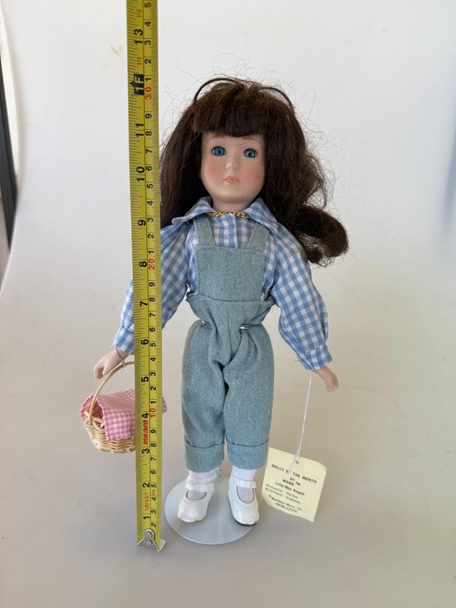 Porcelain collector's doll representing July. Dressed in denim overalls and gingham blouse, holding a picnic basket. Comes with original tag.