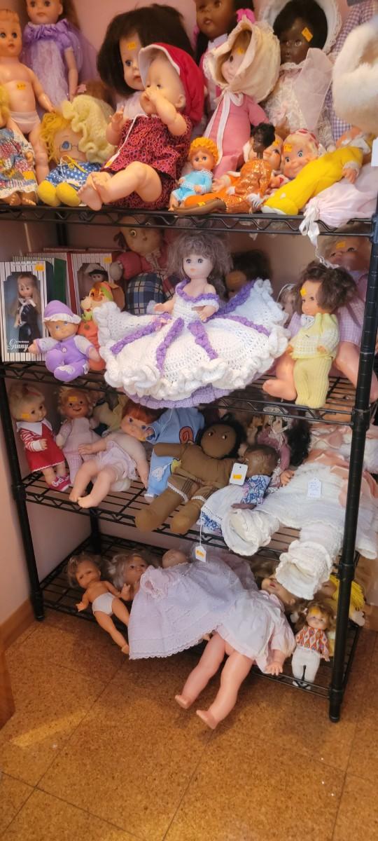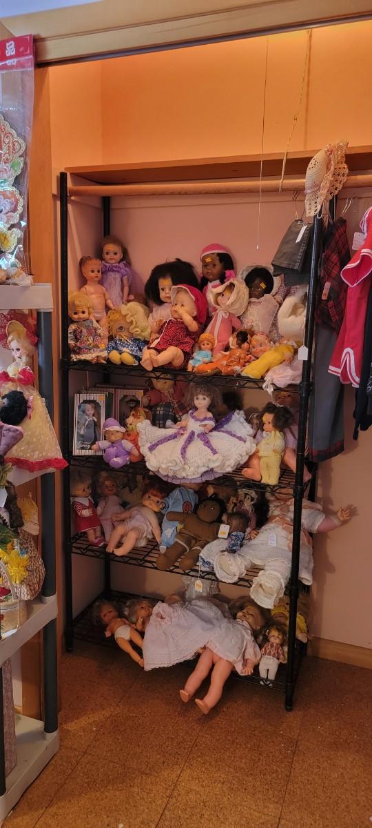 A large assortment of dolls covering four shelves. Some boxes. Shelf unit excluded