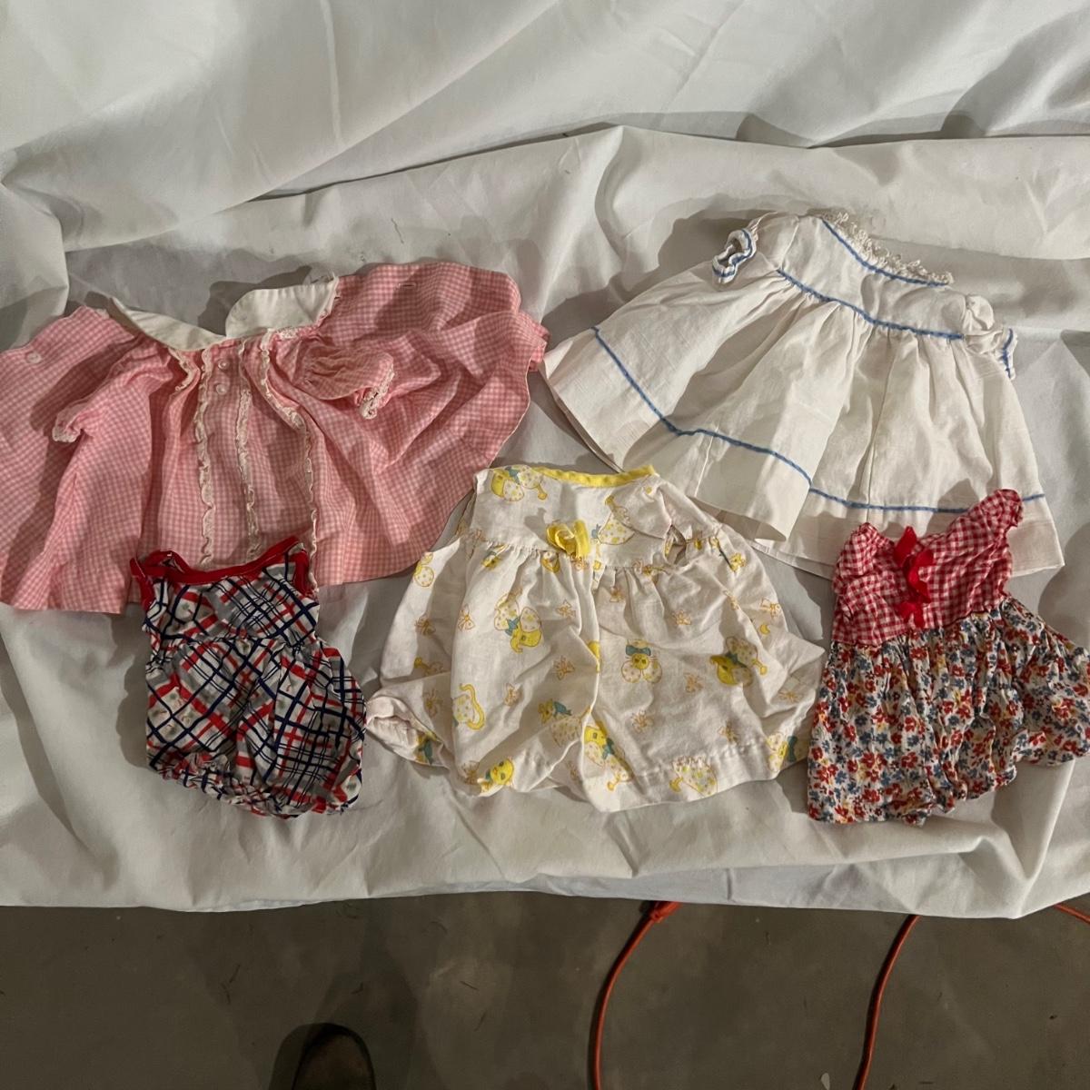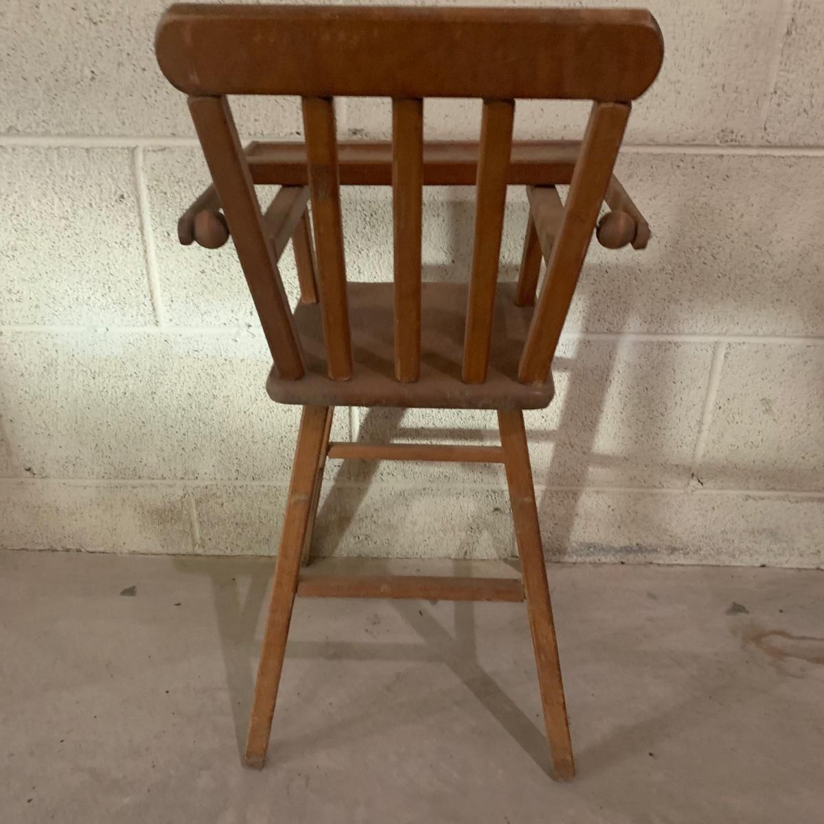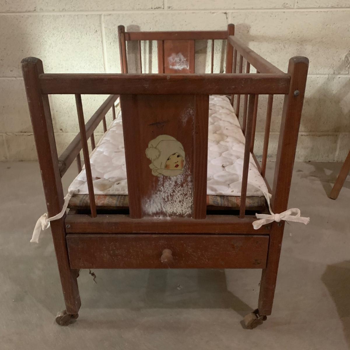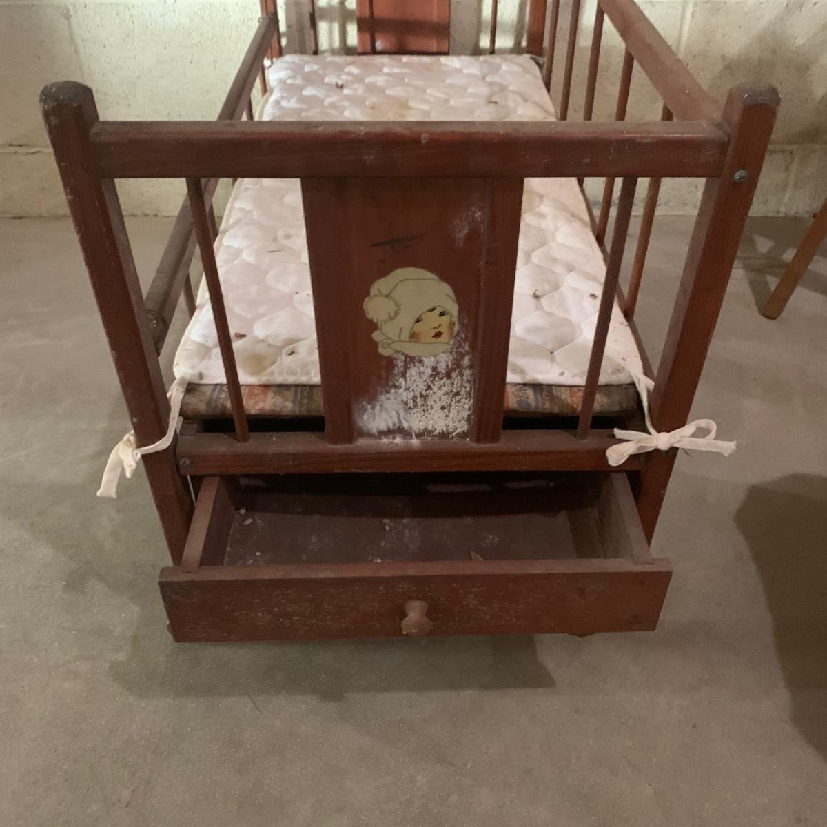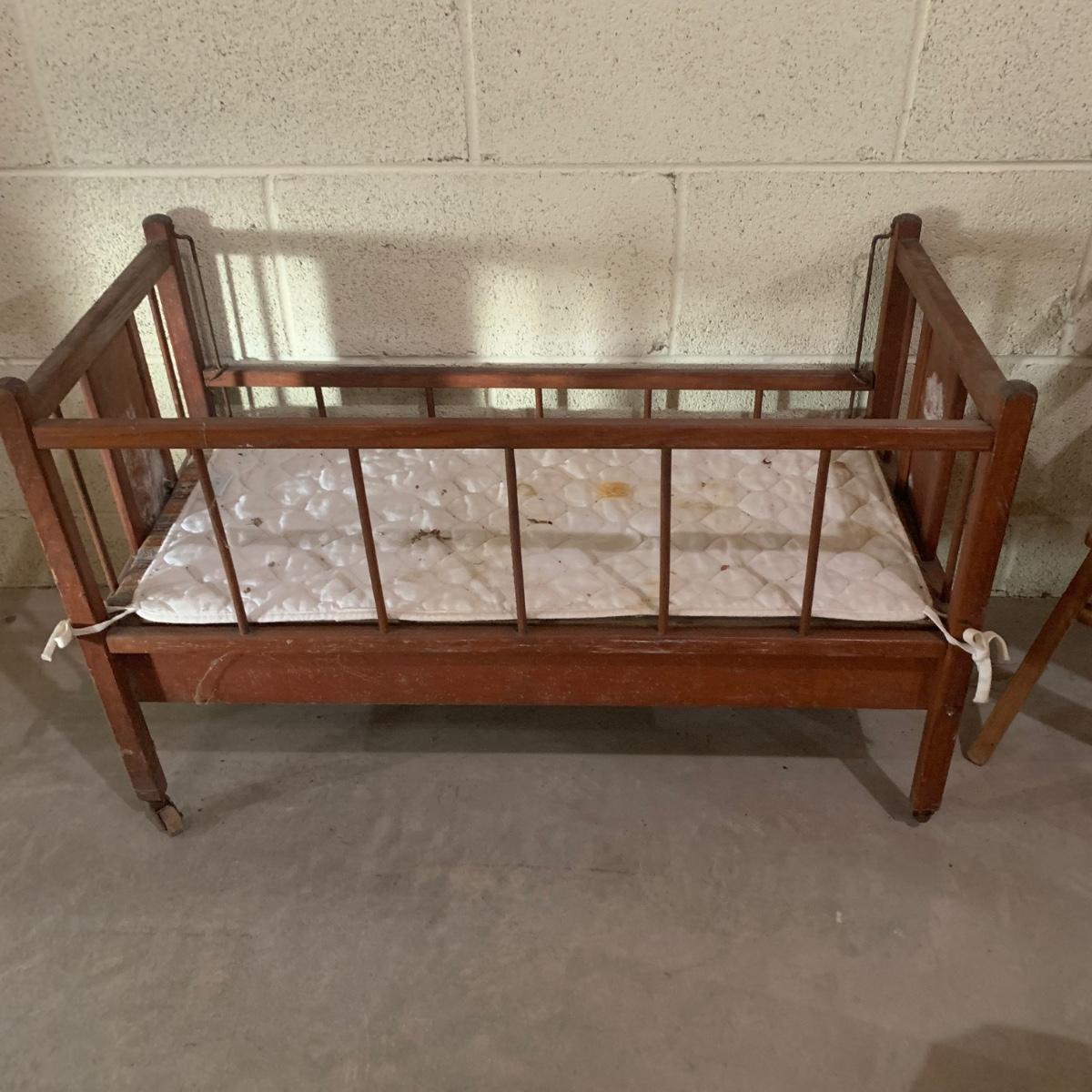 This lot includes doll-sized highchair, crib, clothes, and blankets. Crib measures 30”L x 14.5”W x 19.5”H and the highchair measures 12”L x 12”W x 26”H. The crib has two drawers for storage and the high chair has a functioning tray. These items appear to be in good condition, but could use a little cleaning due to being stored in a basement. No apparent manufacturer for the dial clothing or label identified. Perfect for American Girl dolls! Local pick-up only.